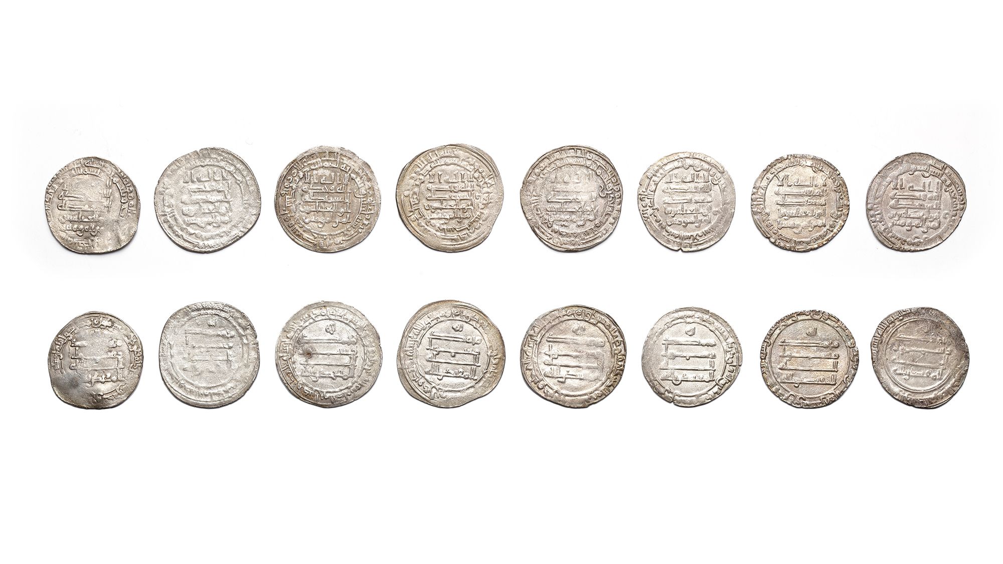 Eight silver dirhams, struck in different cities across during the reign of al-Muqtadir. A silver dirham, Surra manraa mint, dated 297AH/ 909AD, 2.8g, 24mm. A silver dirham, Madinat al-Salam mint, dated 298AH/ 910AD, 2.8g, 23mm. A silver dirhams, Madinat al-Salam mint, dated 299AH/ 911AD, 2.6g, 23mm. A silver dirham, Shiraz mint, dated 300AH/ 912AD, 3.2g, 25mm. A silver dirham, Madinat al-Salam mint, dated 301AH/ 913AD, 3.5g, 24mm. A silver dirham, Madinat al-Salam mint, dated 302AH/ 914AD, 2.8g, 25mm. A silver dirham, Mah al-Kufa mint, dated 303AH/ 915AD, 2.9g, 23mm. A silver dirham, Wasit mint, dated 304AH/ 916AD, 3.1g, 25mm.