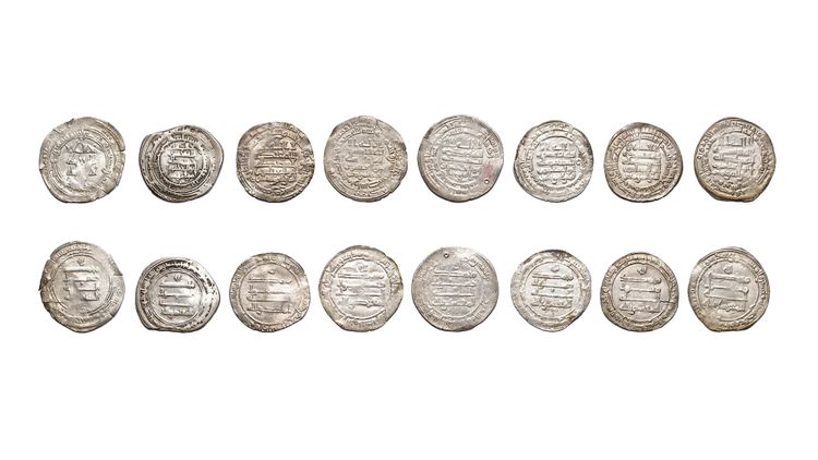 Eight silver dirhams, struck in different cities across during the reign of al-Muqtadir. A silver dirham, Fars mint, dated 298AH/ 910AD, 2.7g, 27mm. A silver dirhams, Fars mint, dated 299AH/ 911AD, 4.4g, 25mm. A silver dirham, Madinat al-Salam mint, dated 300AH/ 912AD, 2.9g, 24mm. A silver dirham, Surra manraa mint, dated 301AH/ 913AD, 2.9g, 24mm. A silver dirham, Wasit mint, dated 302AH/ 914AD, 2.0g, 26mm. A silver dirham, Wasit mint, dated 303AH/ 915AD, 2.8g, 25mm. A silver dirham, Madinat al-Salam mint, dated 304AH/ 916AD, 2.1g, 24mm. A silver dirham, Shiraz mint, dated 306AH/ 918AD, 3.2g, 26mm.