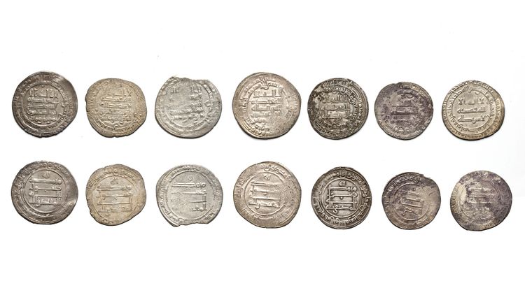 Three silver dirhams, struck in different cities across during the reign of al-Muktafi. A silver dirham, Wasit mint, dated 289AH/ 918AD, 2.9g, 25mm. A silver dirham, al-Ahwaz mint, dated 293AH/ 920AD, 2.8g, 23mm. A silver dirhams, Surra manraa mint, dated 294AH/ 921AD, 2.9g, 24mm. Four silver dirhams, struck in different cities across during the reign of al-Muqtadir. A silver dirham, Wasit mint, dated 300AH/ 923AD, 4.1g, 26mm. A silver dirham, Shiraz mint, dated 301AH/ 925AD, 3.5g, 25mm. A silver dirham, Dimishq mint, dated 311AH/ 927AD, 2.4g, 23mm. A silver dirham, Madinat al-Salam mint, dated 317AH/ 929AD, 3.8g, 25mm.