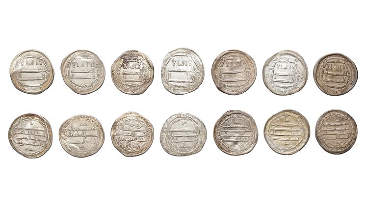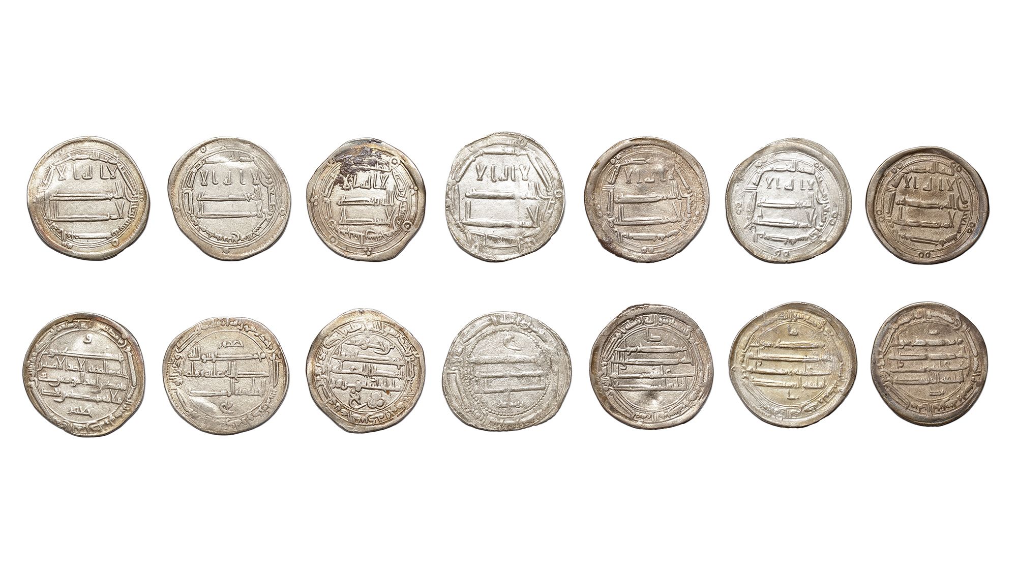 Seven silver dirhams, struck in different cities across various years during the reign of Harun al-Rashid. A silver dirham, (Mubarak) al-Muhammadiya mint, dated 170AH/ 786AD, 2.8g, 24mm. A silver dirham, (Mubarak) al-Muhammadiya mint, dated 171AH/ 787AD, 2.6g, 24mm. A silver dirham, (Da'ud) al-Muhammadiya mint, dated 172AH/ 788AD, 2.9g, 24mm. A silver dirham, al-Abbasiya mint, dated 173AH/ 789AD, 2.6g, 24mm. A silver dirham, Sijistan mint, dated 175AH/ 791AD, 2.8g, 23mm. A silver dirham, Madinat Zaranj mint, dated 179AH/ 795AD, 2.9g, 24mm. A silver dirham, (in the name of governor Muhammed bin Yahya) al-Muhammadiya mint, dated 180AH/ 796AD, 2.7g, 24mm.
