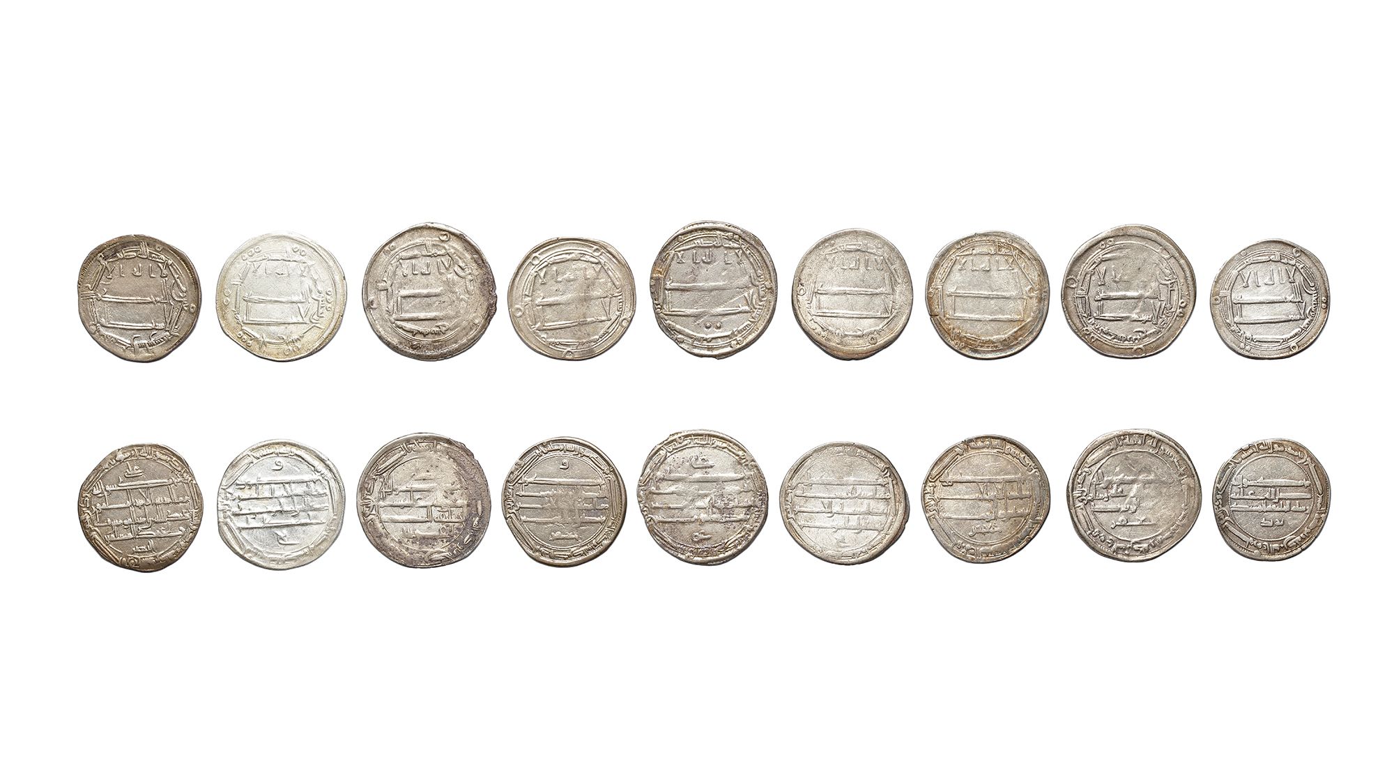 Nine silver dirhams, struck in different cities across various years during the reign of Harun al-Rashid. A silver dirham, (Yazid) al-Muhammadiya mint, dated 175AH/ 791AD, 2.7g, 22mm. A silver dirham, Madinat Zaranj mint, dated 181AH/ 797AD, 2.8g, 25mm. A silver dirham, ( Ja'far)al-Muhammadiya mint, dated 183AH/ 799AD, 2.6g, 23mm. A silver dirham, ( with the heir al-Amin) Balkh mint, dated 184AH/ 800AD, 2.9g, 23mm. A silver dirham, Marw mint, dated 185AH/ 801AD, 2.7g, 25mm. A silver dirham, al-Muhammadiya mint, dated 186AH/ 802AD, 2.8g, 23mm. A silver dirham, Balkh mint, dated 188AH/ 804AD, 2.7g, 24mm. A silver dirham, (al-Qusi)Madinat Zaranj mint, dated 189AH/ 805AD, 2.9g, 25mm. A silver dirham, Ma'den al-Shash mint, dated 190AH/ 806AD, 2.8g, 24mm.