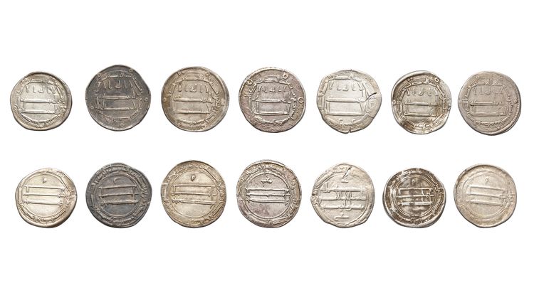 Seven silver dirhams, struck in different cities across various years during the reign of Harun al-Rashid. A silver dirham, Madinat al-Salam mint, dated 190AH/ 806AD, 2.9g, 20mm. A silver dirham, al-Rafiqa mint, dated 190AH/ 806AD, 2.9g, 21mm. A silver dirham, al-Muhammadiya mint, dated 191AH/ 807AD, 2.8g, 22mm. A silver dirham, Ma'den Bajunais mint, dated 191AH/ 807AD, 2.5g, 21mm. A silver dirham, al-Muhammadiya mint, dated 192AH/ 808AD, 2.9g, 21mm. A silver dirham, Samarqand mint, dated 193AH/ 809AD, 2.9g, 22mm. A silver dirham, Tabaristan mint, dated 193AH/ 809AD, 2.9g, 20mm.