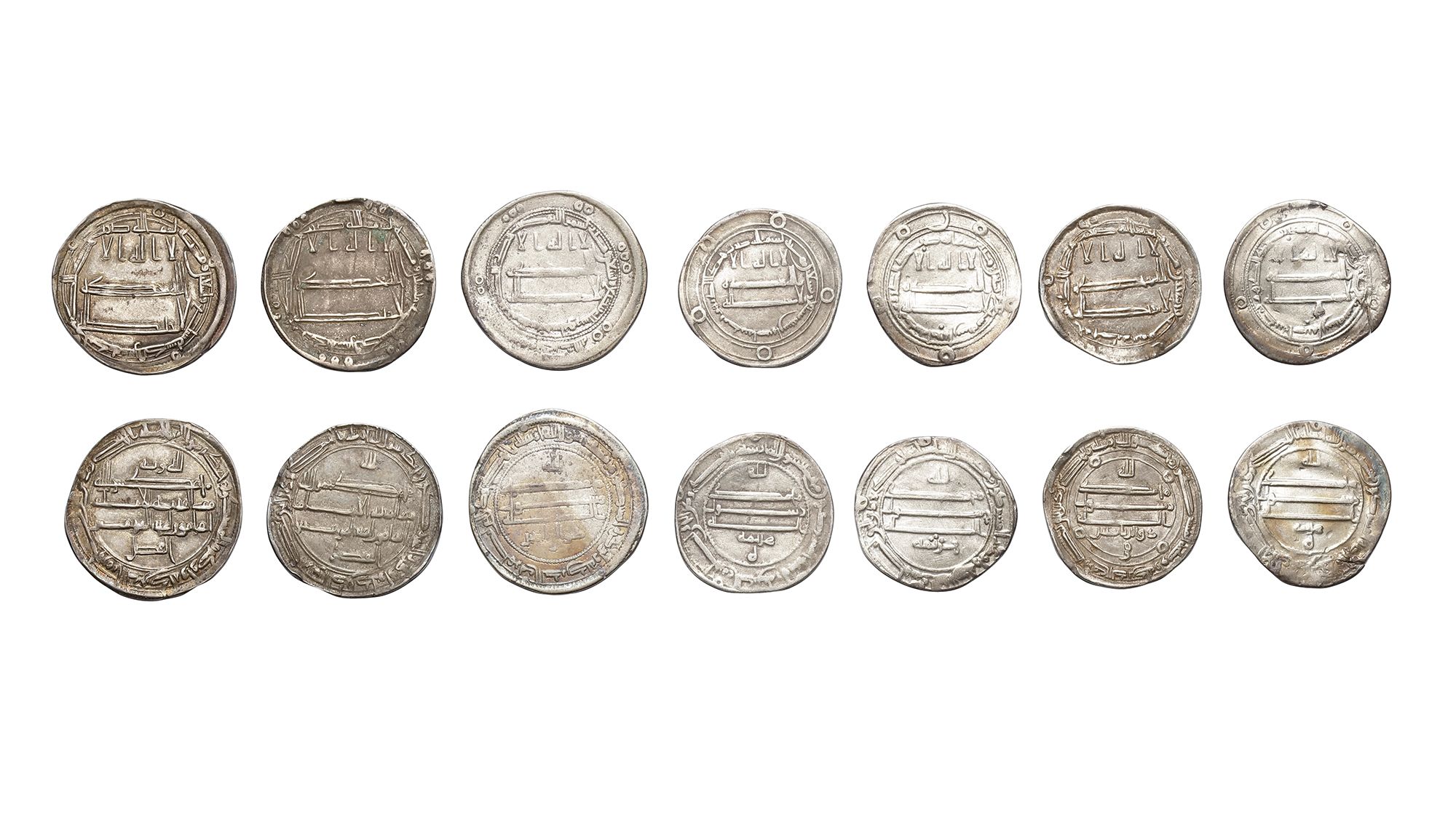Seven silver dirhams, struck in different cities across during the reign of al-Amin. A silver dirham, Madinat Isbahan mint, dated 197AH/ 812AD, 2.8g, 21mm. A silver dirham, al-Muhammadiyah mint, dated 197AH/ 812AD, 3.0g, 21mm. A silver dirham, Madinat Isbahan mint, dated 197AH/ 812AD, 2.8g, 21mm. A silver dirham, Samarqand mint, dated 197AH/ 812AD, 2.7g, 24mm. A silver dirham, Samarqand mint, dated 197AH/ 812AD, 2.7g, 23mm. A silver dirham, Nishapur mint, dated 197AH/ 812AD, 2.9g, 24mm. A silver dirham, Madinat Isbahan mint, dated 197AH/ 812AD, 2.9g, 23mm.
