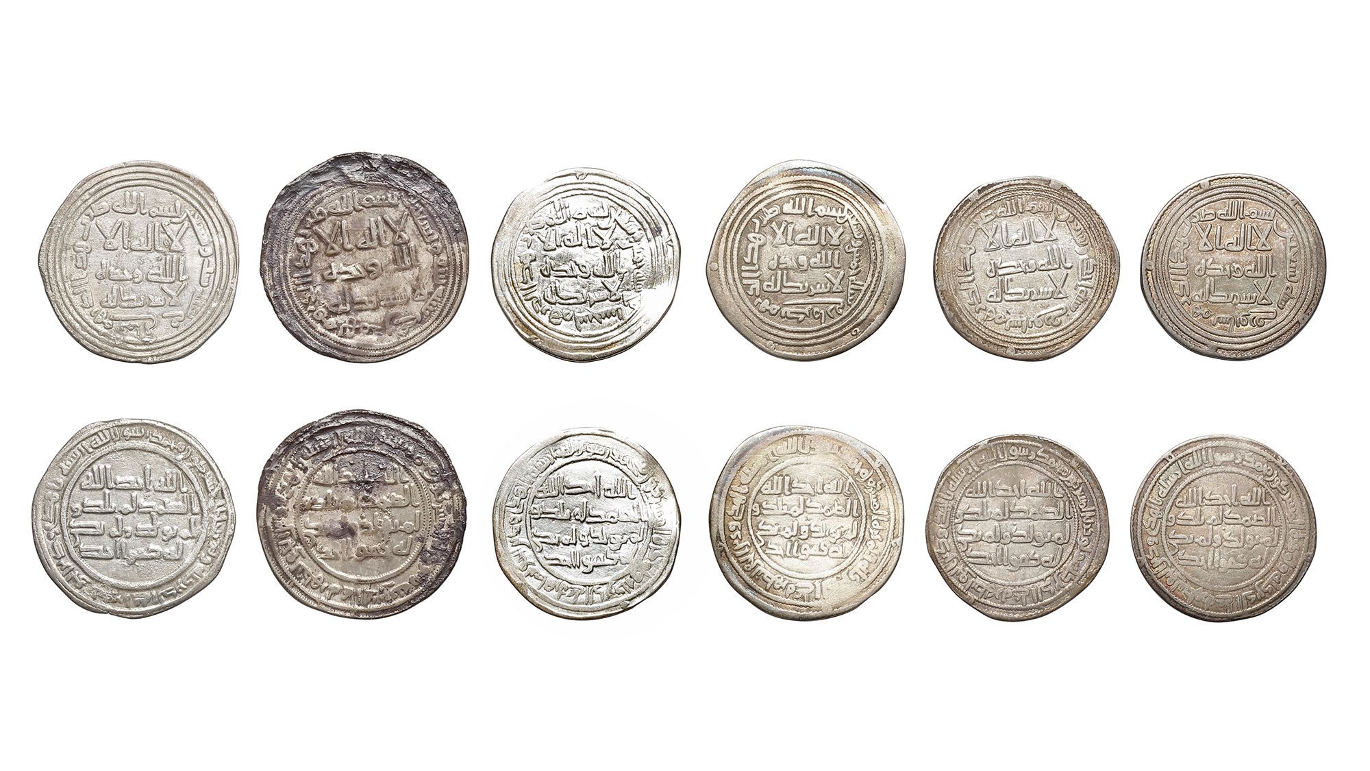Six silver dirhams, struck in different cities across various years. A silver dirham, Sabur mint, dated 90AH/ 709AD, 2.5g, 23mm. A silver dirham, Sabur mint, dated 91AH/ 710AD, 2.6g, 23mm. A silver dirham, Kirman mint, dated 95AH/ 714AD, 2.6g, 25mm. A silver dirham, Sijistan mint, dated 95AH/ 714AD, 2.5g, 23mm. A silver dirham, Hamdan mint, dated 96AH/ 715AD, 2.7g, 26mm. A silver dirham, Mahay mint, dated 96AH/ 715AD, 2.8g, 25mm.