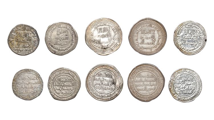 Five silver dirhams, struck in different cities across various years. A silver dirham, Dimishq mint, dated 102AH/ 720AD, 2.2g, 22mm. A silver dirham, Wasit mint, dated 103AH/ 721AD, 2.8g, 25mm. A silver dirham, Dimishq mint, dated 103AH/ 721AD, 2.7g, 25mm. A silver dirham,Ifriqiya mint, dated 103AH/ 721AD, 2.4g, 22mm. A silver dirham, Adharbaijan mint, dated 105AH/ 723AD, 1.7g, 20mm.