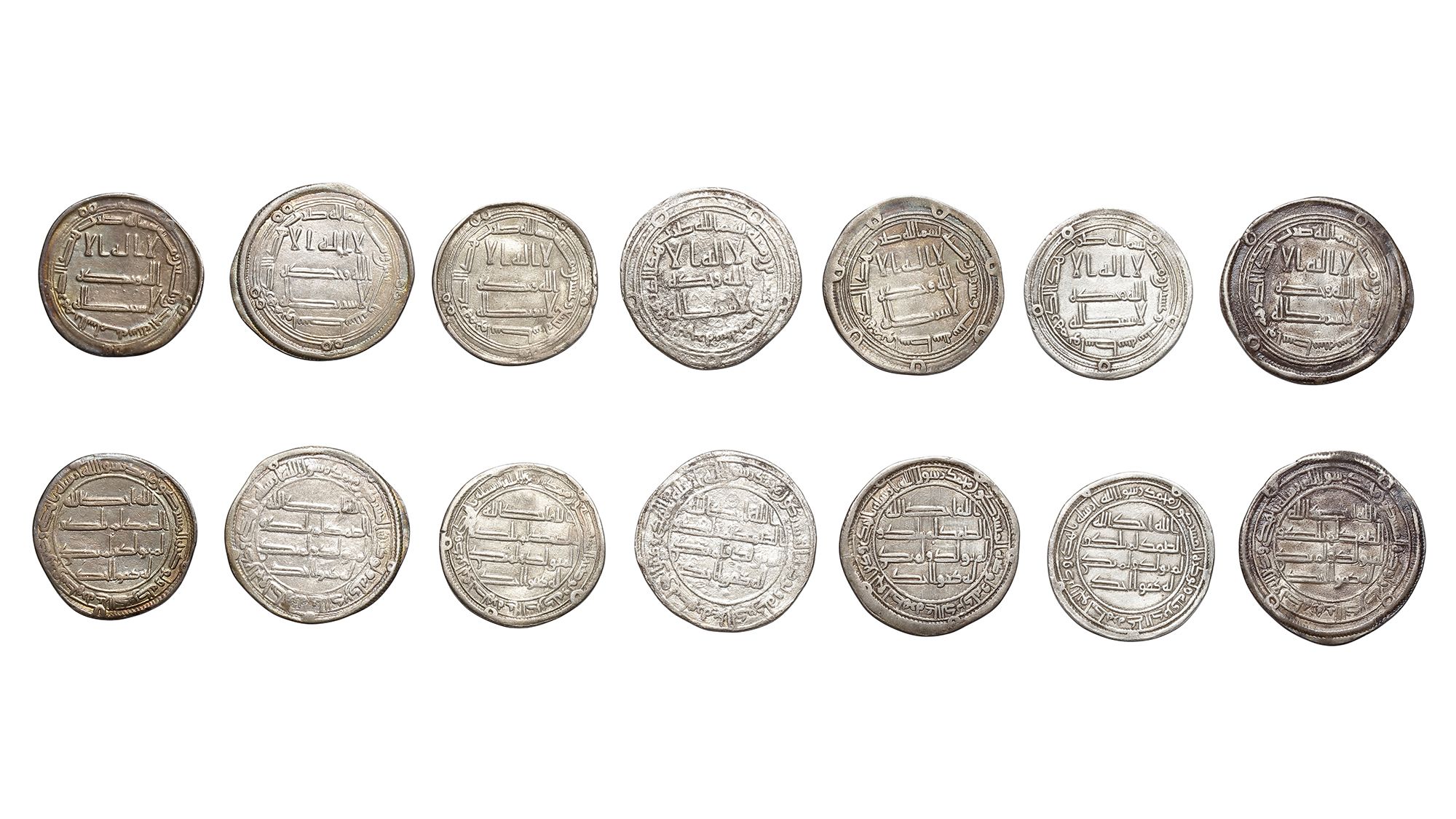 Seven silver dirhams, struck in different cities across various years during the reign of Ibrahim Ibn al-Walid and Marwan II. A silver dirham, Wasit mint, dated 126AH/ 743AD, 2.9g, 25mm. A silver dirham, Wasit mint, dated 126AH/ 743AD, 2.8g, 22mm. A silver dirham, Wasit mint, dated 126AH/ 743AD, 2.7g, 23mm. A silver dirham, Al-Jazirah mint, dated 128AH/ 745AD, 2.5g, 23mm. A silver dirham, Wasit mint, dated 129AH/ 746AD, 2.8g, 23mm. A silver dirham, Wasit mint, dated 130AH/ 747AD, 2.7g, 24mm. A silver dirham, Al-Samah mint, dated 131AH/ 748AD, 2.9g, 22mm.