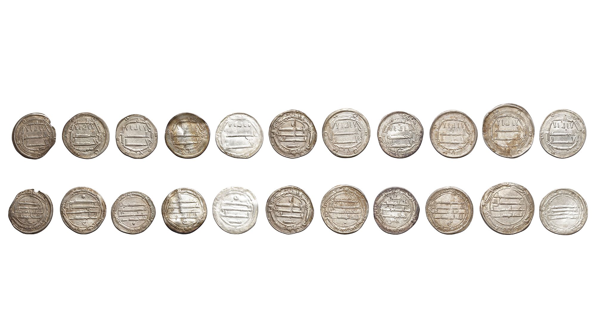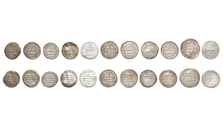 Eleven silver dirhams, struck in different cities, during the reign years of al-Mahdi. A silver dirham, Madinat al-Salam mint, dated 159AH/ 775AD, 2.9g, 26mm. A silver dirham, al-Muhammadiya mint, dated 160AH/ 776AD, 2.7g, 23mm. A silver dirham, Madinat al-Salam mint, dated 161AH/ 777AD, 2.8g, 23mm. A silver dirham, al-Abbasiyah mint, dated 162AH/ 778AD, 2.7g, 23mm. A silver dirham, al-Abbasiyah mint, dated 163AH/ 779AD, 2.7g, 23mm. A silver dirham, Madinat al-Salam mint, dated 164AH/ 780AD, 2.8g, 21mm. A silver dirham, Madinat al-Salam mint, dated 165AH/ 781AD, 2.8g, 23mm. A silver dirham, Madinat al-Salam mint, dated 166AH/ 782AD, 2.6g, 22mm. A silver dirham, al-Muhammadiya mint, dated 167AH/ 783AD, 2.6g, 22mm. A silver dirham, Kirman mint, dated 168AH/ 784AD, 2.5g, 22mm. A silver dirham, Harunabad mint, dated 169AH/ 785AD, 2.5g, 23mm.