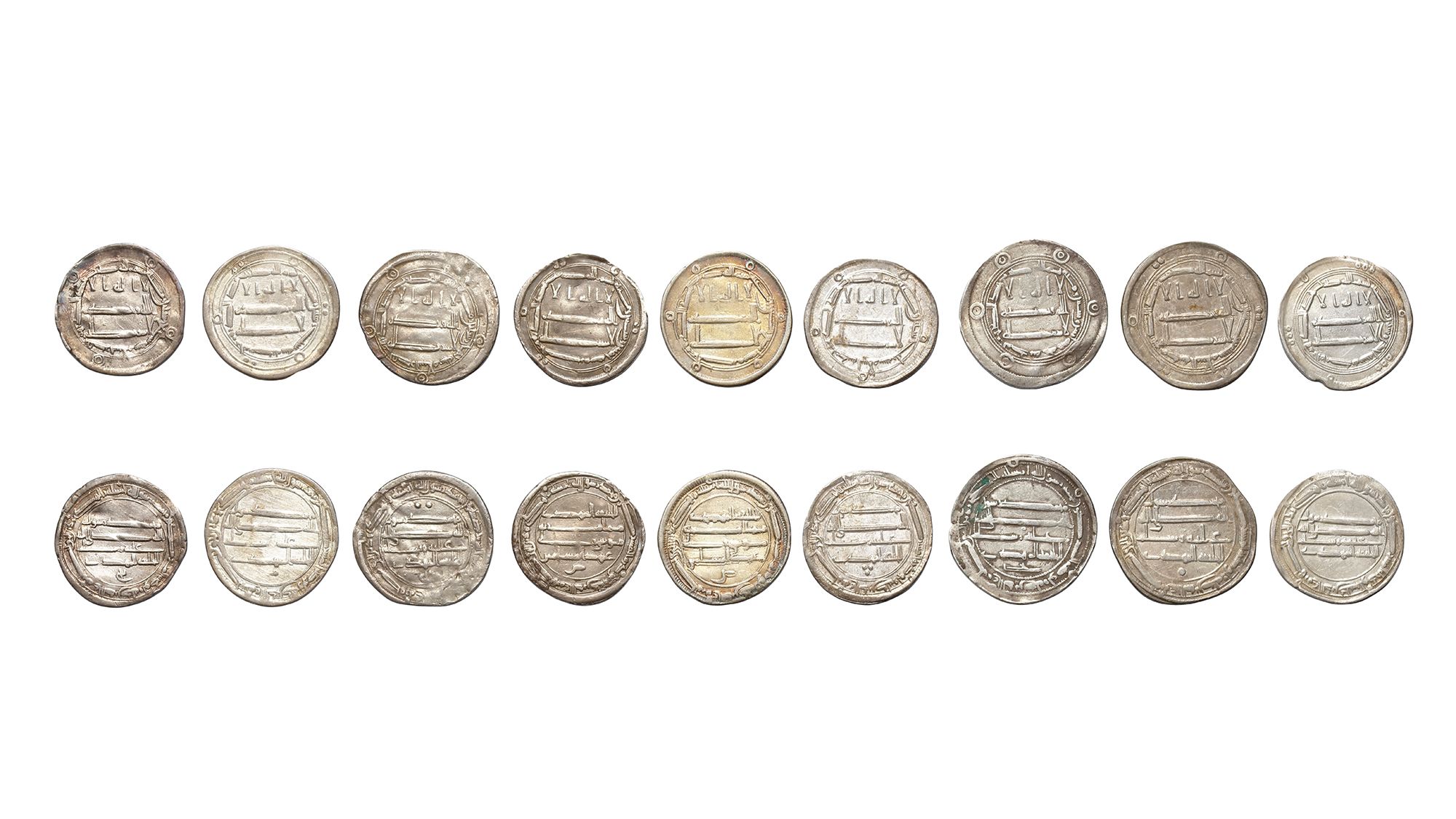 Nine silver dirhams, struck in different cities across various years during the reign of al-Mahdi. A silver dirham, Madinat al-Salam mint, dated 160AH/ 776AD, 2.7g, 25mm. A silver dirham, al-Muhammadiya mint, dated 161AH/ 777AD, 2.8g, 23mm. A silver dirham, Madinat al-Jayy mint, dated 162AH/ 778AD, 2.8g, 25mm. A silver dirham, Madinat al-Salam mint, dated 163AH/ 779AD, 2.8g, 23mm. A silver dirham, al-Basra mint, dated 164AH/ 780AD, 2.8g, 23mm. A silver dirham, al-Basra mint, dated 165AH/ 781AD, 2.8g, 23mm. A silver dirham, al-Muhammadiya mint, dated 166AH/ 782AD, 2.8g, 23mm. A silver dirham, Qasr al-Salam mint, dated 167AH/ 783AD, 2.8g, 22mm. A silver dirham, Qasr al-Salam mint, dated 168AH/ 784AD, 2.8g, 23mm.