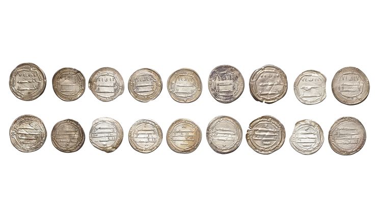 Nine silver dirhams, struck in different cities across various years during the reign of al-Mahdi. A silver dirham, Madinat al-Salam mint, dated 160AH/ 776AD, 2.9g, 24mm. A silver dirham, al-Abbasiya mint, dated 160AH/ 776AD, 2.7g, 22mm. A silver dirham, al-Abbasiya mint, dated 161AH/ 777AD, 2.7g, 25mm. A silver dirham, Arminiyah mint, dated 161AH/ 777AD, 2.8g, 24mm. A silver dirham, al-Basra mint, dated 162AH/ 778AD, 2.9g, 23mm. A silver dirham, Madinat al-Salam mint, dated 163AH/ 779AD, 2.9g, 22mm. A silver dirham, al-Muhammadiya mint, dated 165AH/ 781AD, 2.5g, 23mm. A silver dirham, Kirman mint, dated 166AH/ 782AD, 2.7g, 22mm. A silver dirham, al-Abbasiya mint, dated 167AH/ 783AD, 2.7g, 24mm.