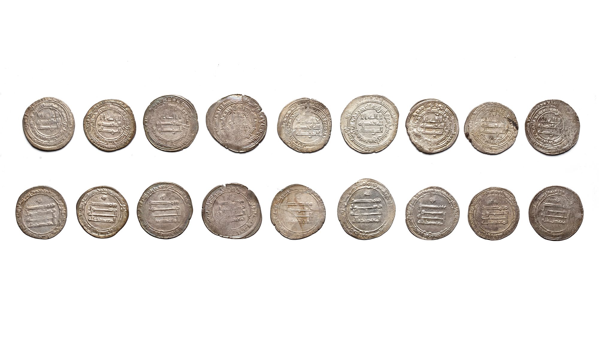 Nine silver dirhams, struck in different cities across during the reign of al-Mu'tadid. A silver dirham, Madinat al-Salam mint, dated 282AH/ 895AD, 2.8g, 22mm. Two silver dirhams, Surra manraa mint, dated 284AH/ 897D, 2.8/2.9g, 21mm. Two silver dirhams, Madinat al-Salam mint, dated 284AH/ 897D, 2.9/3.3g, 21mm. A silver dirham, Madinat al-Salam mint, dated 285AH/ 898AD, 2.6g, 23mm. A silver dirham, Madinat Isbahan mint, illegable, 3.1g, 24mm. A silver dirham, Halab mint, dated 287AH/ 900AD, 2.7g, 22mm. A silver dirham, Surra manraa mint, dated 288AH/ 901AD, 2.8g, 23mm.