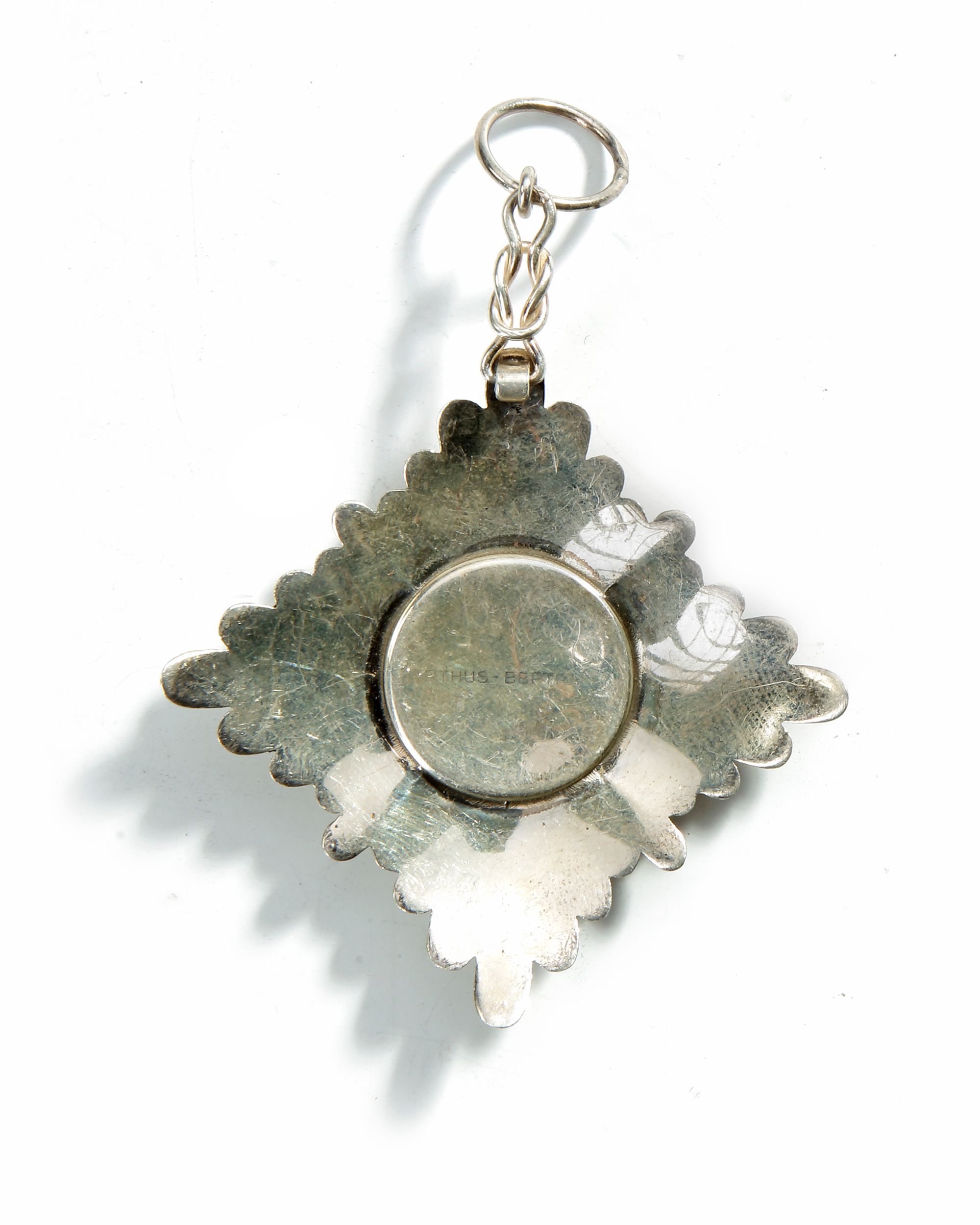 A fine Persian medallion featuring a radiant sunburst design with central enamel decoration of the Lion and Sun motif, symbol of Qajar Iran. Surrounded by green enamel ring and silver rays, with suspension loop.
