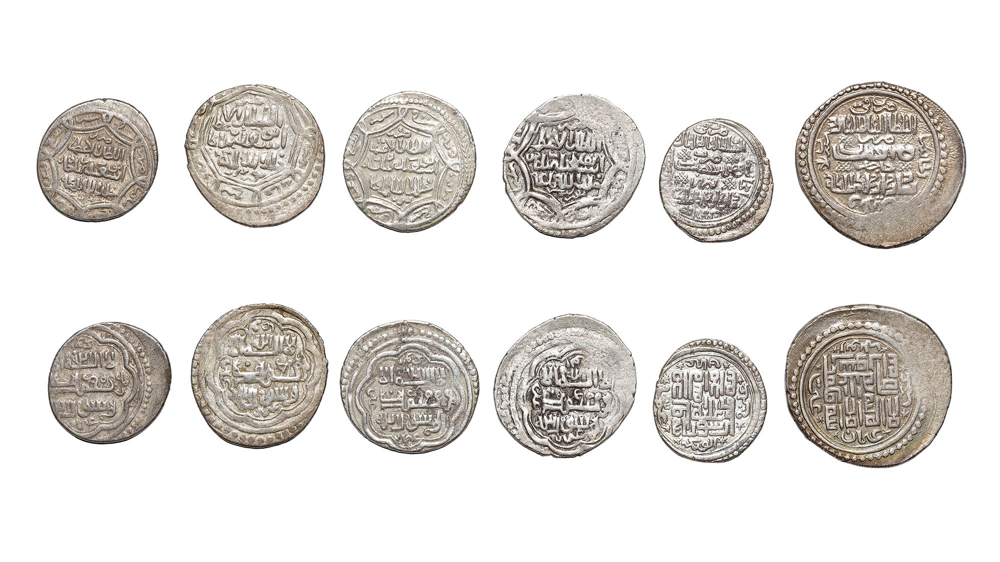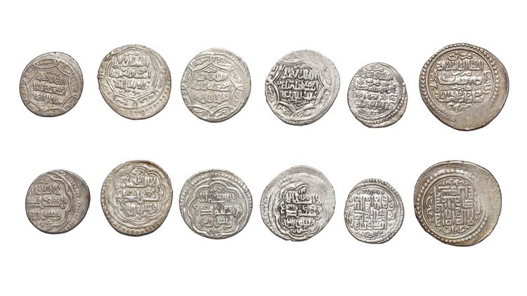 A silver dirham, Tabriz mint, dated 729AH/1329AD, 3.2g, 21mm. A silver dirham, Lur.Buzurg mint, dated 729AH/1329AD, 3.2g, 22mm. A silver dirham, Bazar mint, dated 729AH/1329AD, 3.1g, 21mm. A silver dirham, Lur.Buzurg mint, dated 729AH/1329AD, 3.2g, 22mm. A silver dirham, Tabriz mint, dated 733AH/1332AD, 2.9g, 20mm. A heavy silver dirham, Jajerm mint, dated 733AH/1332AD, 8.6g, 21mm. .