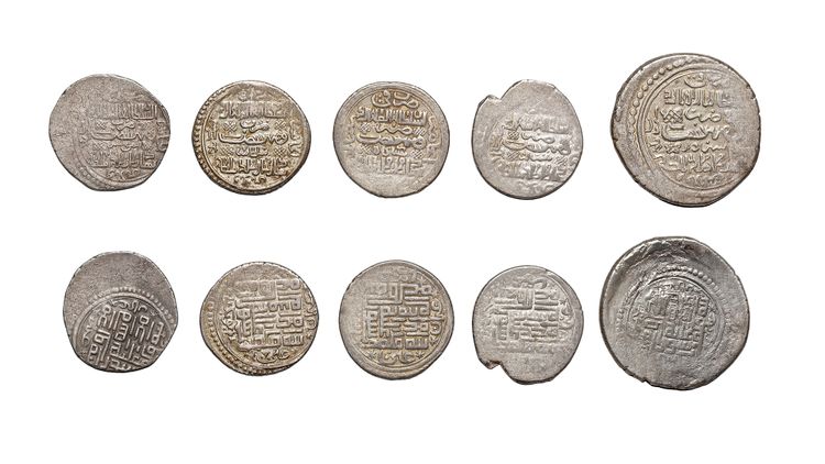A heavy silver dirham, Sabzevar mint, dated 733AH/1332AD, 8.1g, 24mm. A silver dirham, Shiraz mint, dated 733AH/1332AD, 2.6g, 18mm. A silver dirham, Shabankarah mint, dated 733AH/1332AD, 2.7g, 18mm. A silver dirham, Sultaniyah mint, dated 733AH/1332AD, 2.9g, 18mm. A silver dirham, Shustar mint, dated 733AH/1332AD, 2.8g, 19mm.