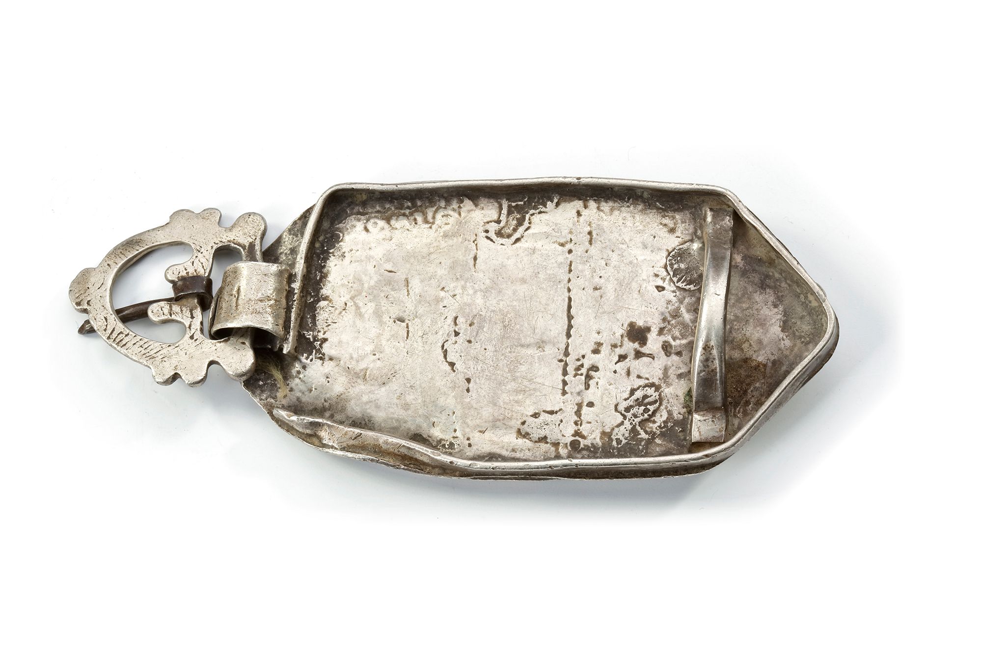 An ornate 19th-century Ottoman silver belt buckle, finely crafted with geometric and floral motifs in relief. The piece features intricate decoration with raised domes, detailed borders, and a sturdy clasp mechanism on the reverse,