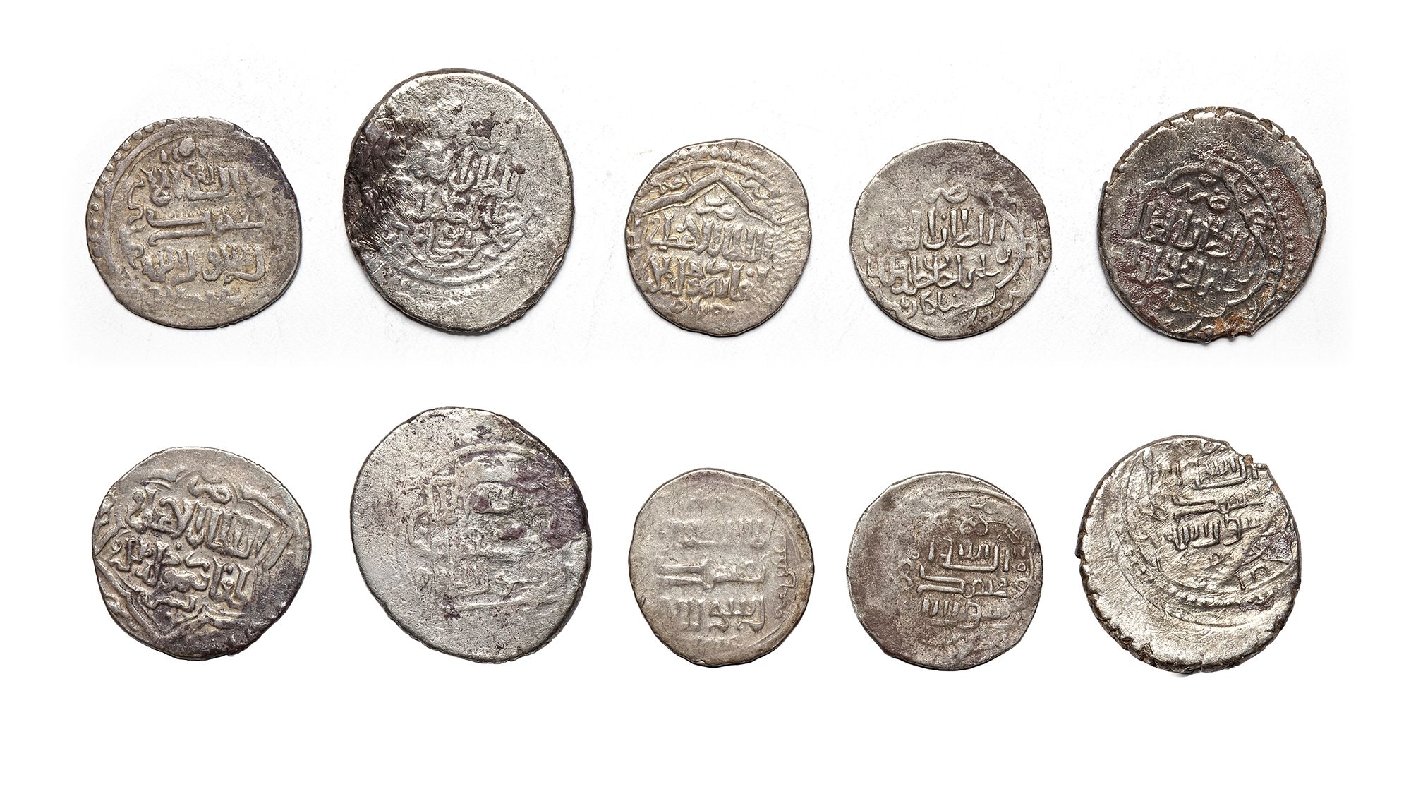 A nisf silver dirham, Tustar mint, dated 741AH/1340AD, 1.4g, 18mm. A silver dirham, Abu-Ishaq mint, dated 741AH/1340AD, 4.0g, 20mm. A nisf silver dirham, Baghdad mint, dated 741AH/1340AD, 1.4g, 15mm. A nisf silver dirham, Shabenkareh mint, dated 741AH/1340AD, 1.4g, 15mm. A silver dirham, Shabenkareh mint, dated 741AH/1340AD, 4.1g, 18mm.