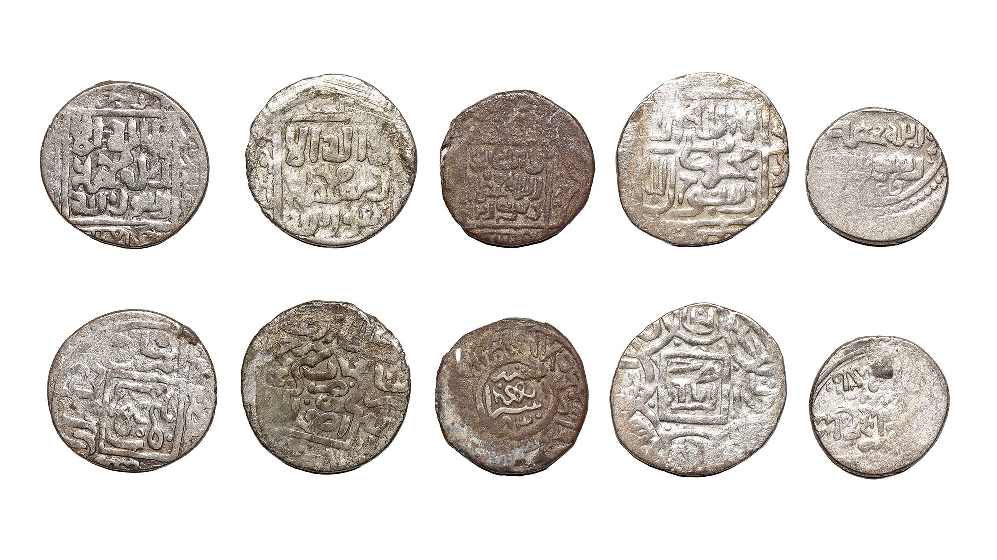 A silver Tanka, Isfahan mint, dated 820AH/1417AD, 5.3g, 22mm. A silver Tanka, Isfahan mint, dated 821AH/1418AD, 5.4g, 22mm. A silver Tanka, Asterabad mint, dated 830AH/1427AD, 5.2g, 21mm. A silver Tanka, Asterabad mint, not dated, 5.3g, 24mm. A silver Tanka, Tabriz mint, not dated, 5.4g,18mm.