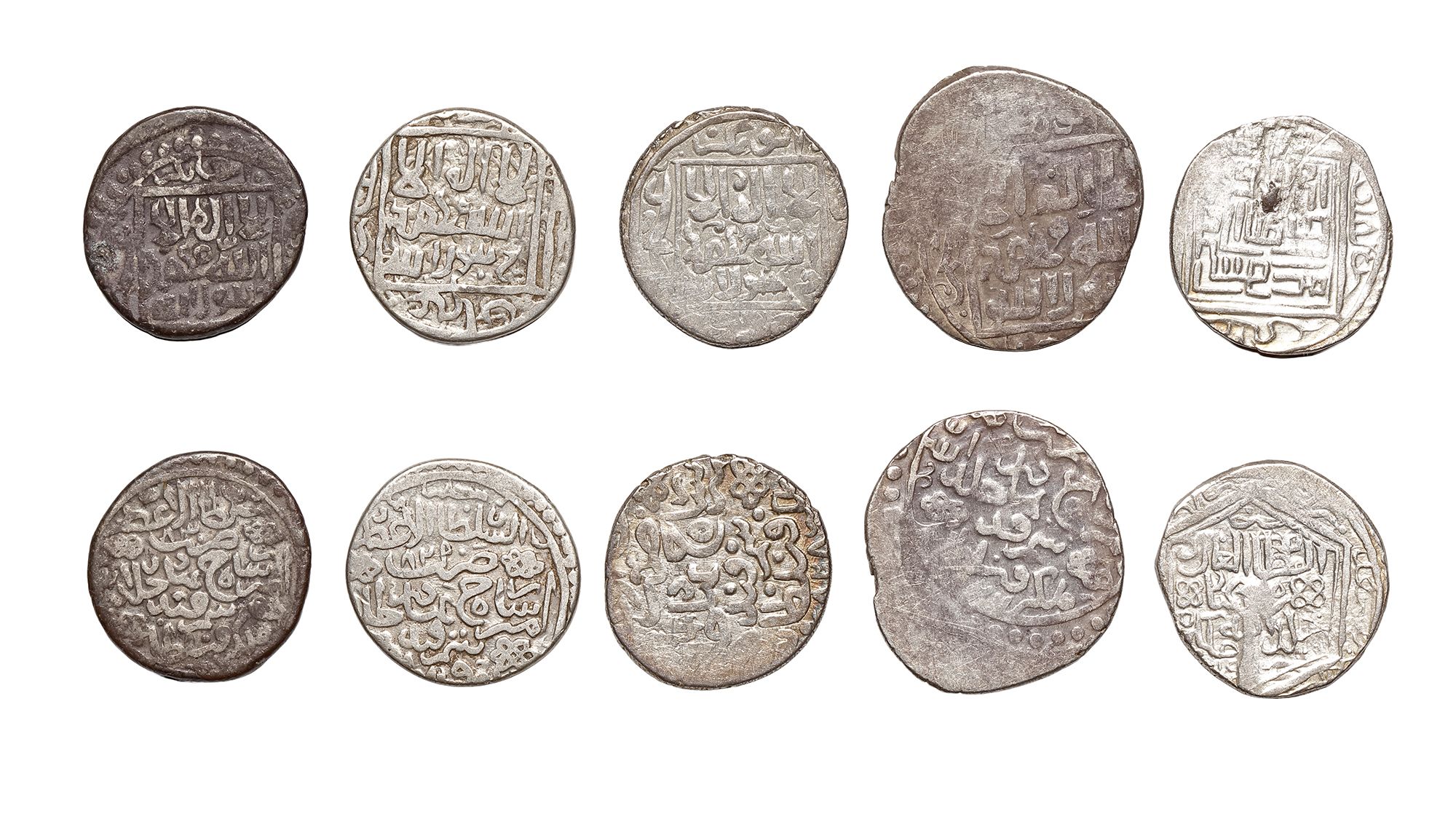 A silver Tanka, Sabzevar mint, not dated, 5.4g, 21mm. A silver Tanka, Samarqand mint, dated 827AH/1424AD, 5.3g, 24mm. A silver Tanka, Samarqand mint, dated 828AH/1425AD, 5.2g, 21mm. A silver Tanka, Samarqand mint, dated 829AH/1426AD, 5.1g, 21mm. A silver Tanka, Samarqand mint, dated 830AH/1427AD, 5.1g,20mm