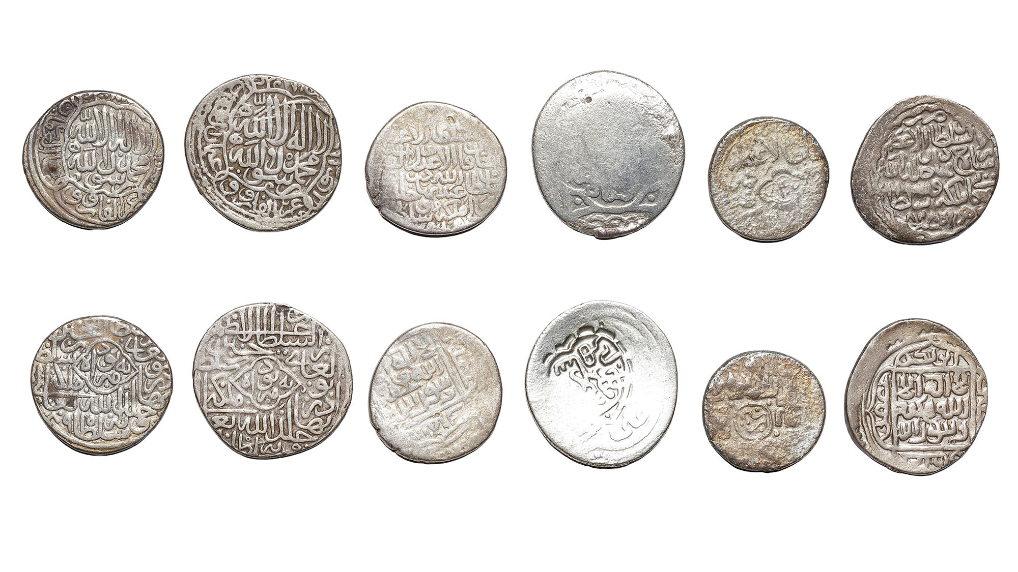 A silver Tanka(Shah Rukh), Herat mint, dated 828AH/1424AD, 5.1g, 22mm. A silver Tanka(Shah Rukh), Tabriz mint, dated 847AH/1443AD, 4.6g, 17mm. A silver Tanka(Shah Rukh), Samarqand mint, not dated, 5.2g, 24mm. A silver Tanka(Abd Allāh Bahadur Mirza), Samarqand mint, not dated, 4.8g, 20mm. A silver Tanka(post Mahmud), Herat mint, not dated, 4.7g, 23mm. A silver Tanka(Ḥusayn Bayqara), Herat mint, 895AH/1489AD, 4.6g, 20mm.