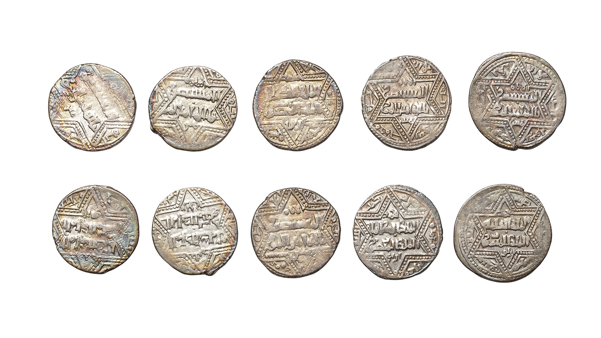 A silver dirham, Dunaysir mint, dated 627AH/ 1229AD, 2.8g, 21mm. A silver dirham, Dunaysir mint, dated 628AH/ 1230AD, 2.9g, 20mm. A silver dirham, Dunaysir mint, dated 630AH/ 1232AD, 3.0g, 19mm. A silver dirham, Dunaysir mint, dated 631AH/ 1233AD, 2.9g, 19mm. A silver dirham, Dunaysir mint, dated 632AH/ 1234AD, 2.9g, 19mm.