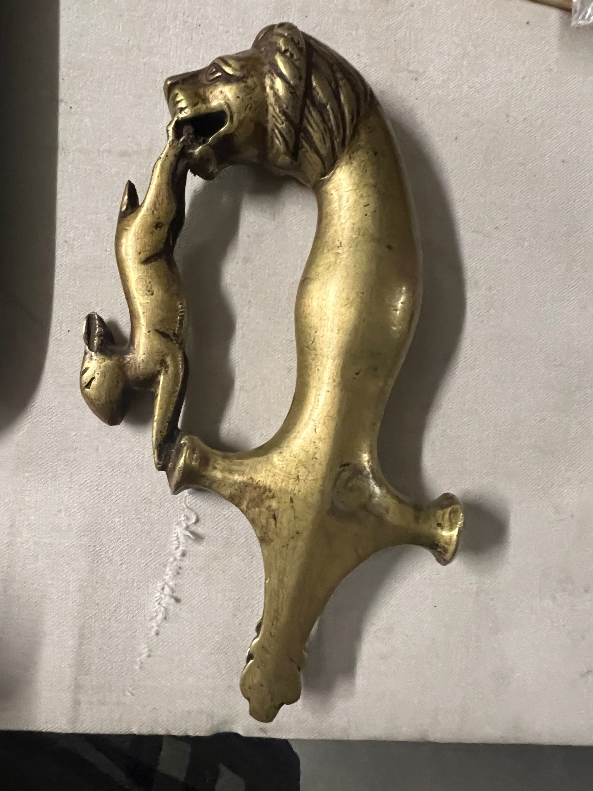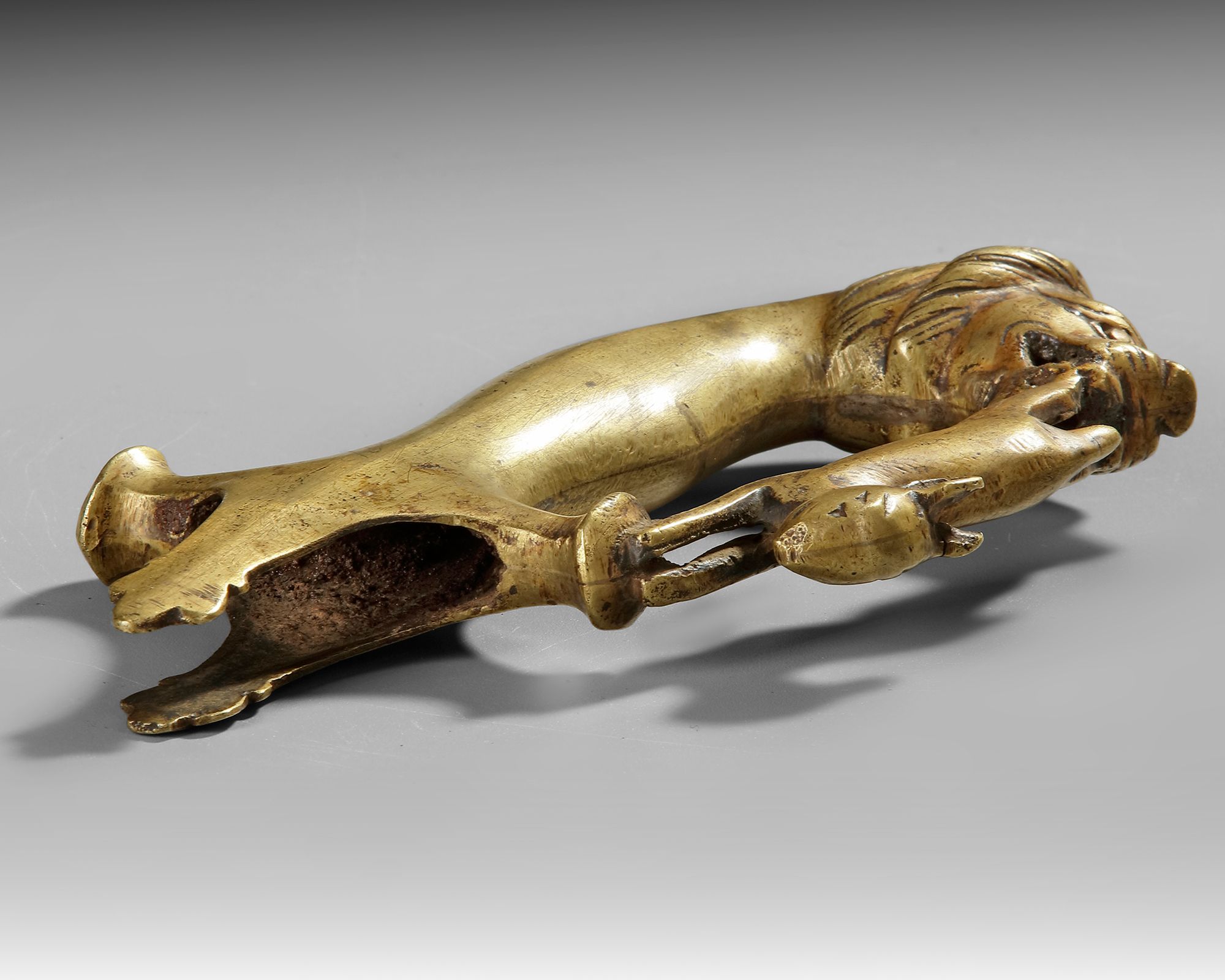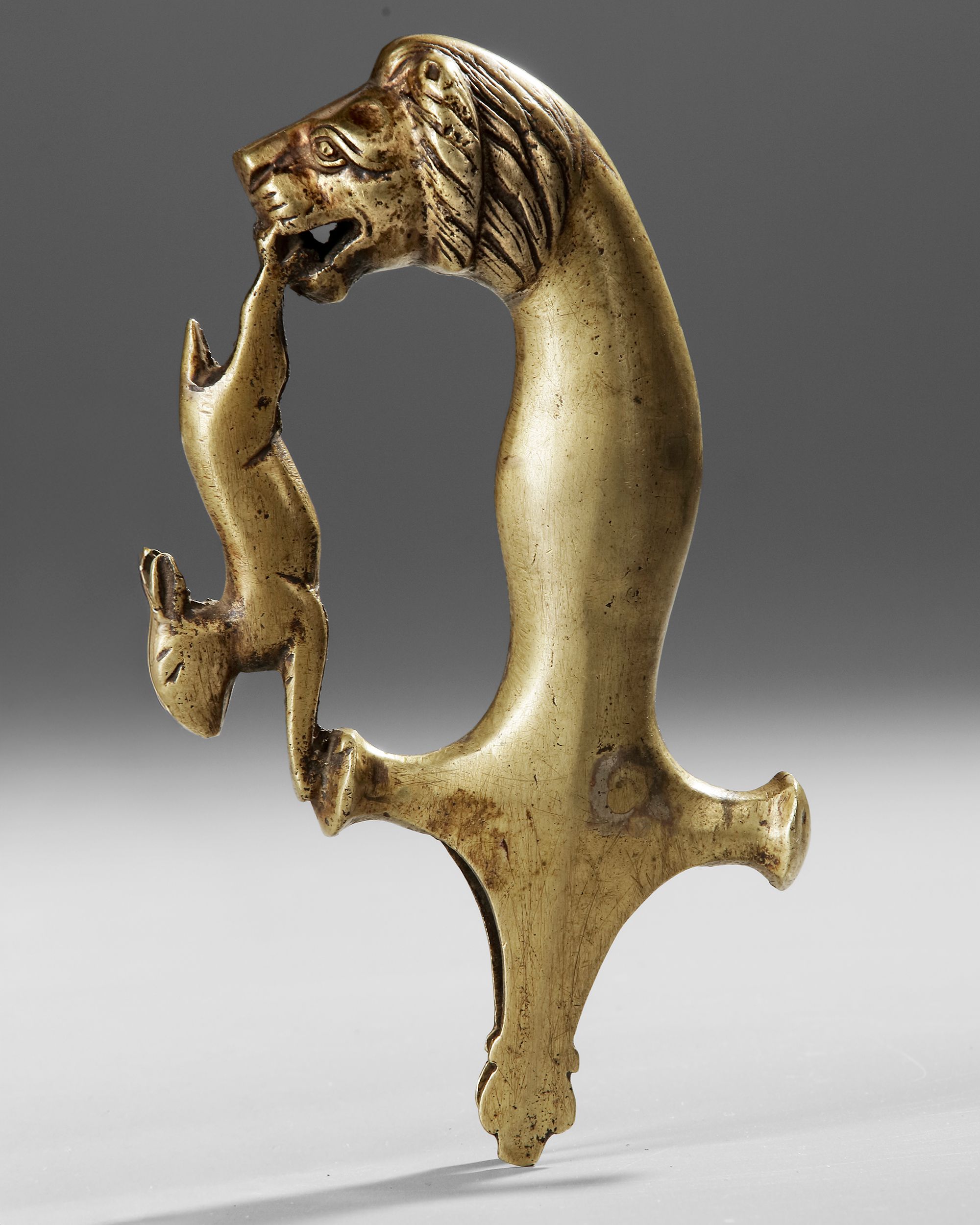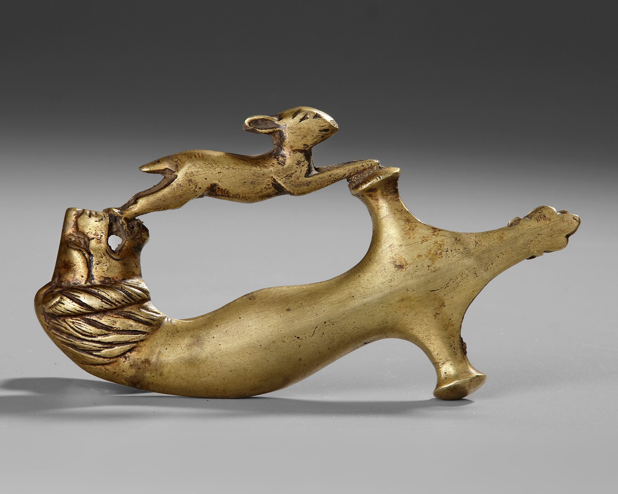 This finely crafted Mughal sword hilt, dating to the 19th century, is cast in gilt bronze and shaped as a lion attacking a hare. ca. 18 by 9 cm.