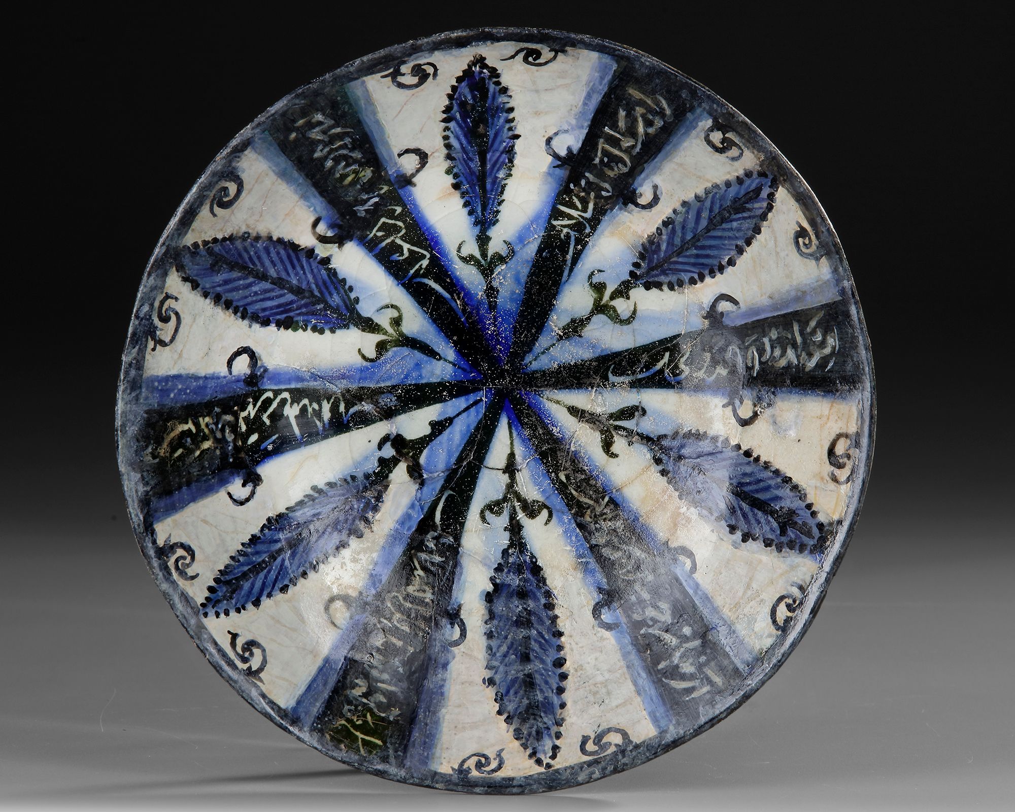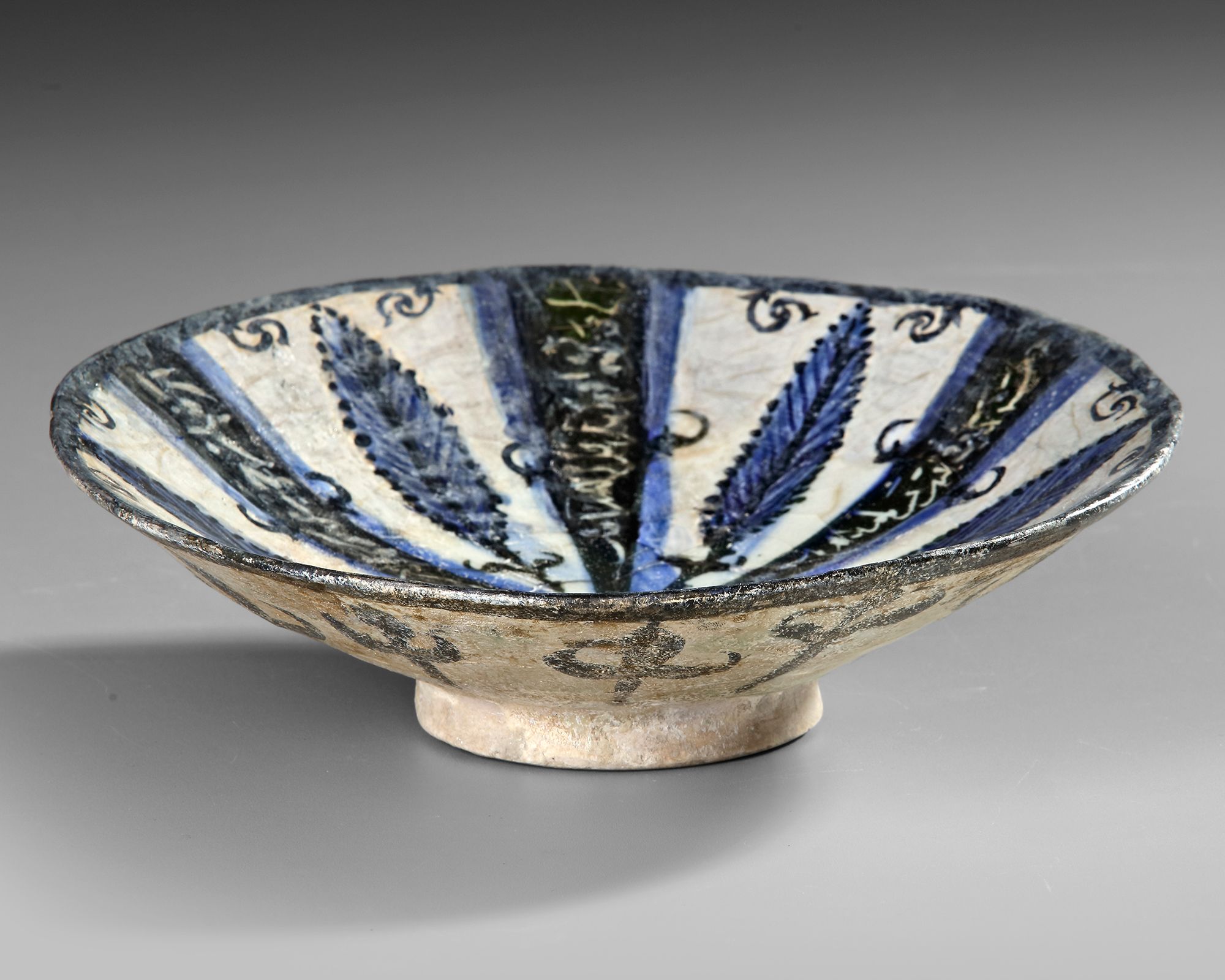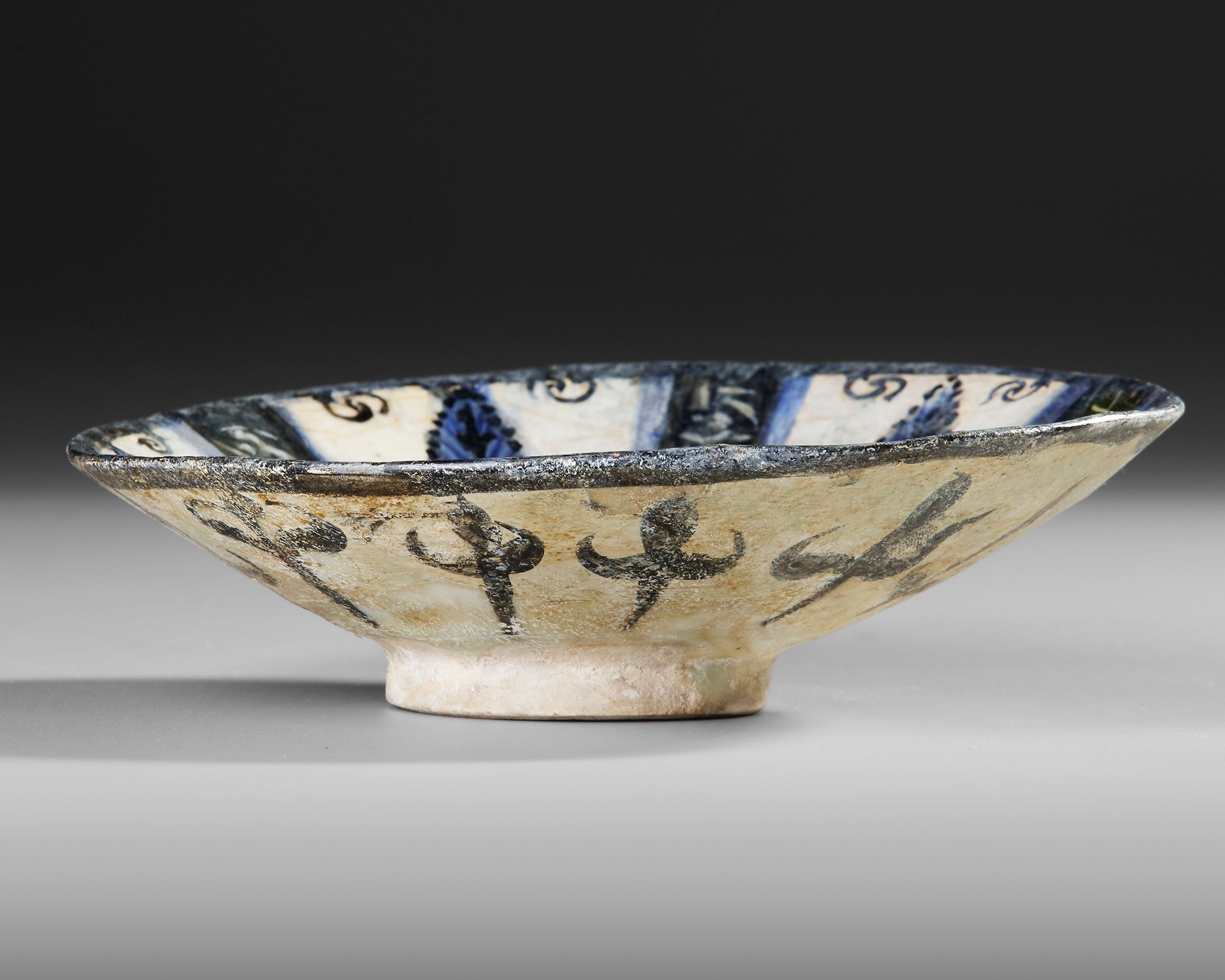 Of truncated conical form with flaring walls stepped down to a straight vertical foot, painted in cobalt blue and black under a transparent colourless glaze, the interior with four radial black bands with naskhi calligraphy scratched in reserve between blue borders, divided by six triangular panels with scrolling waterweed painted in black on a blue and white ground, the reverse with further waterweed motifs.