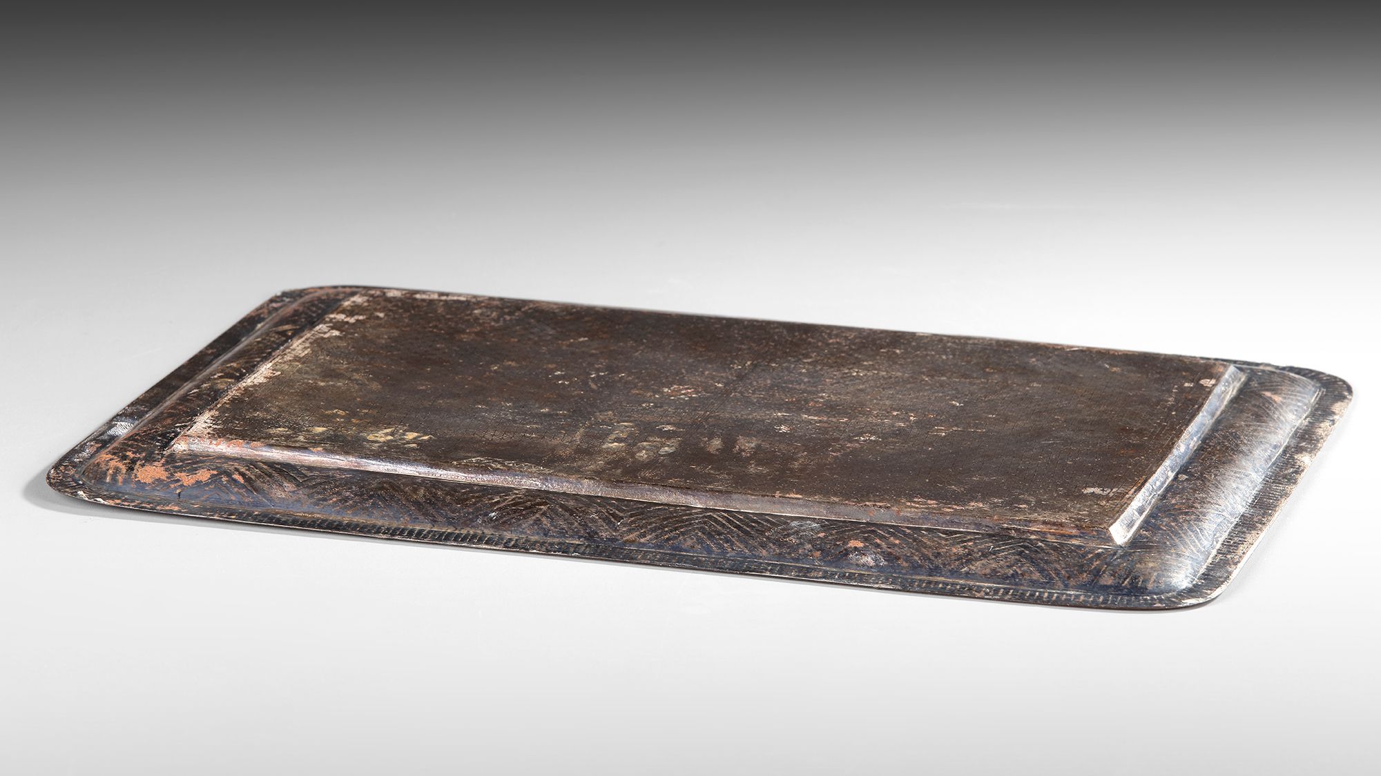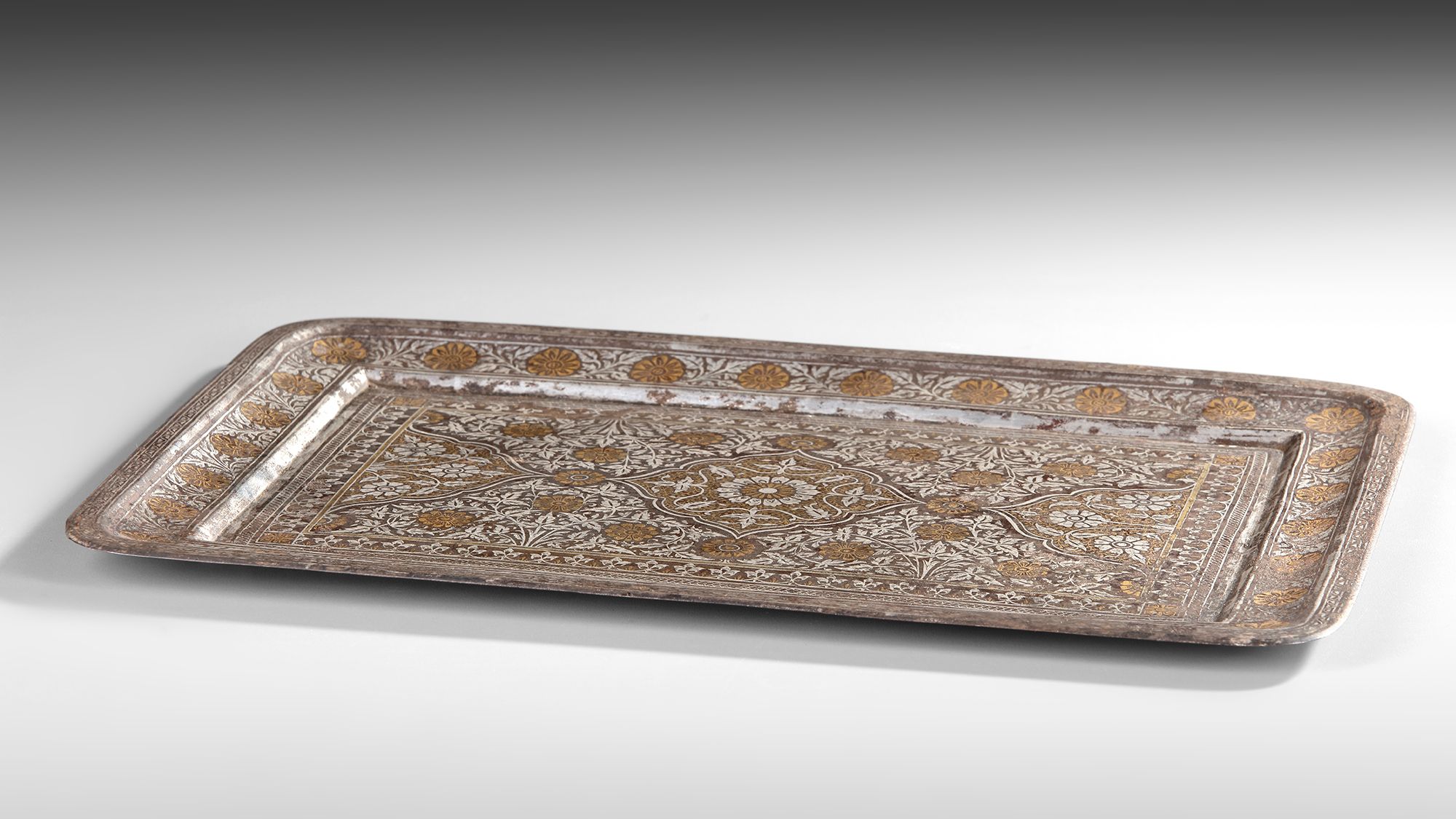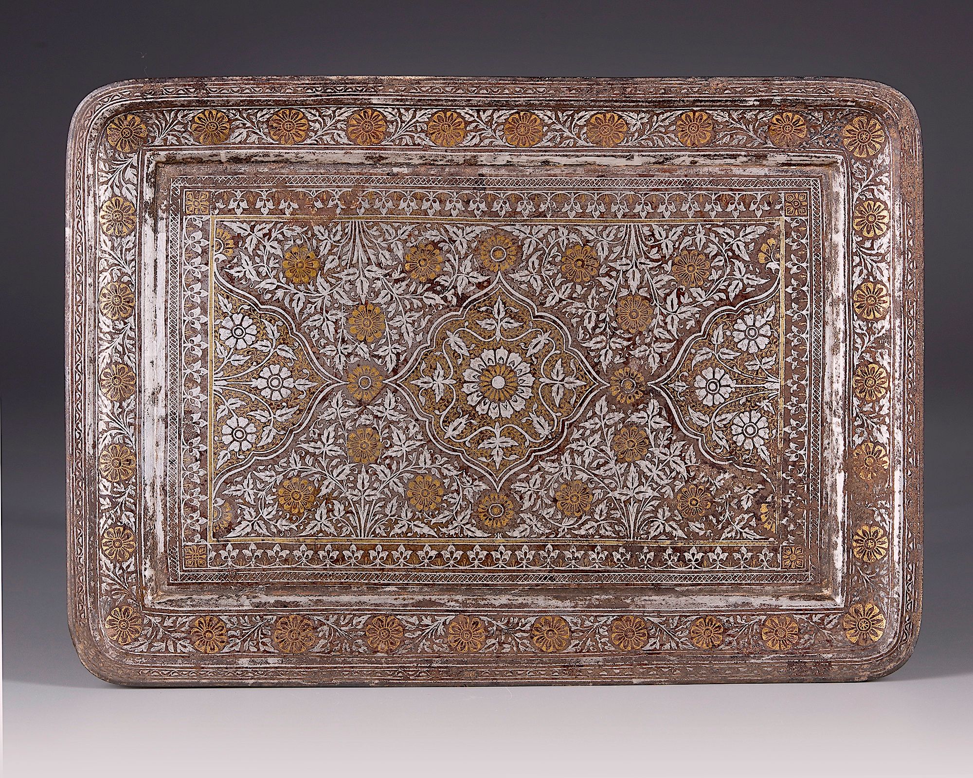 A finely crafted rectangular Bidri ware tray, richly inlaid with silver and brass floral and geometric motifs on a dark metal ground. 27 by 25 cm.