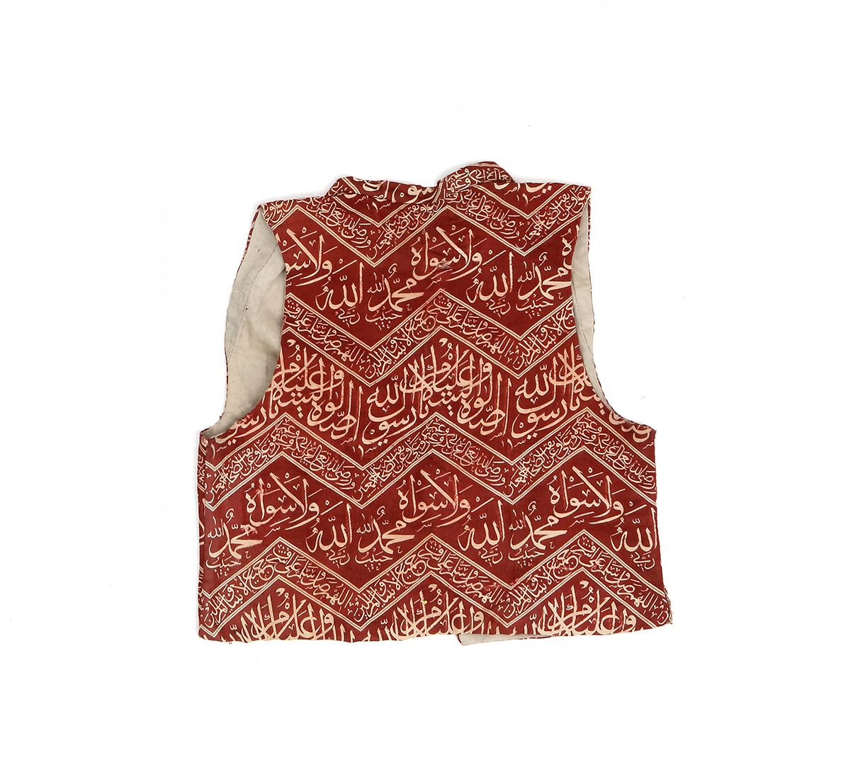 Probably for use in one of the Holy Shrines, the red ground divided by horizontal chevrons into a series of alternating major and minor bands of inscription in muhaqqaq, some wear