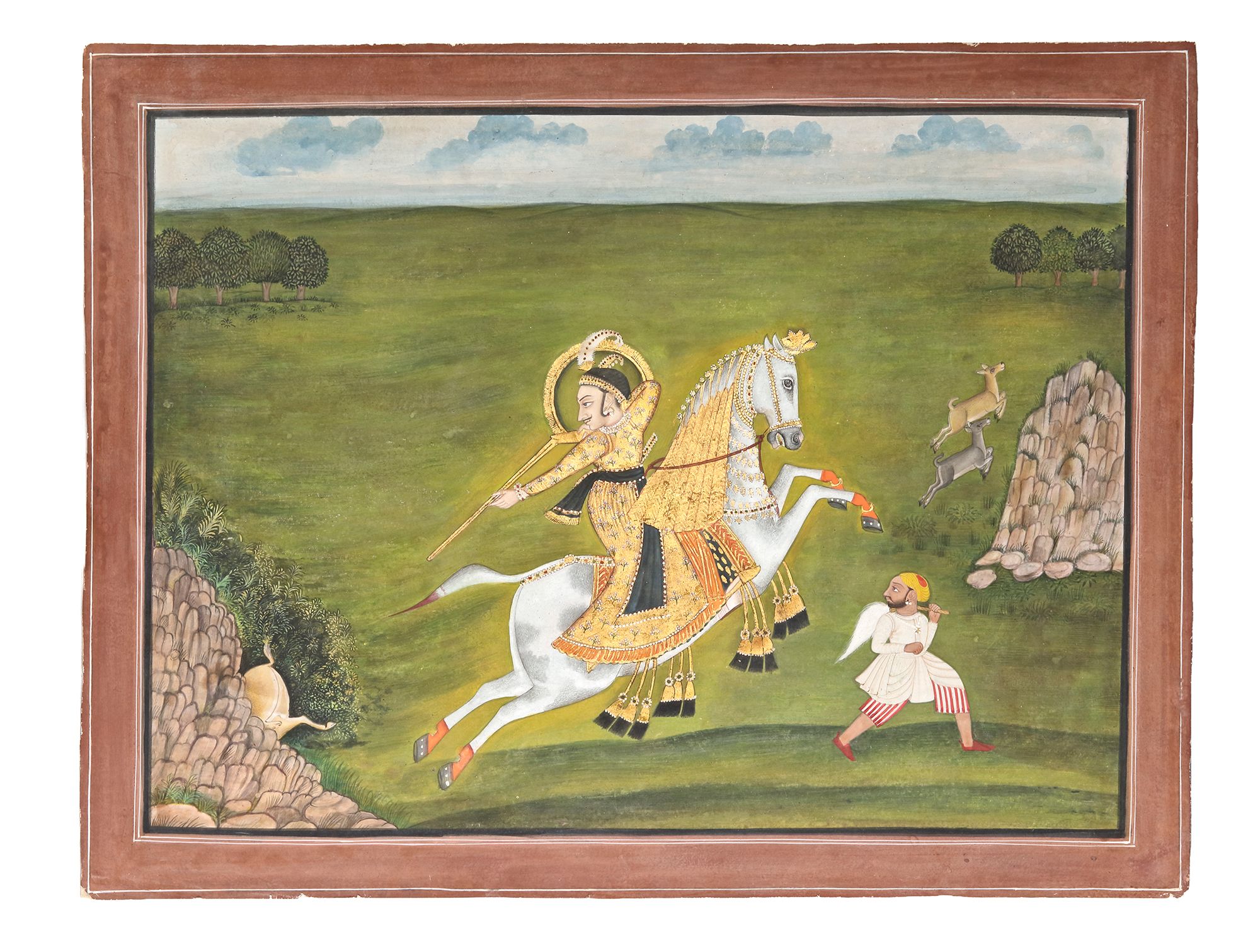 This elegant painting depicts Maharaja Ari Singh of Mewar mounted on a richly adorned white horse, shown in full royal regalia with a halo symbolizing his divine authority. The attendant follows him on foot, while the lush green landscape and distant hills form a serene backdrop.
