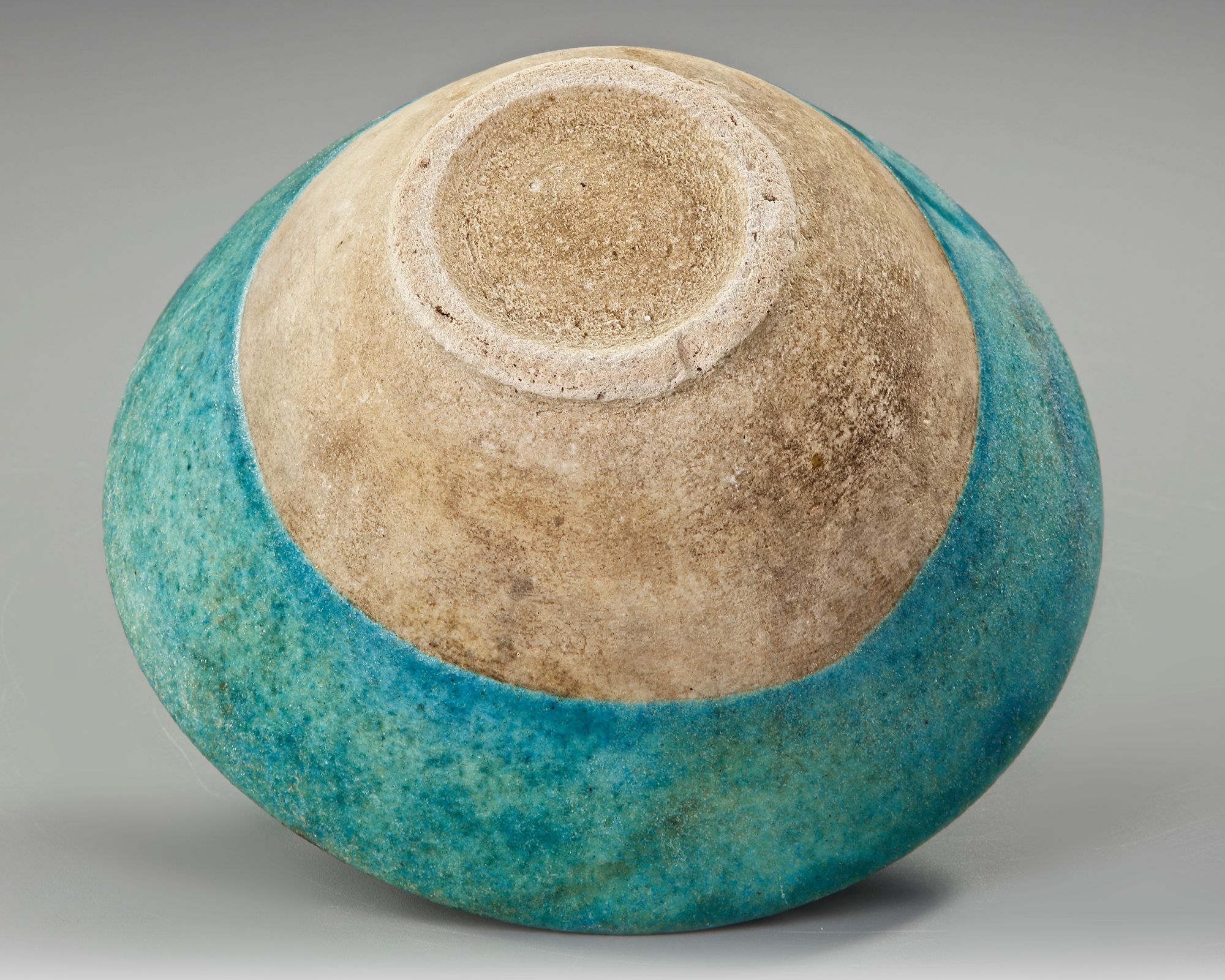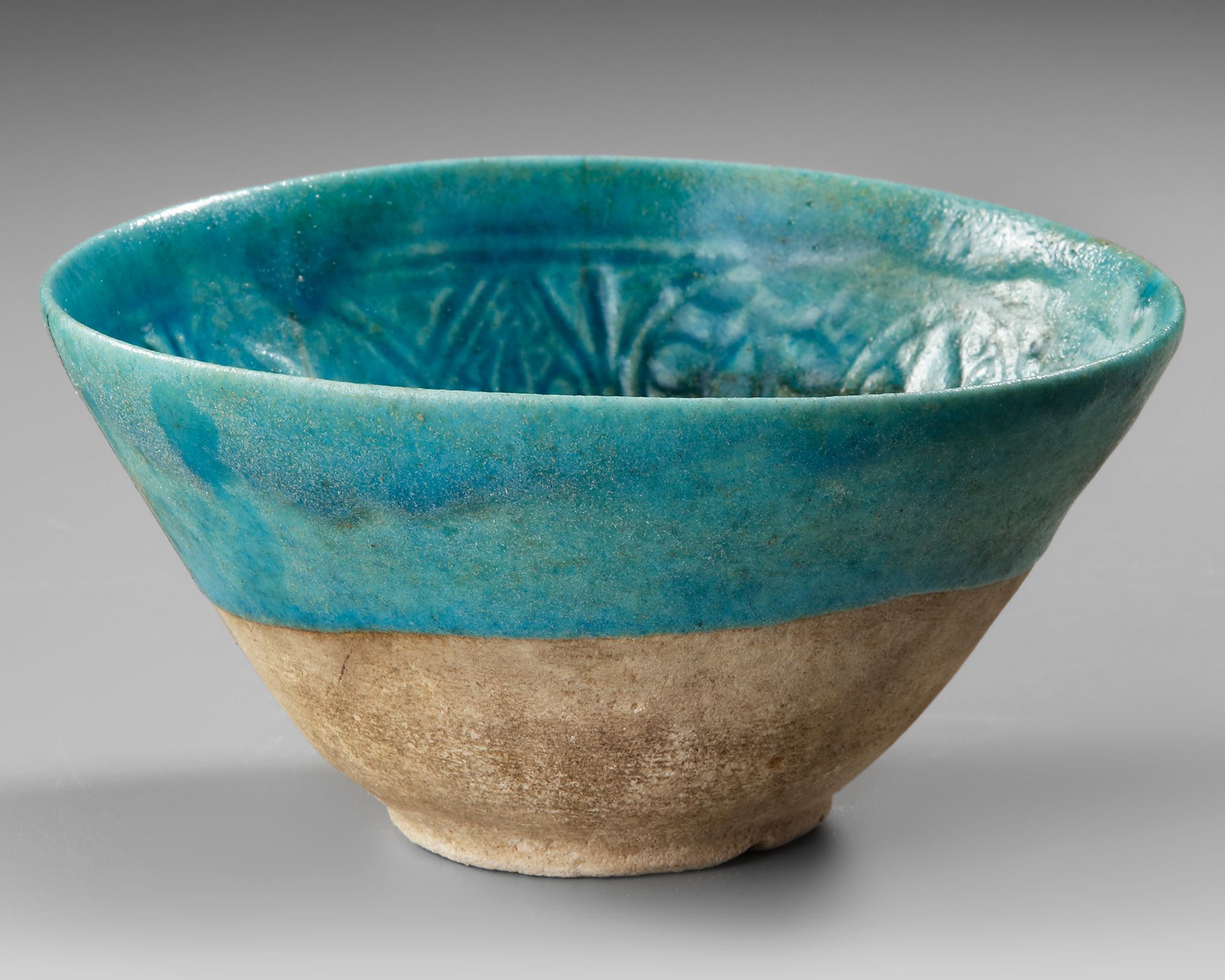 Of conical, rounded form on short feet, in a turquoise glaze, the moulding consisting of a central interlace motif and symmetrical designs around the interior.