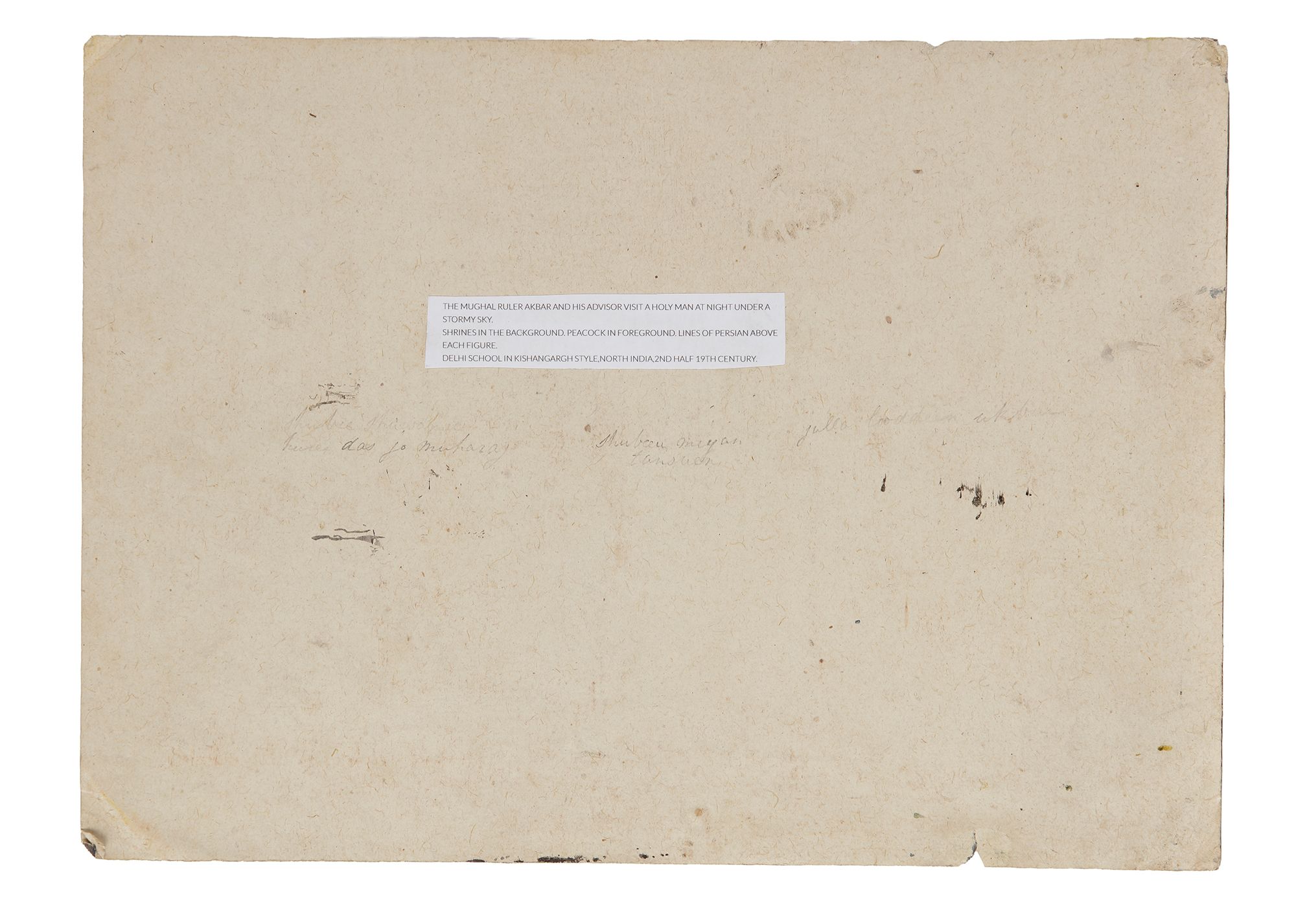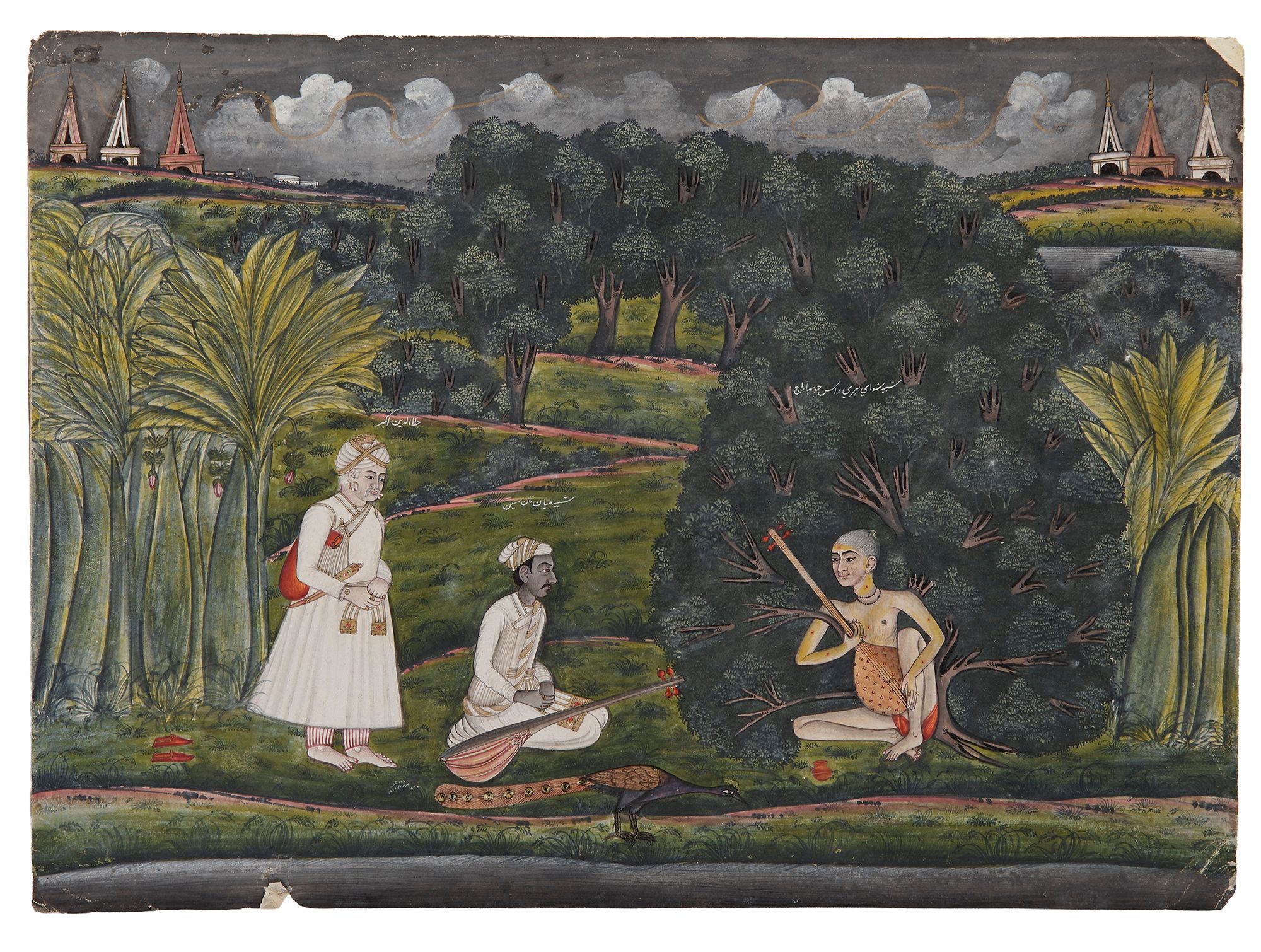 shrines in the background. peacock in foreground. lines of persian above each figure. delhi school in kishangarh style. ca. 34 by 24 cm.