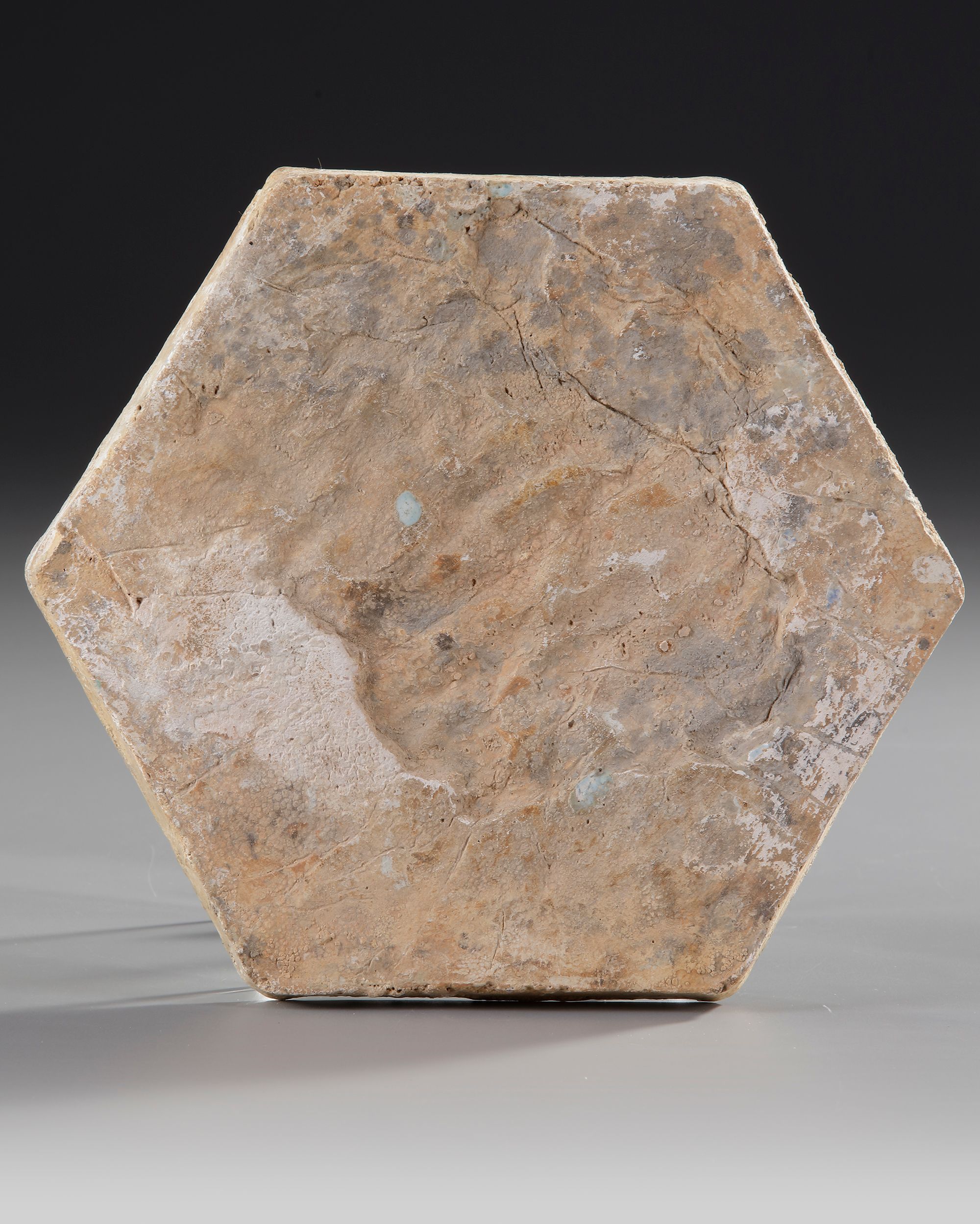 A finely crafted hexagonal Persian ceramic tile from the Qajar period (19th century), decorated with the image of a bird perched on branches.