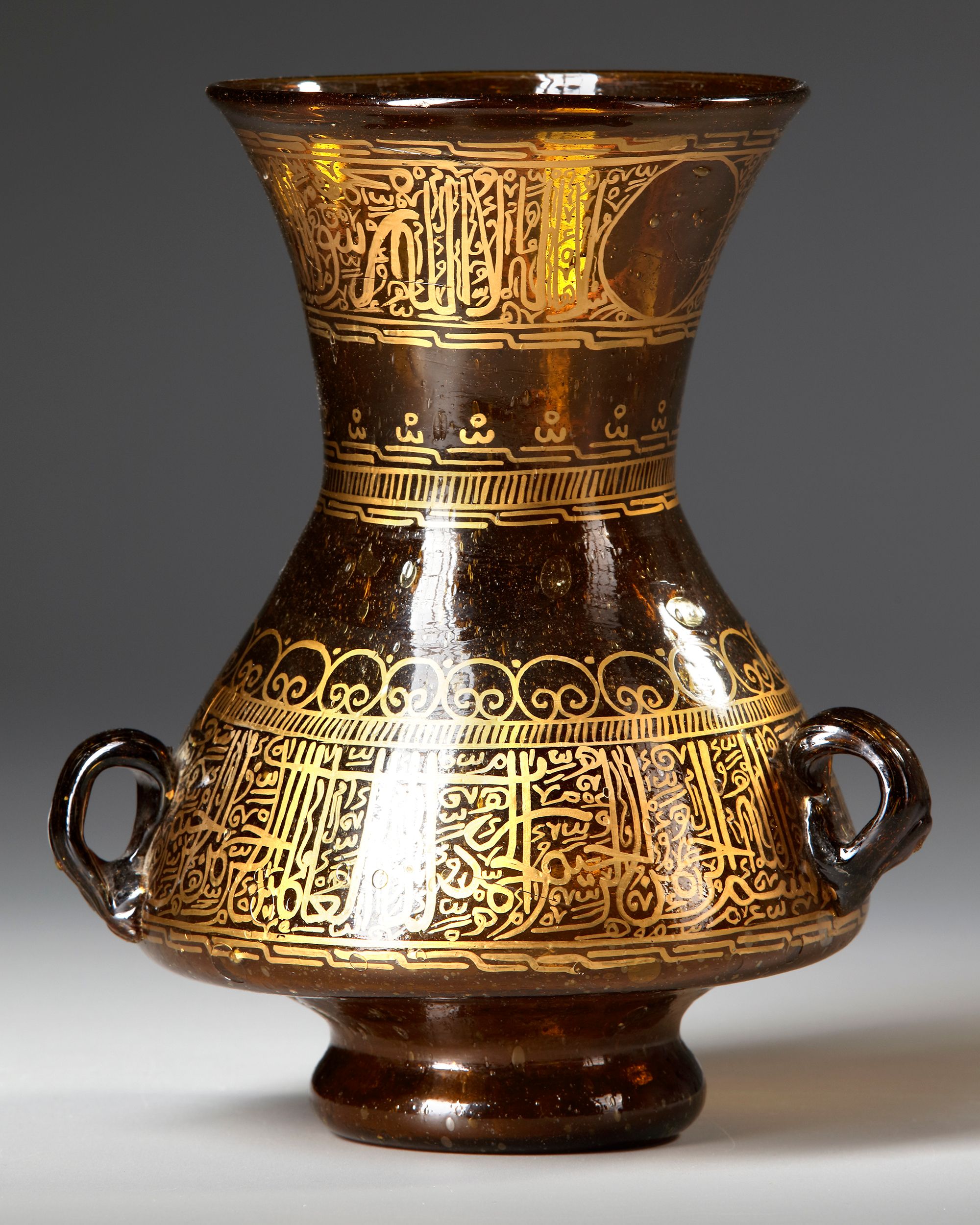 A glass mosque lamp with a large round bulbous body rising to a narrower waist, decorated with Inscriptions. Height 20 cm.