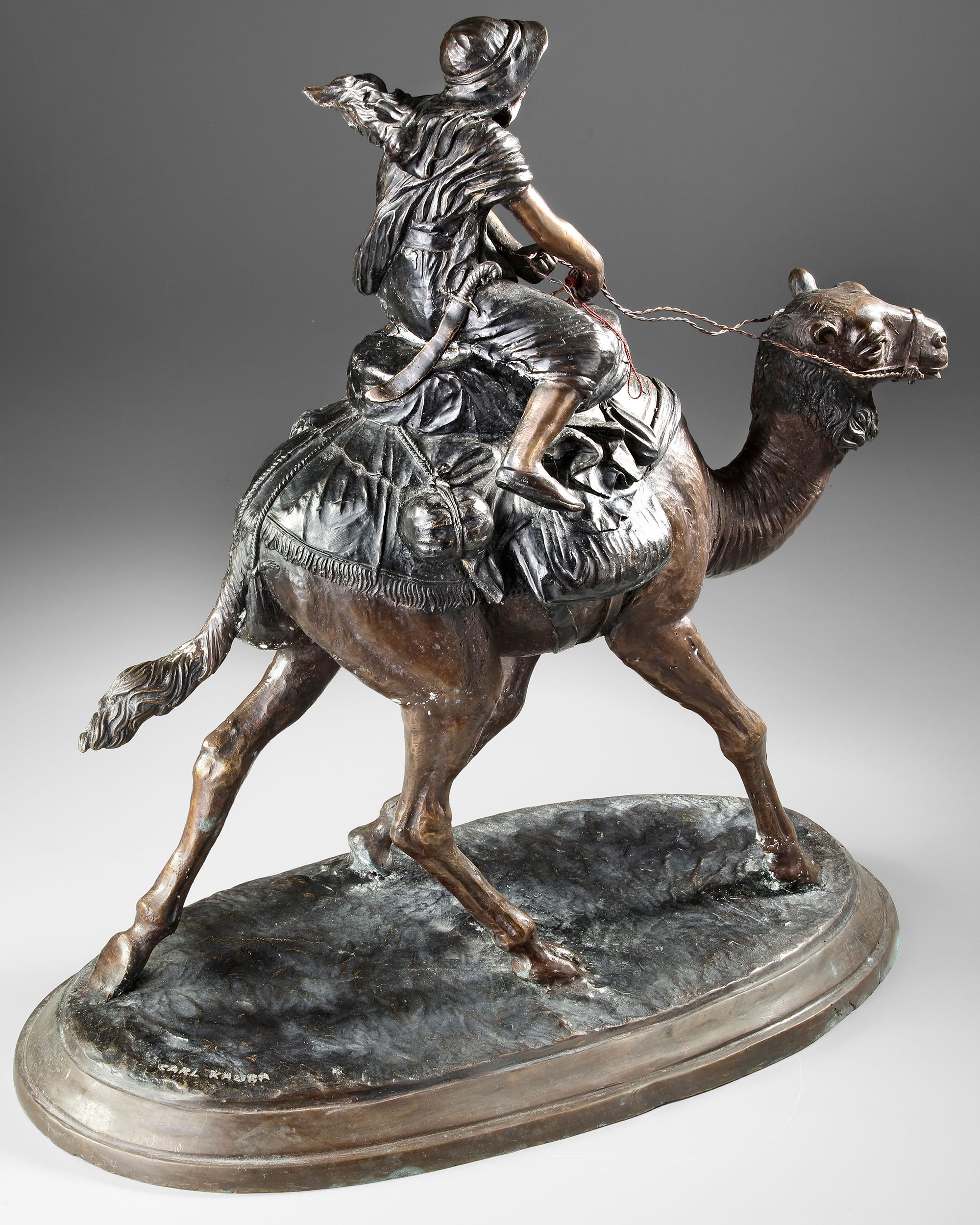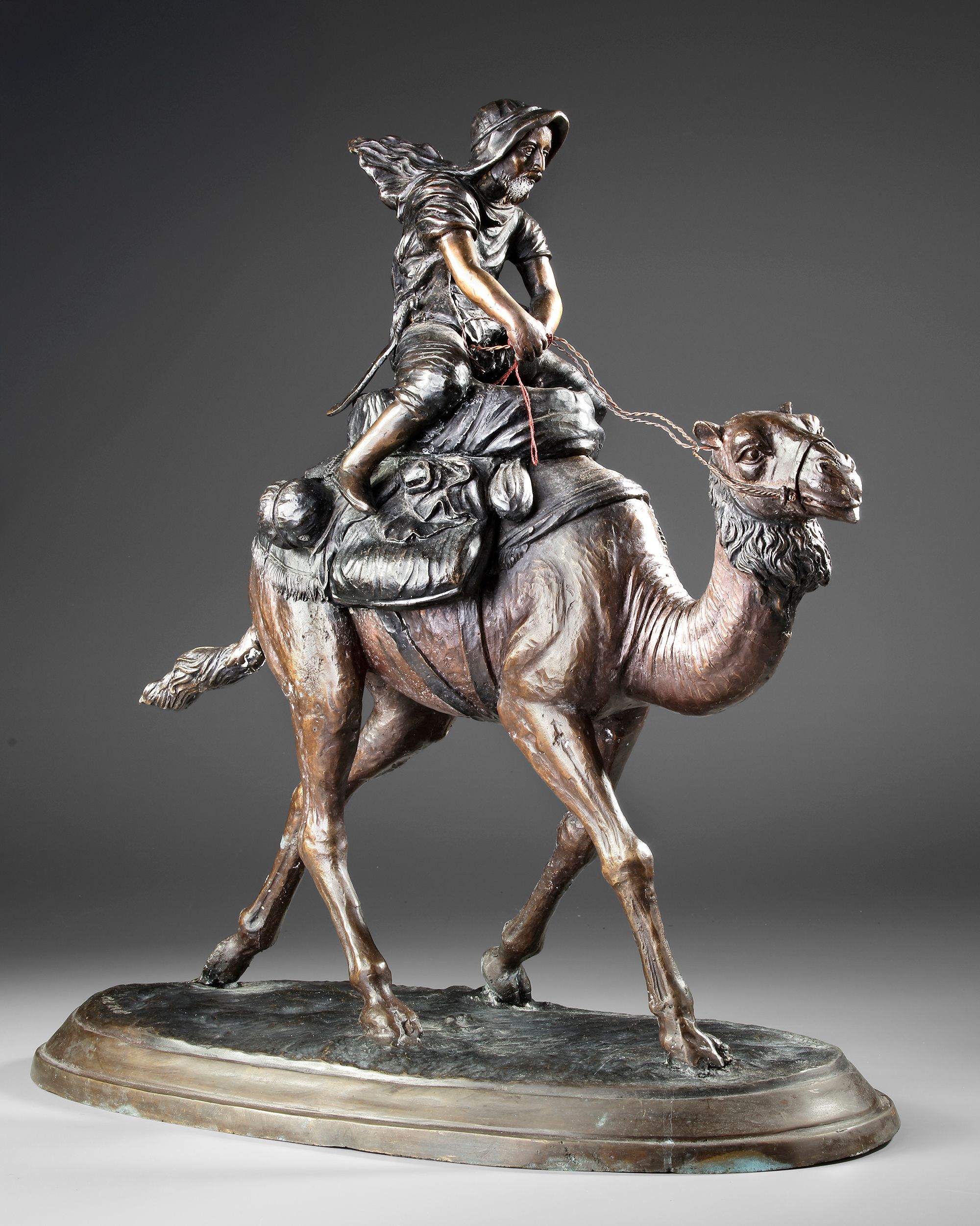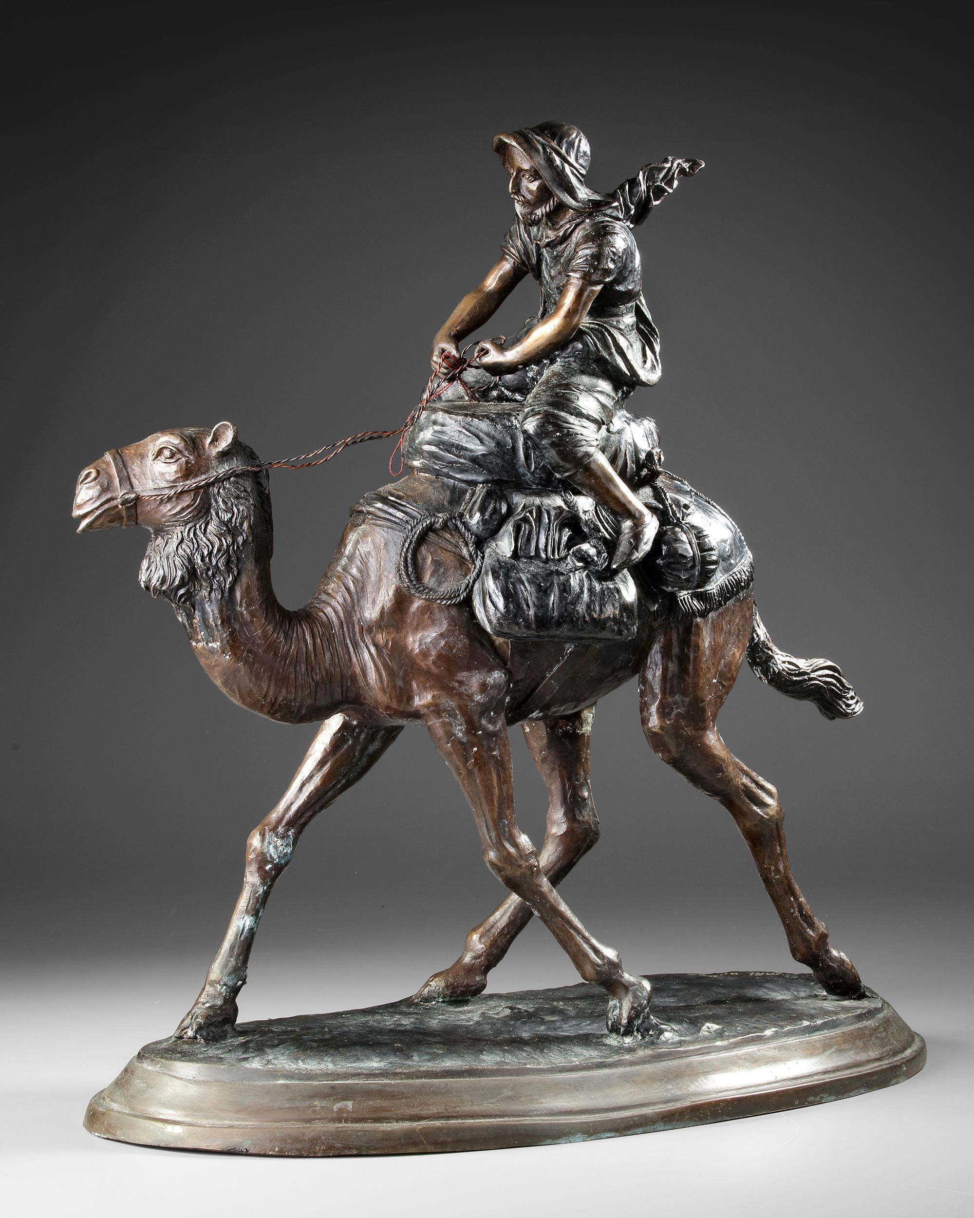 A finely cast 19th-century bronze sculpture depicting a rider mounted on a camel, rendered with impressive anatomical detail and dynamic movement. The figure’s flowing garments and the camel’s textured coat highlight the craftsmanship, while the naturalistic pose captures a moment of travel or caravan life. This decorative bronze embodies the exotic Orientalist aesthetic popular in the 19th century.