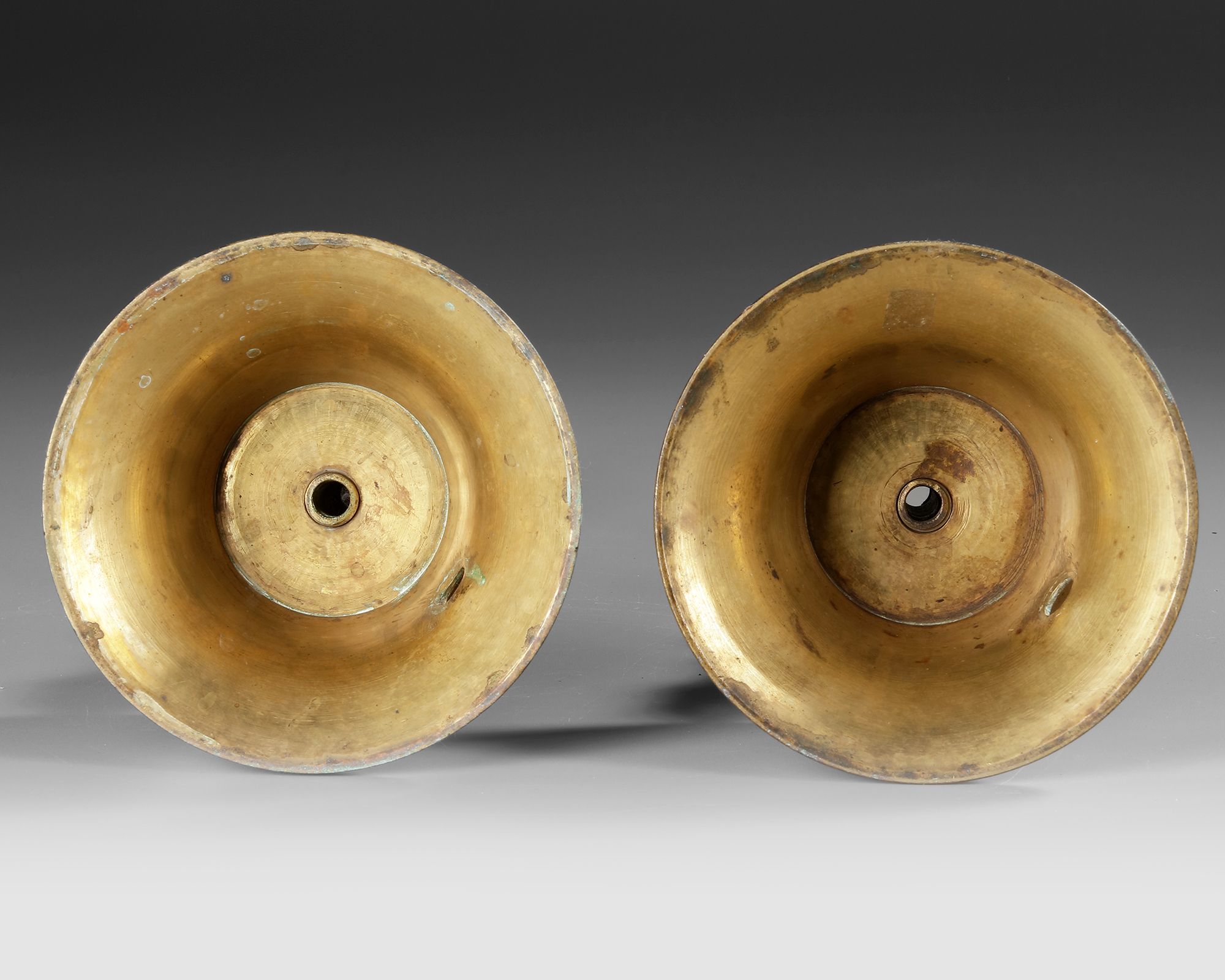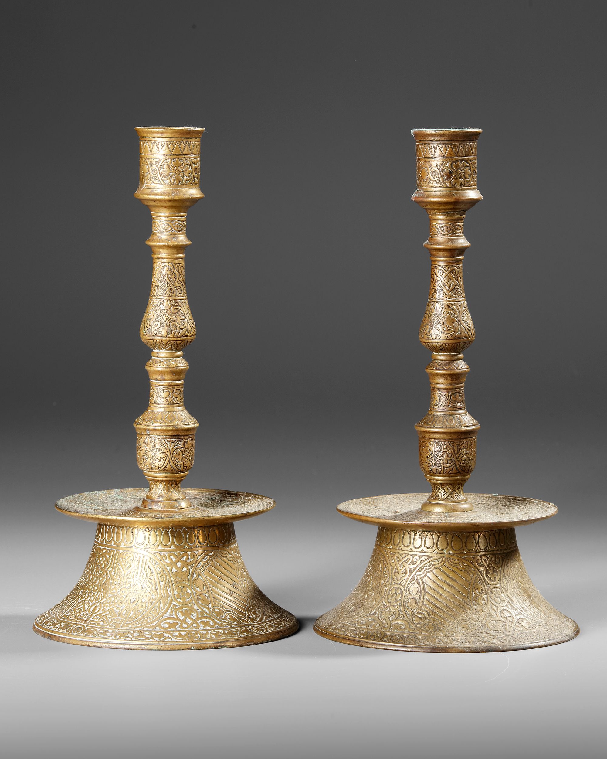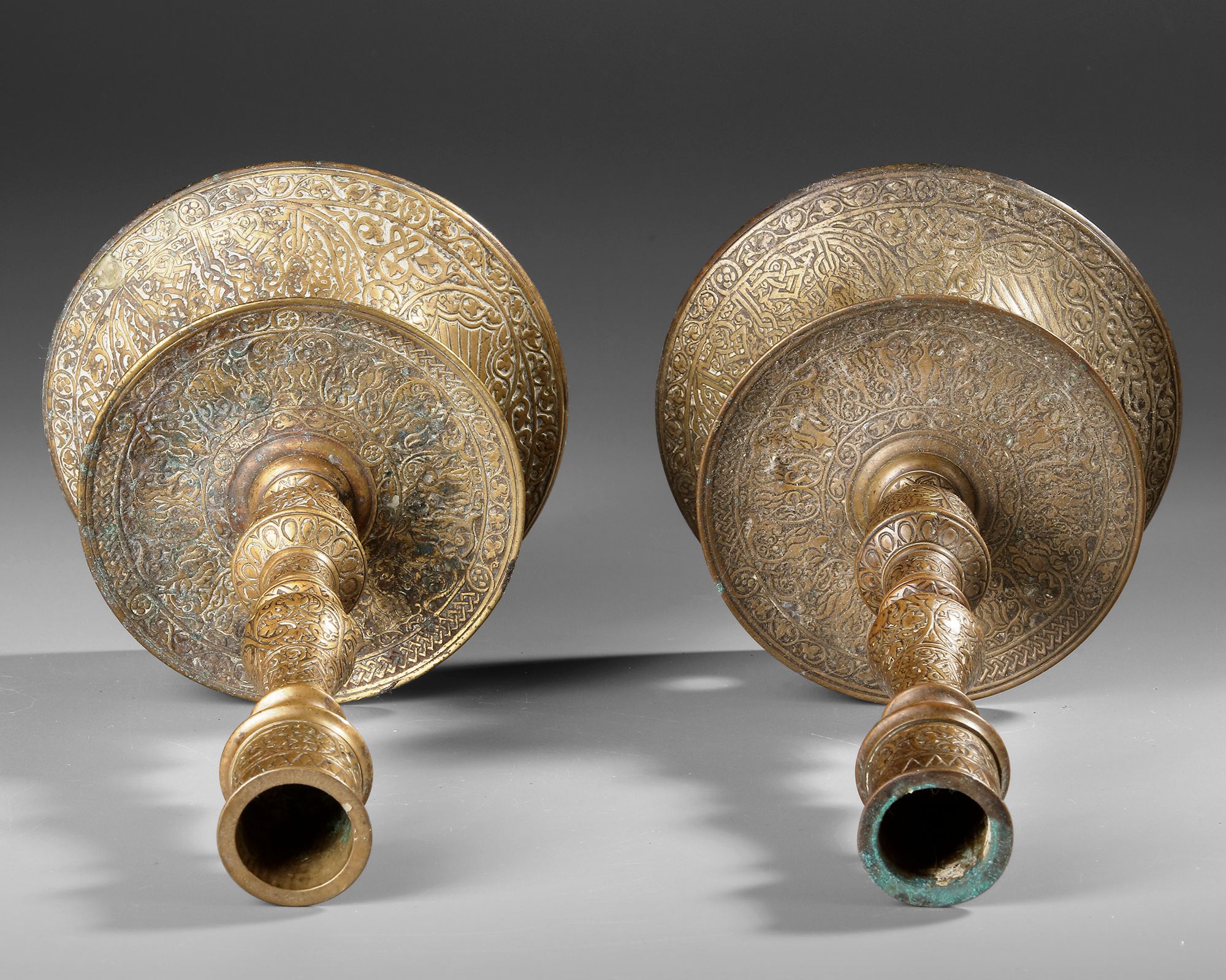 Elegant Ottoman brass candlesticks, finely engraved with floral and arabesque motifs, featuring flared bases and slender decorative stems H. 25 cm.