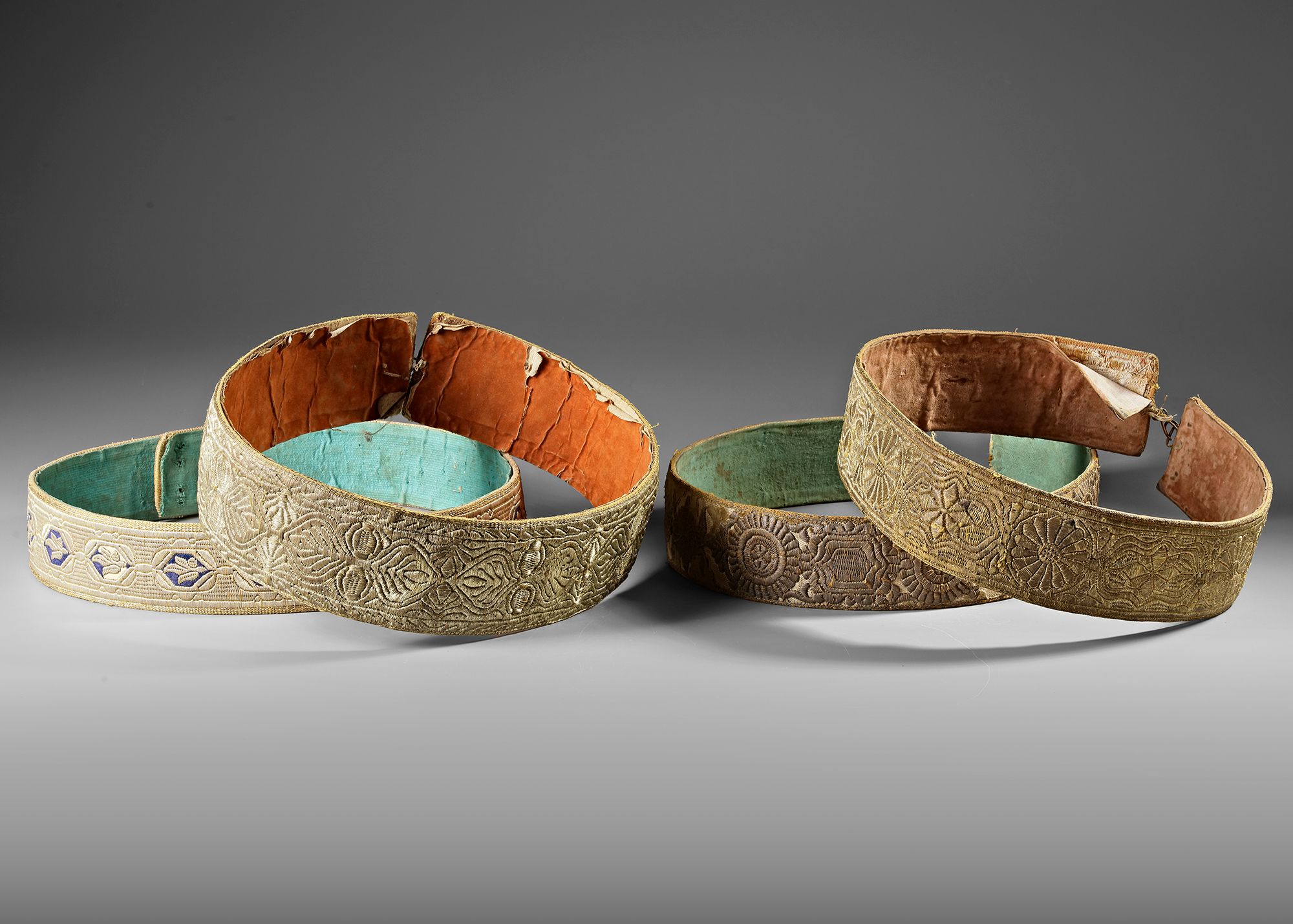 These four antique belts feature finely detailed hand-embroidery characteristic of 19th-century Yemeni craftsmanship. Each belt displays unique geometric and floral motifs worked in metallic thread on sturdy fabric bases, with interiors lined in vibrant colors such as turquoise and terracotta.