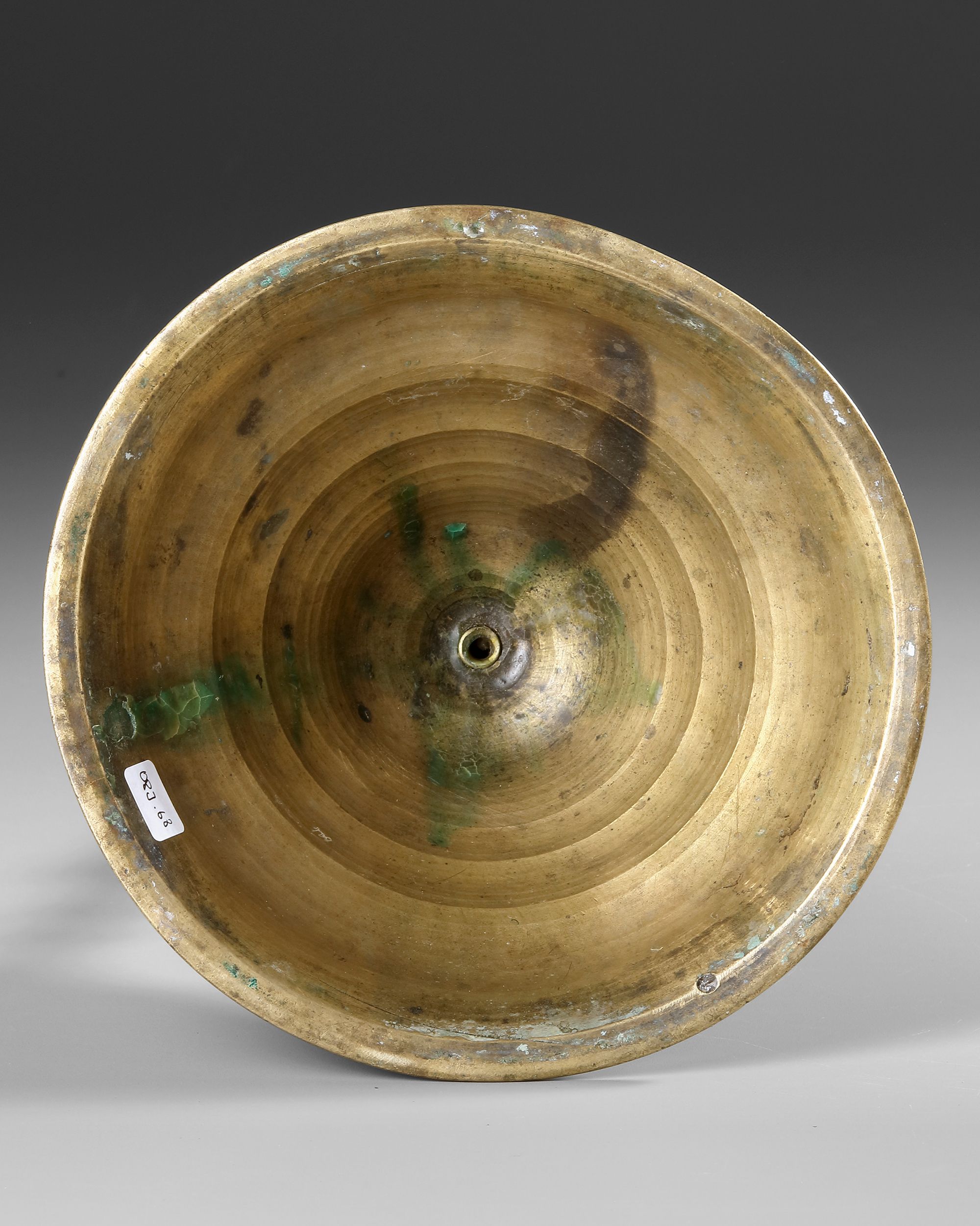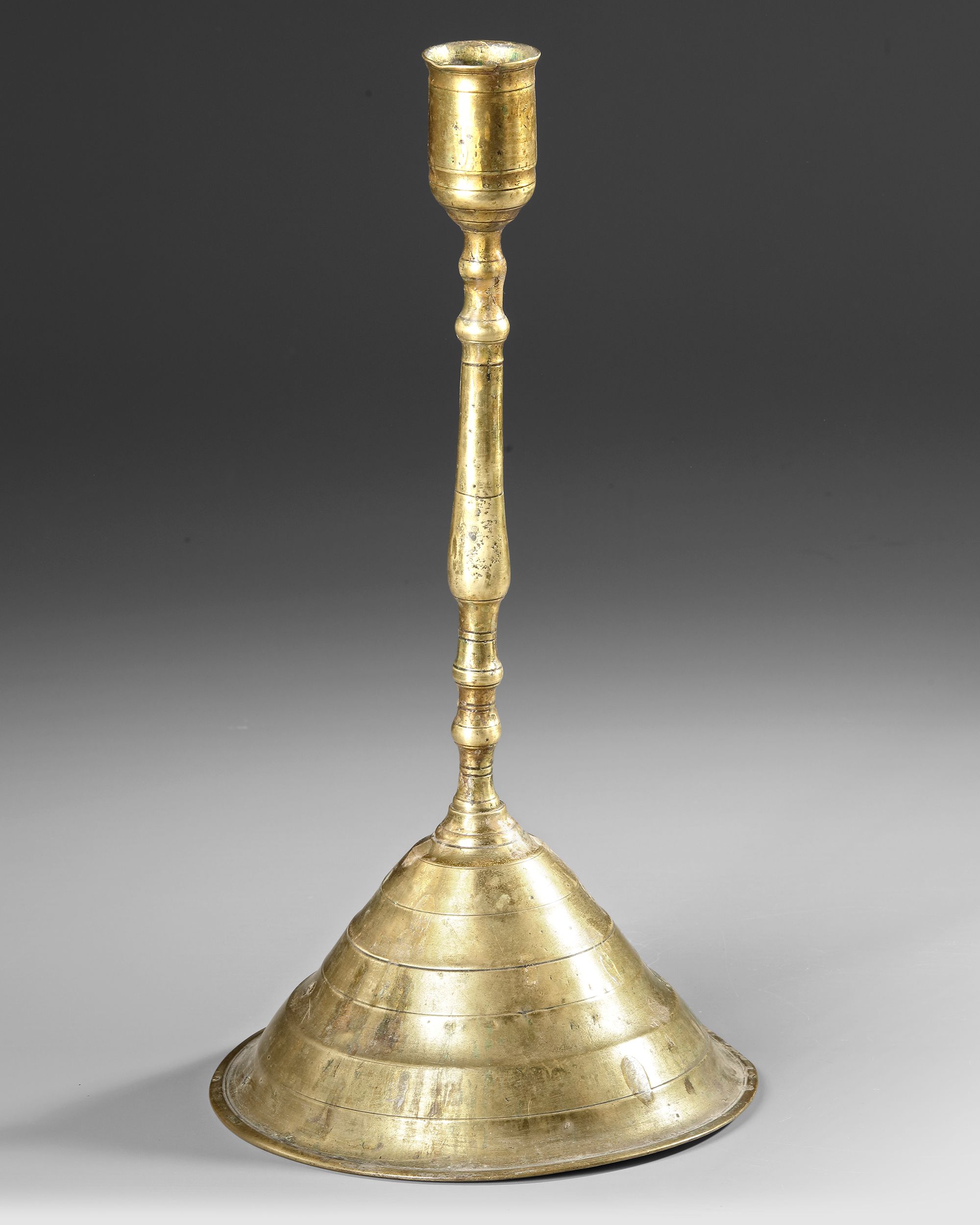 A tall, elegant Ottoman brass candlestick featuring a slender turned shaft and a broad tiered base. Heigth 37 cm.
