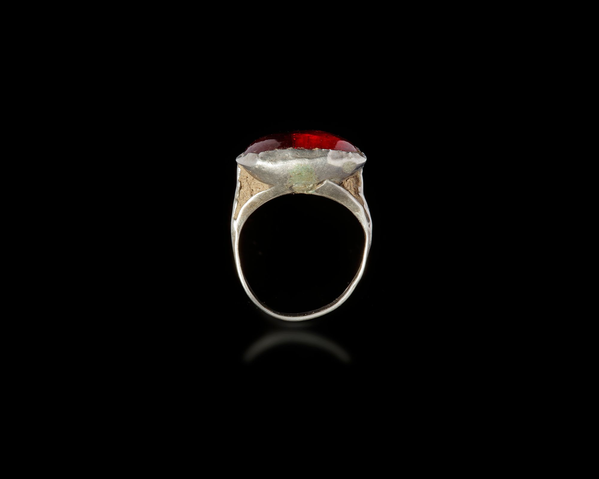 A ruby of rounded shape, set in silver ring. EU size 52, US size 6