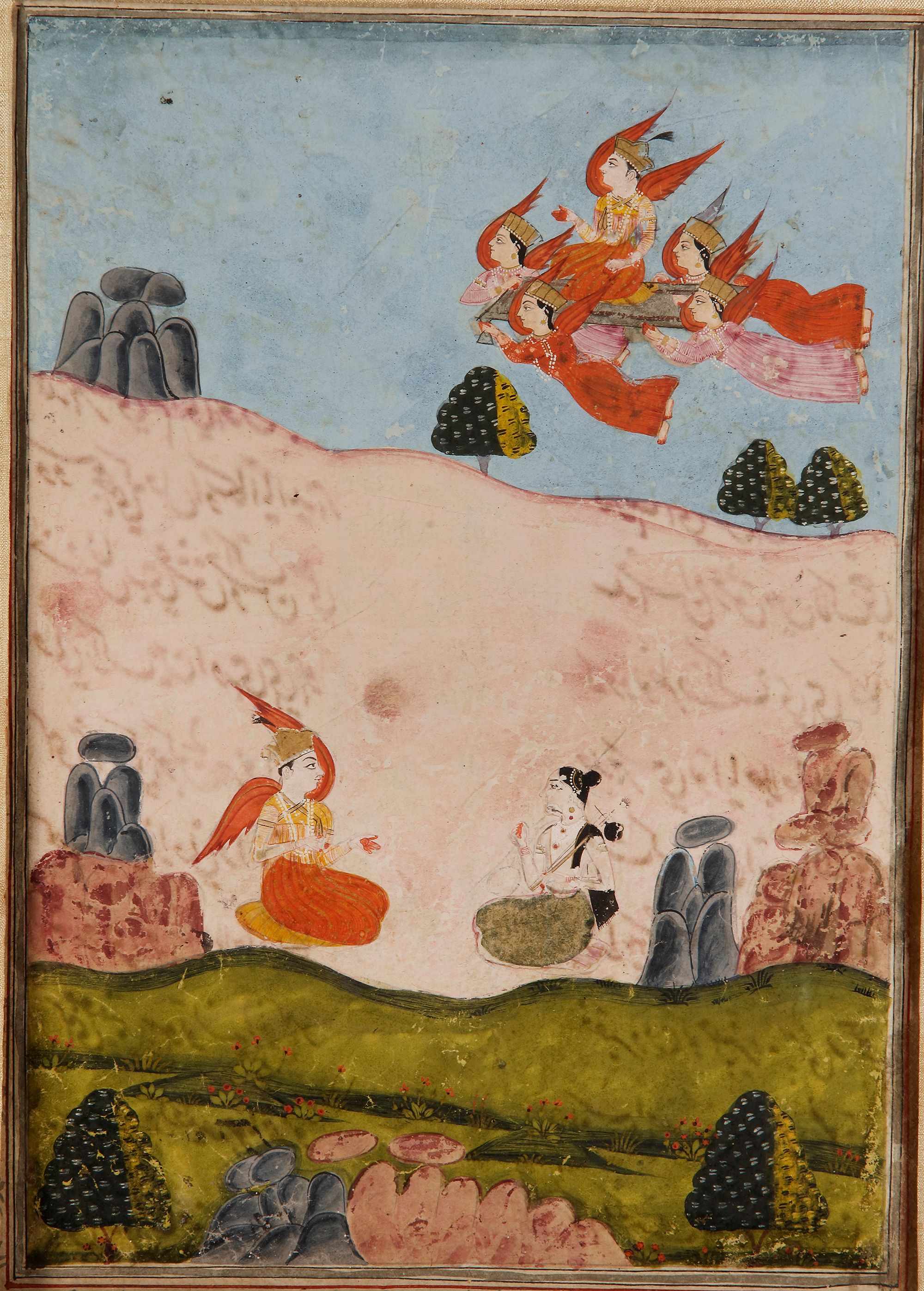 A delicate Indian miniature painting showing a mystical encounter between a seated deity-like figure and a devotee in a lush landscape, while celestial beings soar above on a flying chariot.