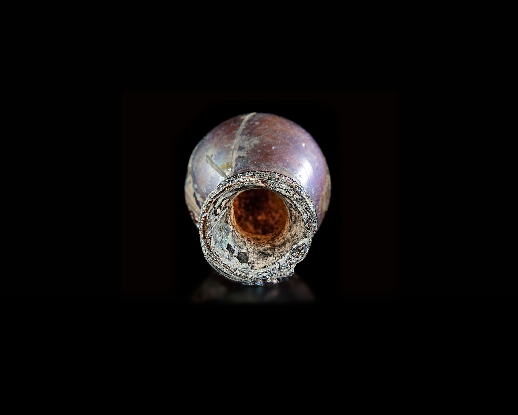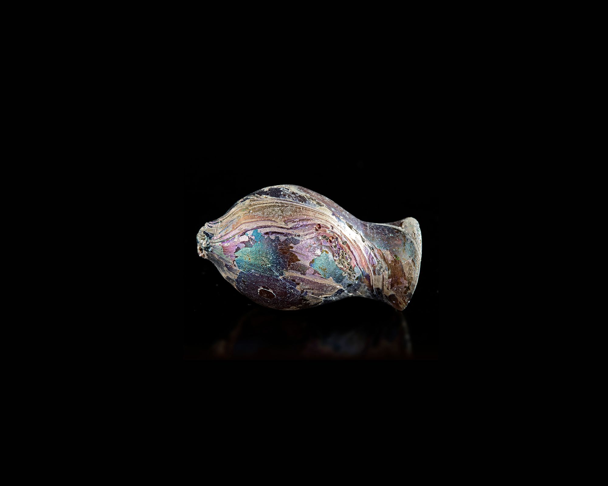 In highly iridescent brown translucent glass. Height 4.4 cm