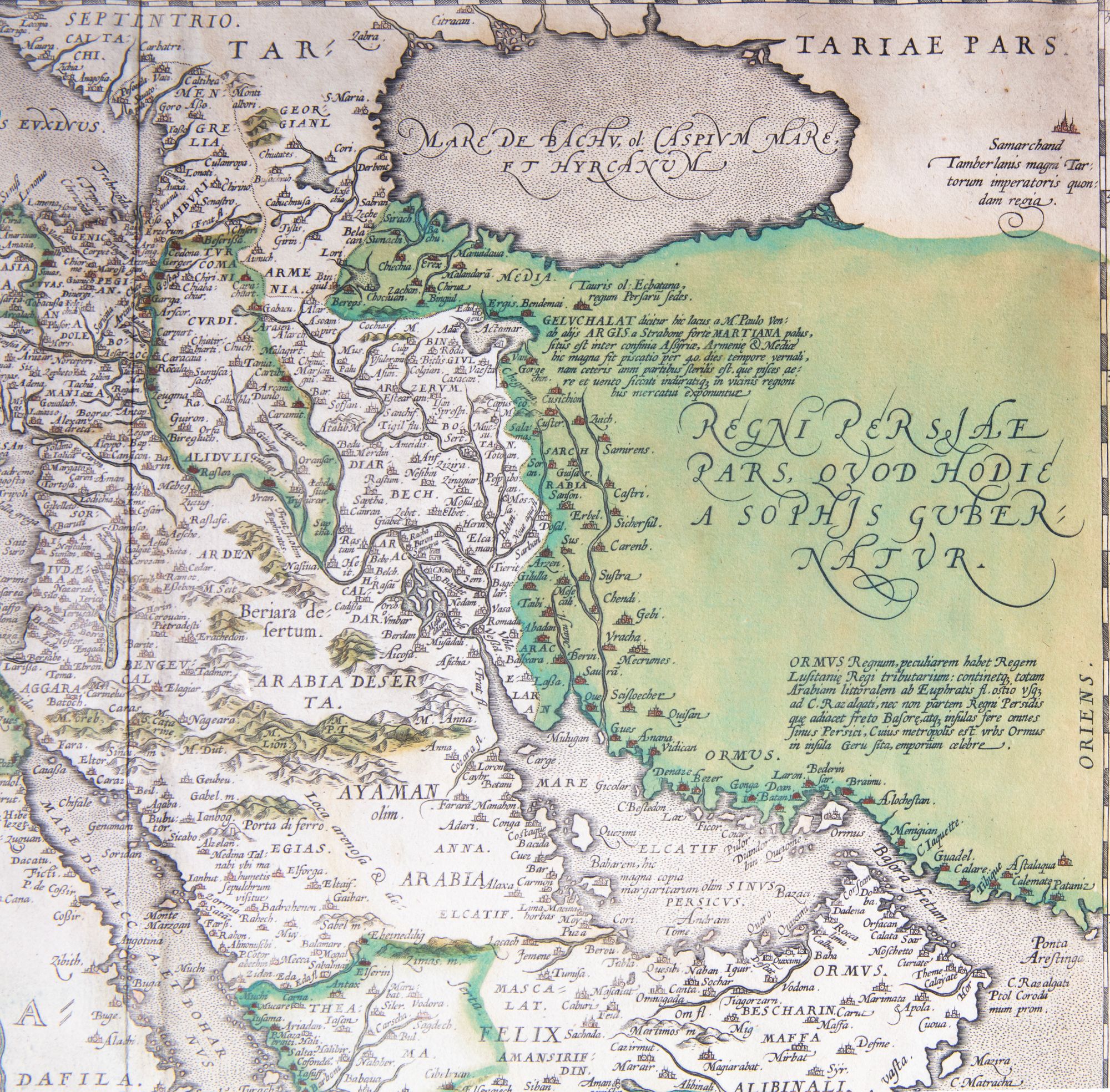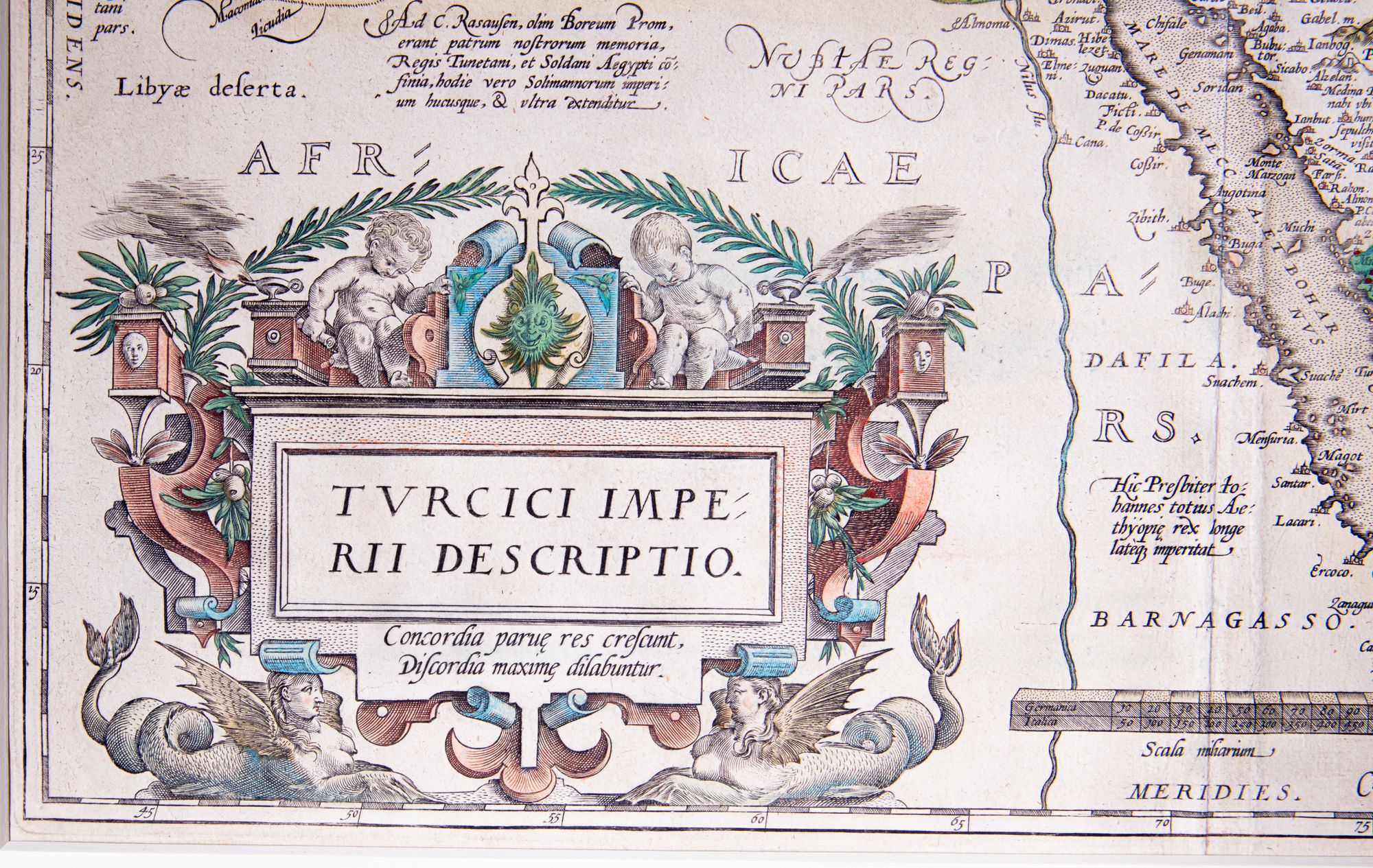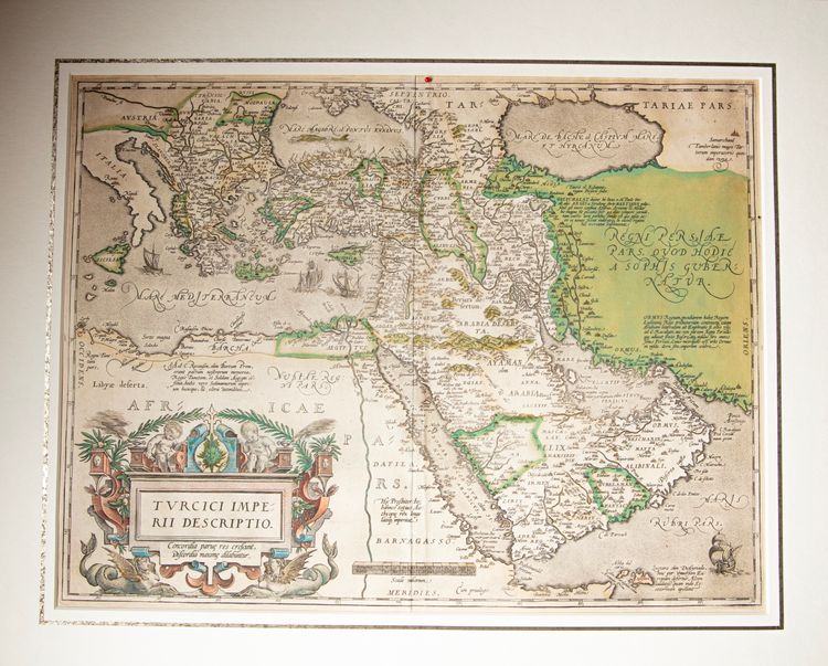 An elaborate map titled Turcici Imperii Descriptio, illustrating the vast territories of the Ottoman Empire across southeastern Europe, Anatolia, the Middle East, and North Africa. Richly hand-colored and ornamented, it reflects European cartographic artistry and contemporary understanding of Ottoman imperial power and geography. 55 by 42 cm.
