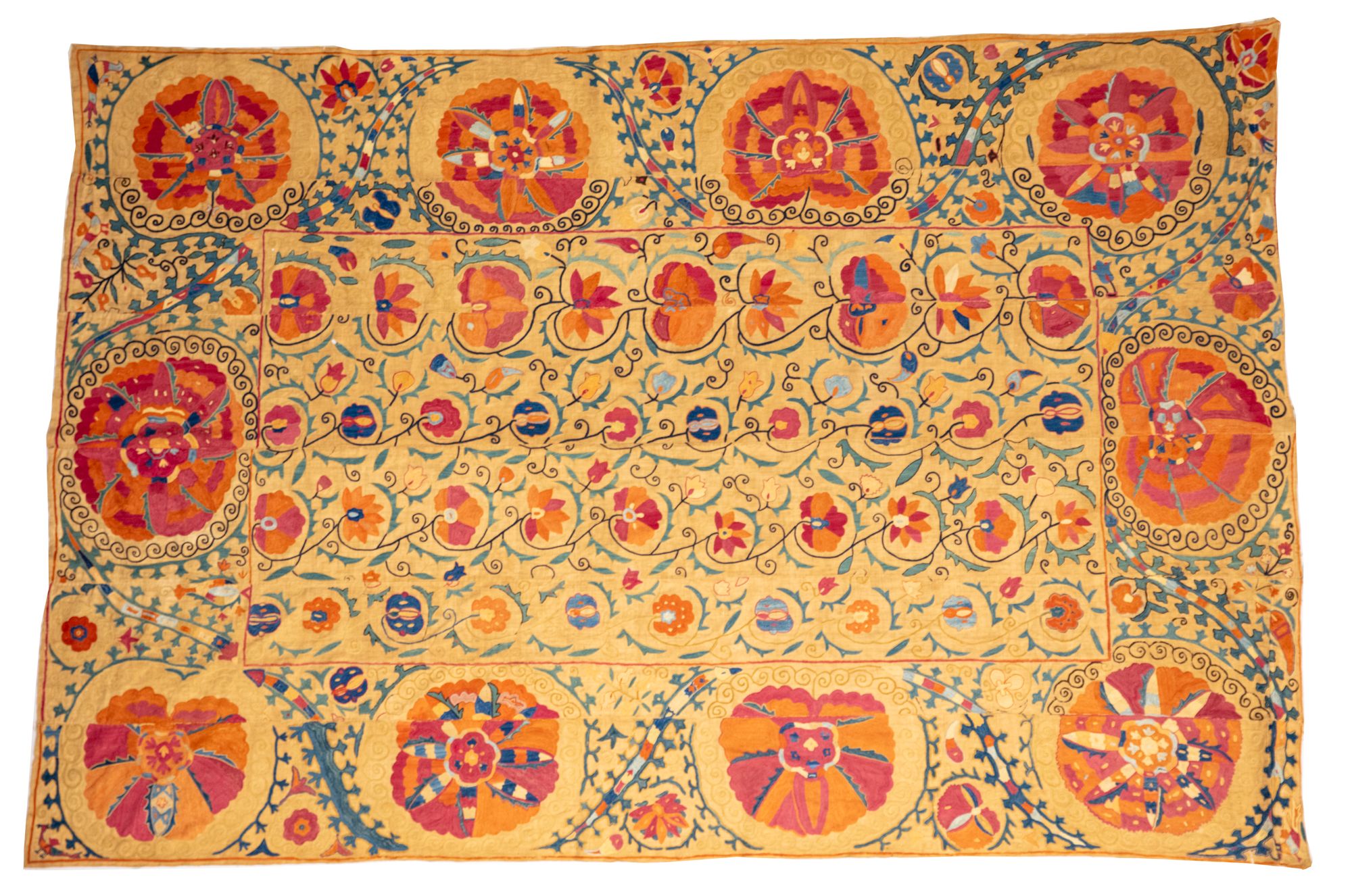 A magnificent Bokhara suzani presenting a very dense field design. The Flower -shaped medallion in the central axis barely stand out from the wealth of flowering shrubs pointing in different directions.