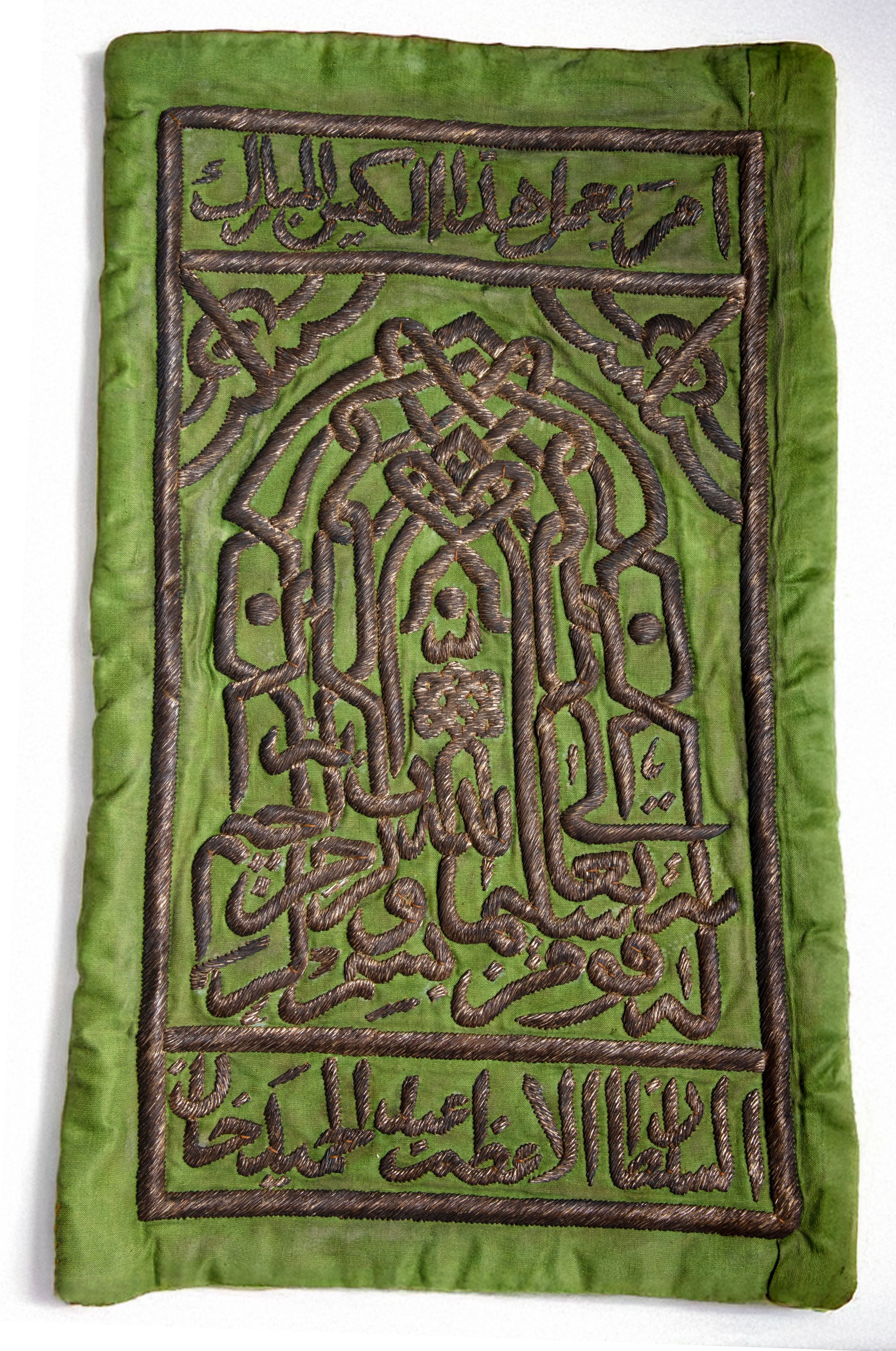 Rectangular in shape, consisting of two green velvet panels stitched together. Each side is heavily decorated with lush silver-plated thread surrounding inscriptions in Thuluth script of Qur’an 27, Surah Al-Naml, verse 30, and Qur’an 4, Surah Al-Nisa, verse 58. It was made by order of the Ottoman Sultan Abdul Hamid II and later renewed by order of Hussain Pasha in 1328 AH.