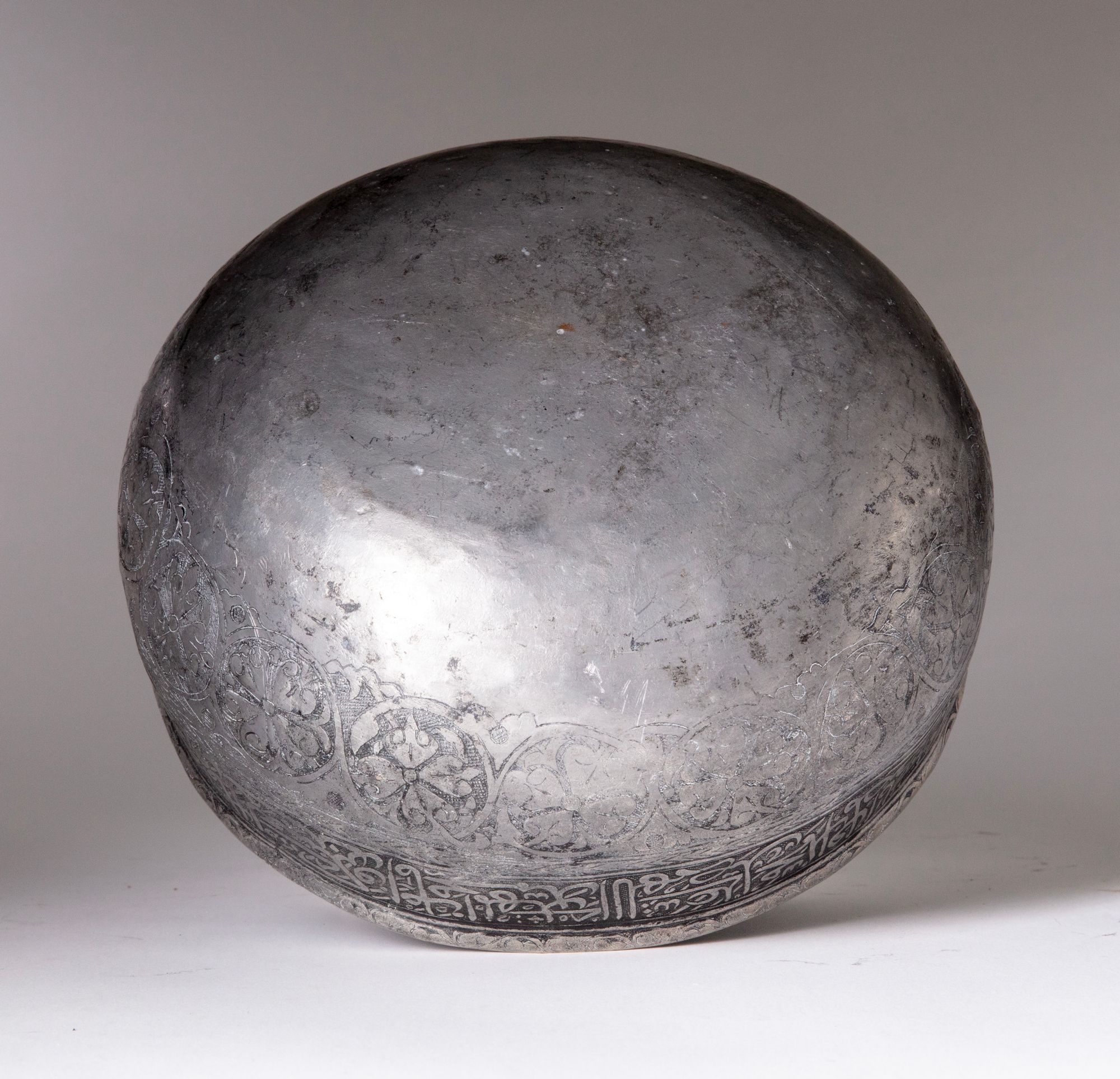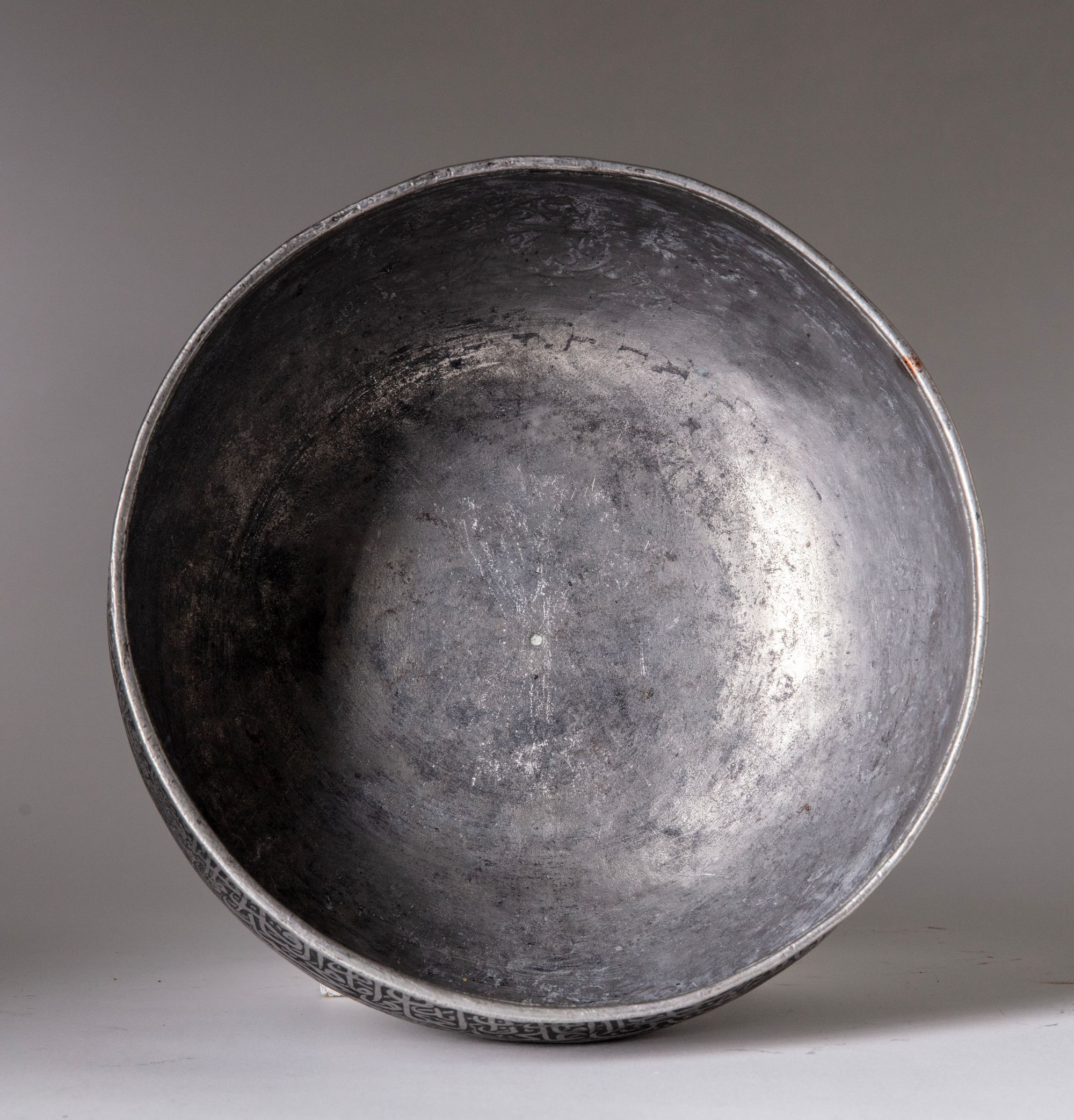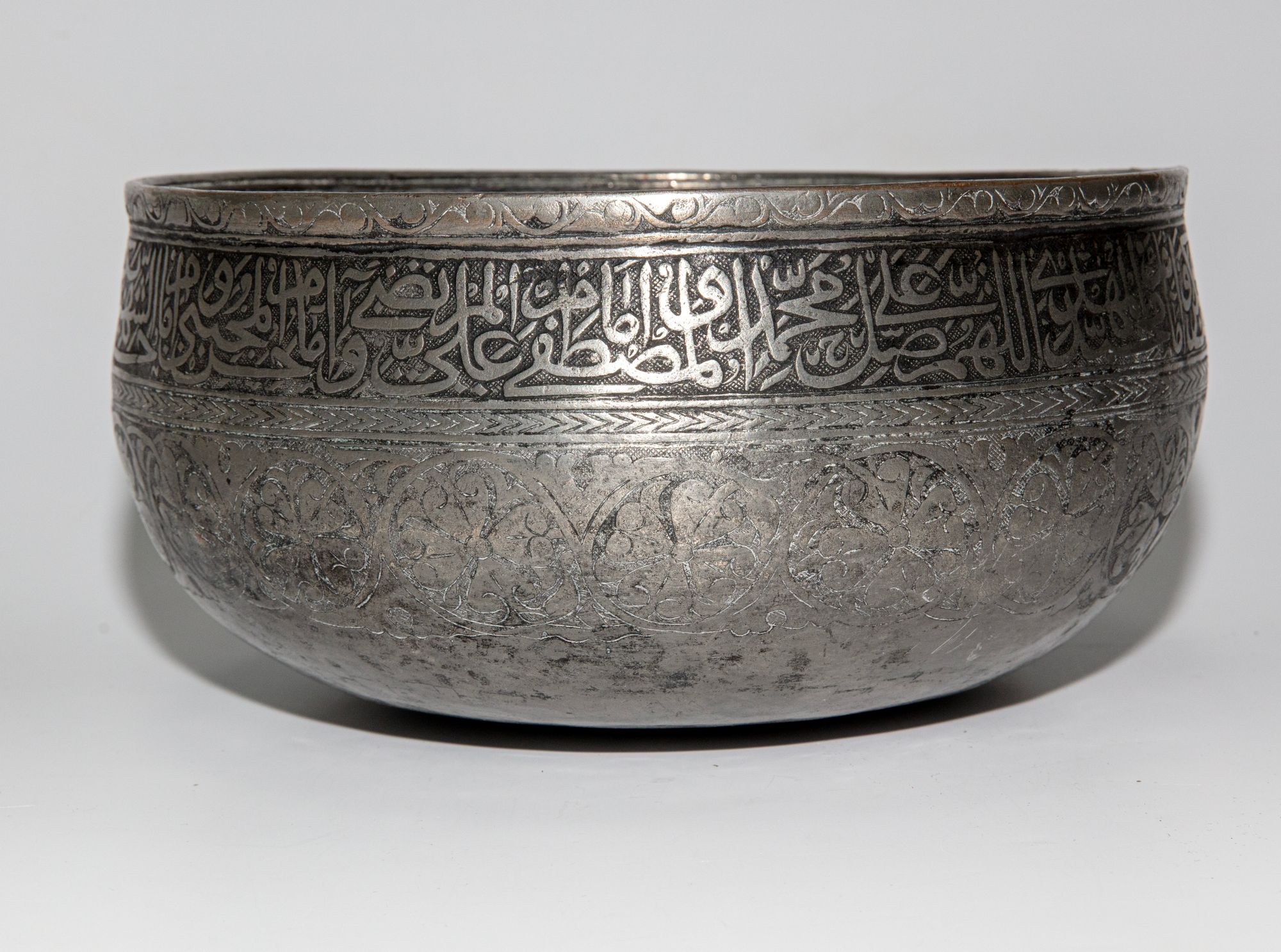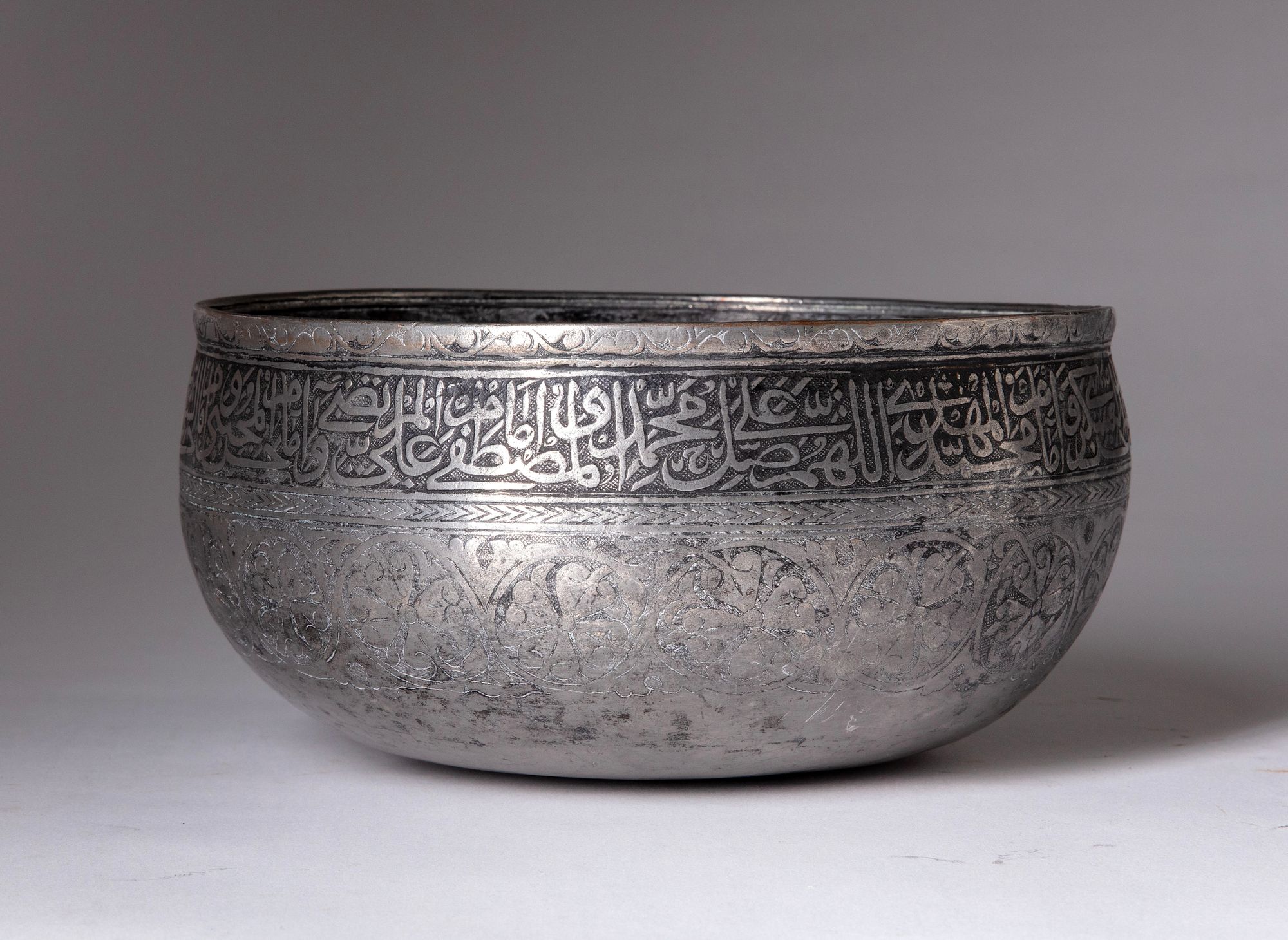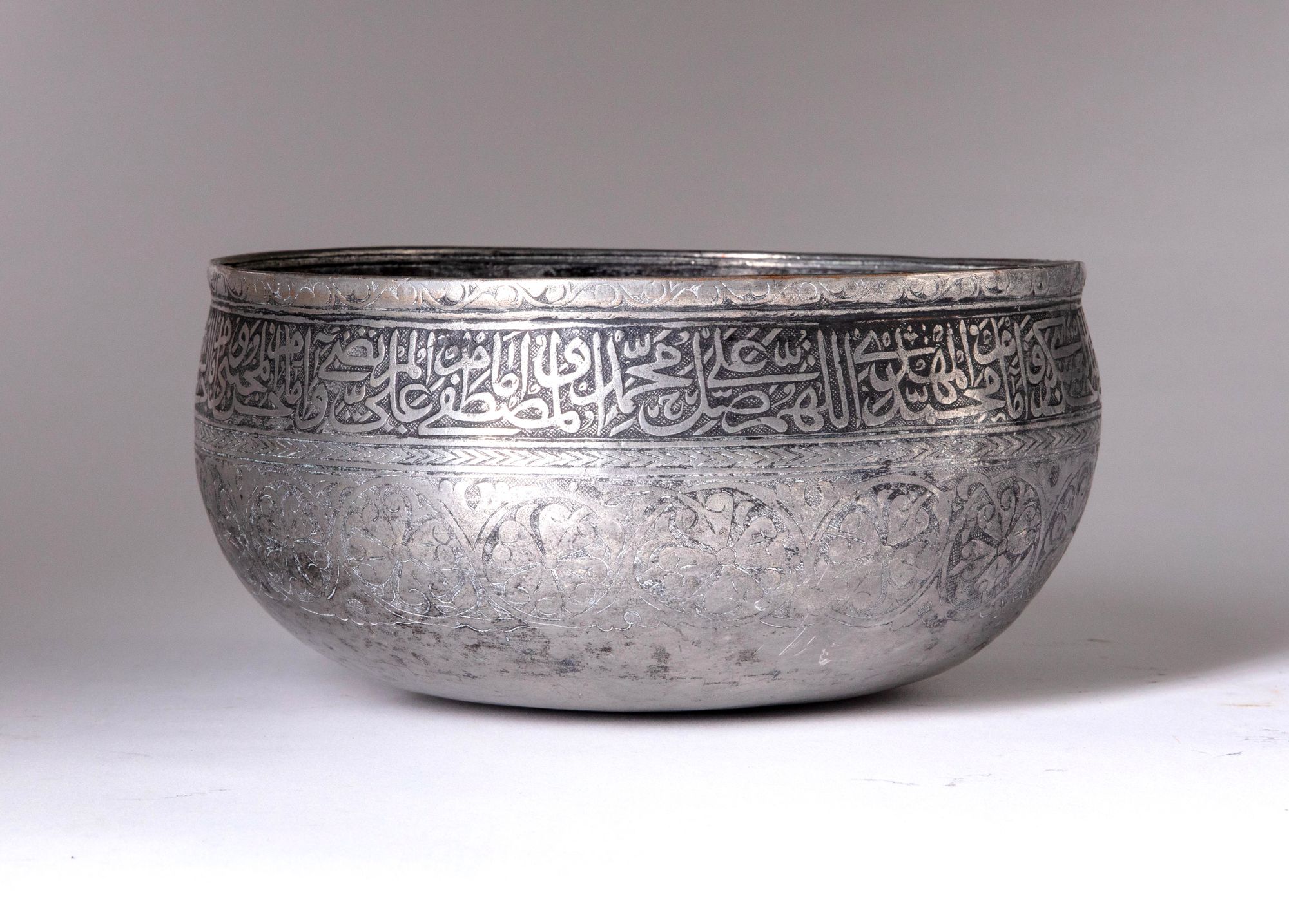 A refined Timurid-period metal bowl dating to the 14th century, finely engraved with elegant Arabic calligraphy around the rim and scrolling vegetal motifs across the body.