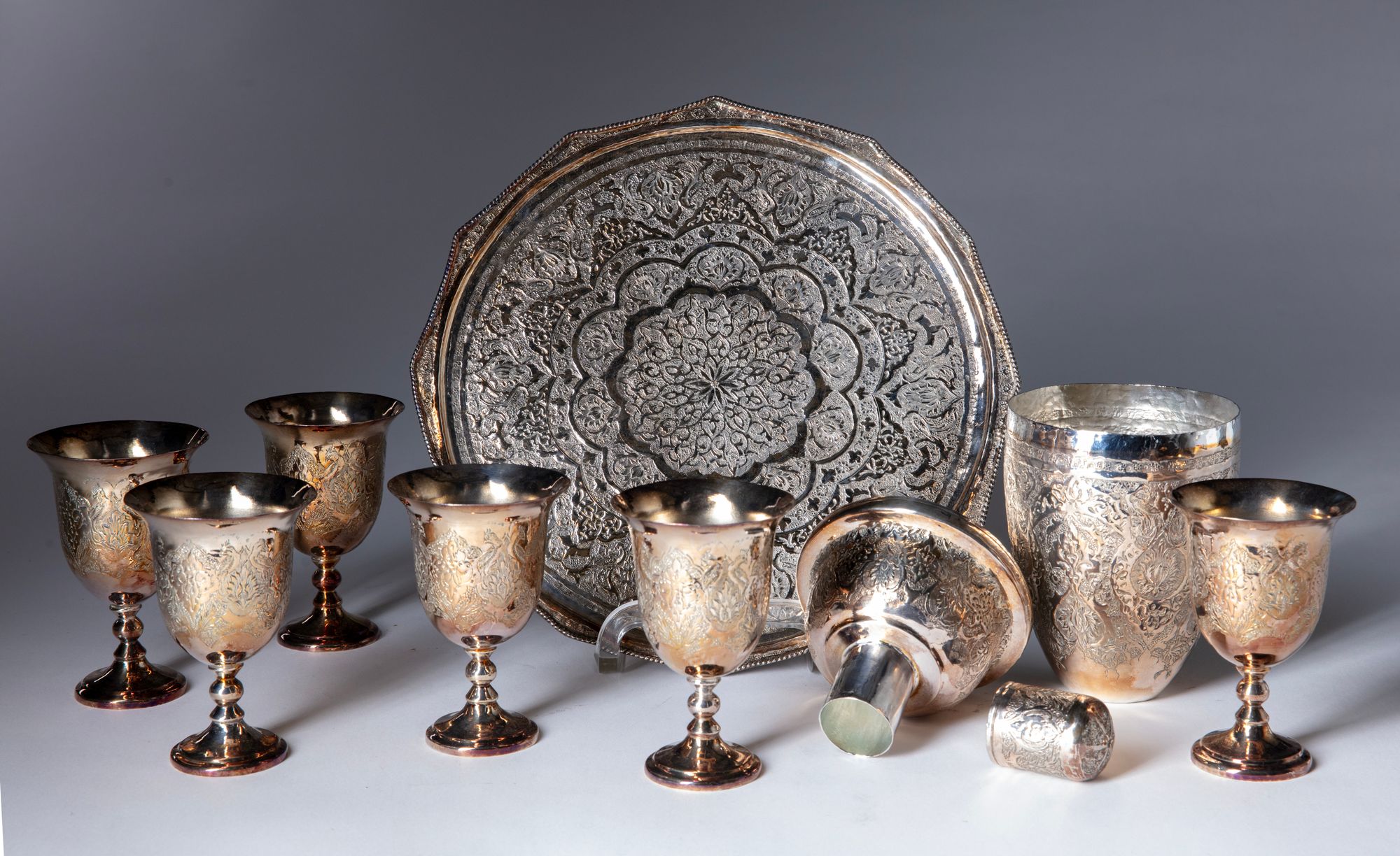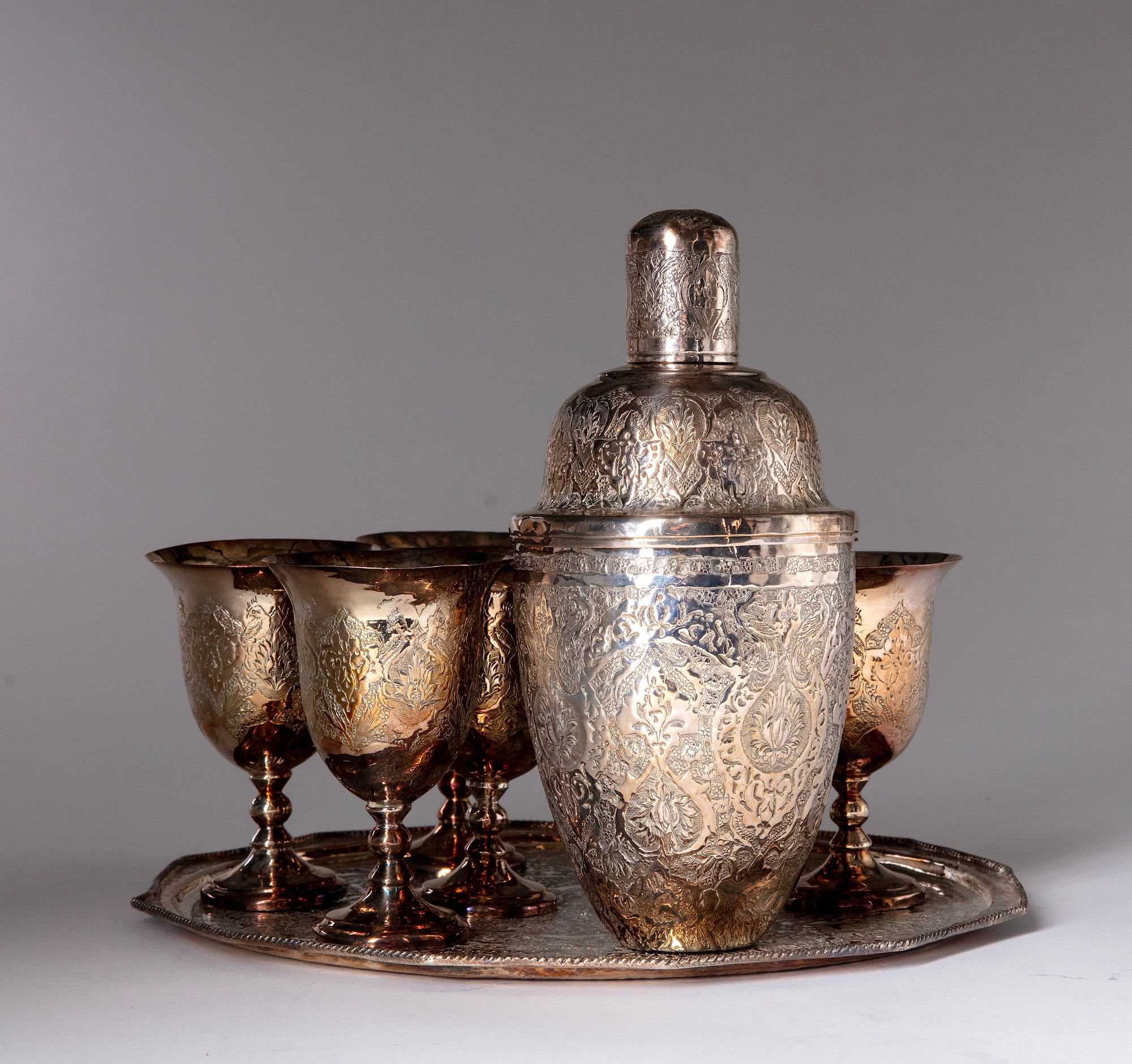Tray D. 27 cm. Cups H. 11 cm. Cocktail shaker H. 22 cm.