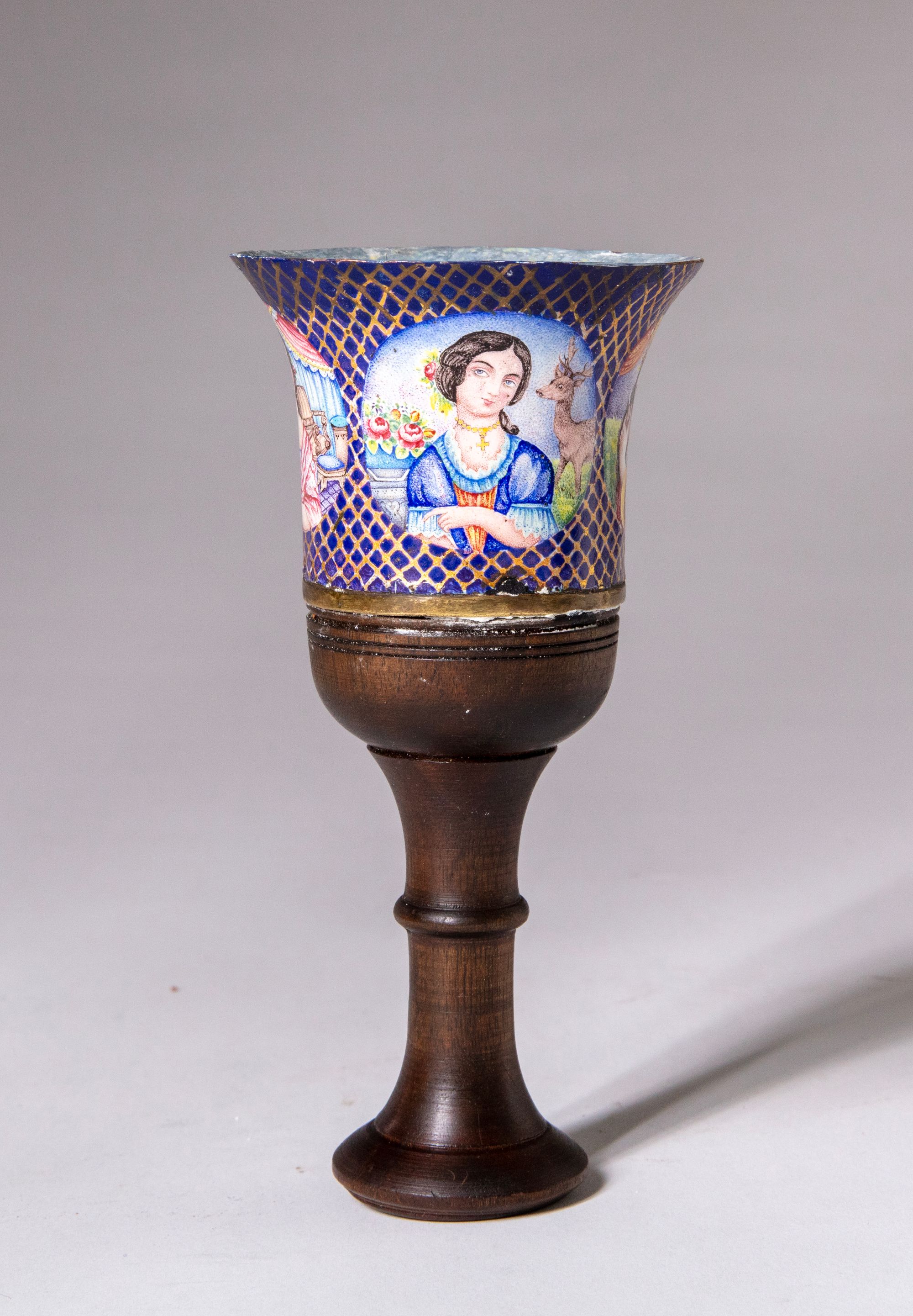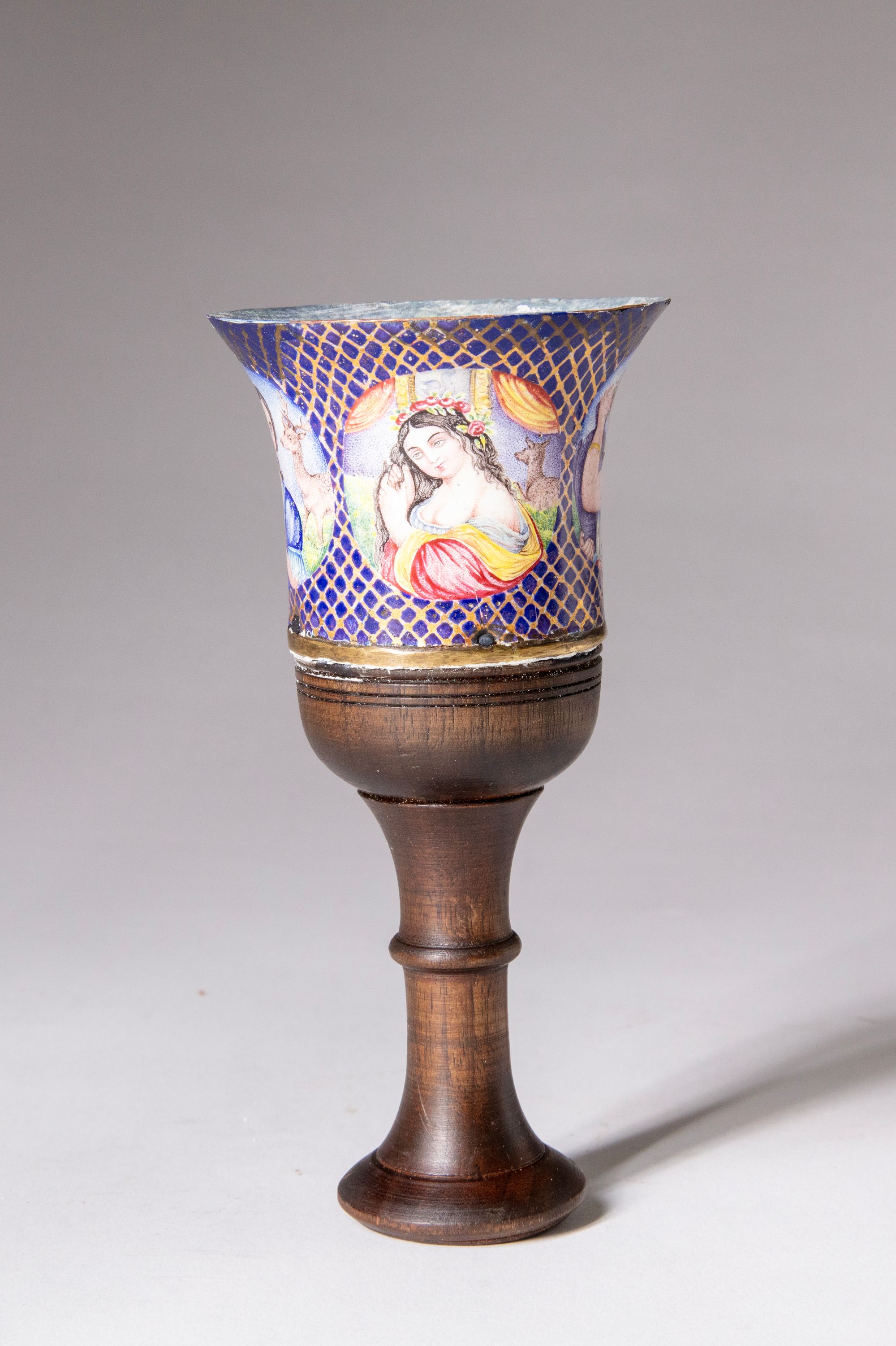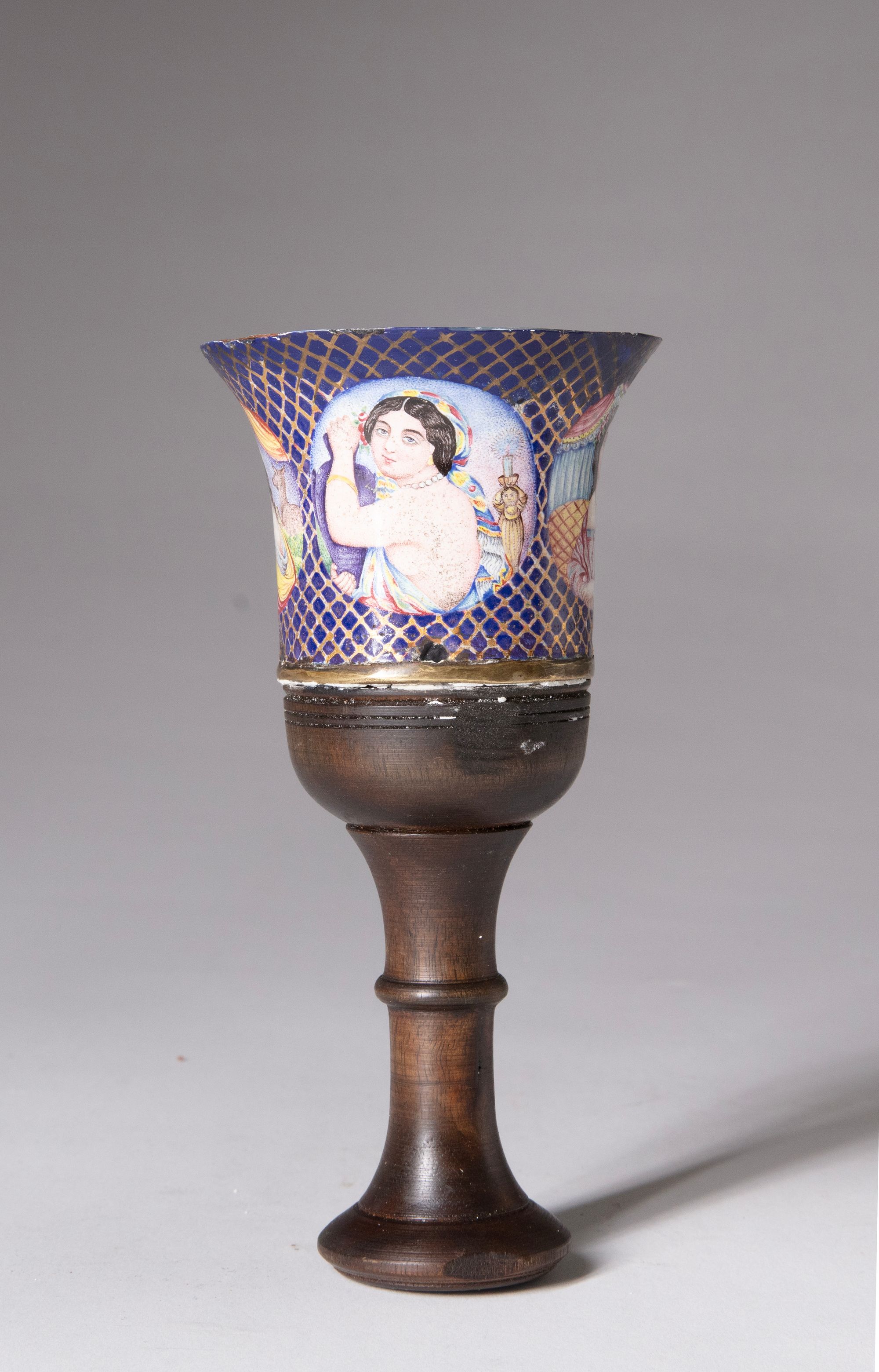A Qajar polychrome enamelled ghalian cup with painted figural scenes set against a deep blue ground with gilt lattice decoration, mounted on a turned wooden stem.