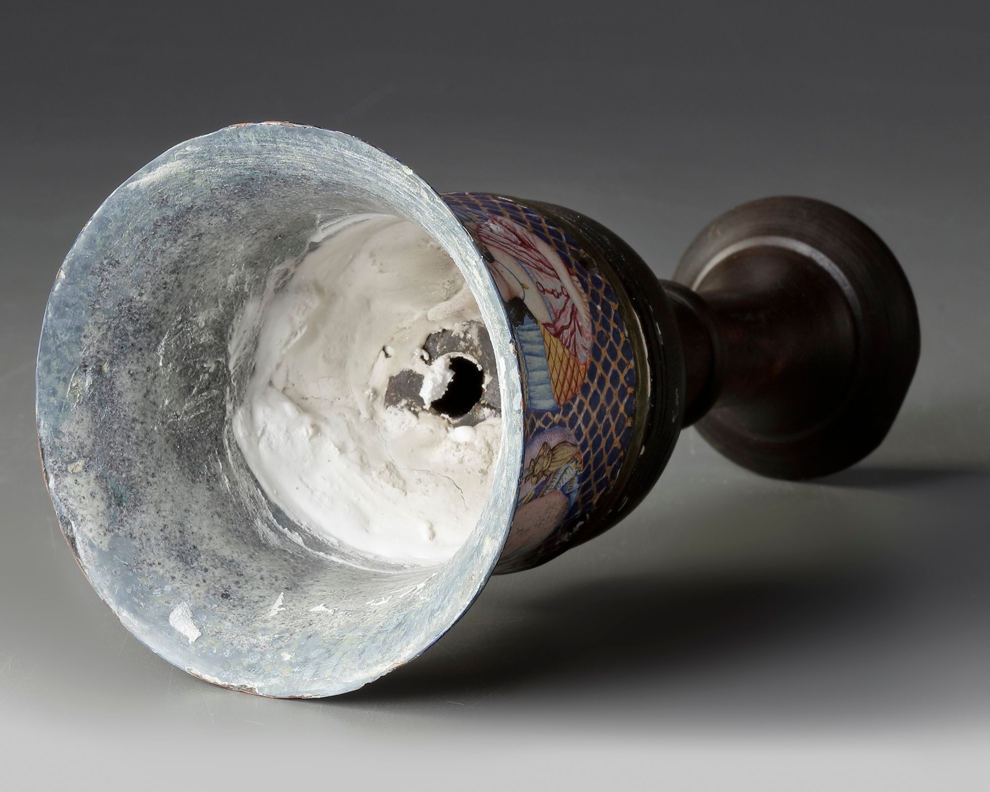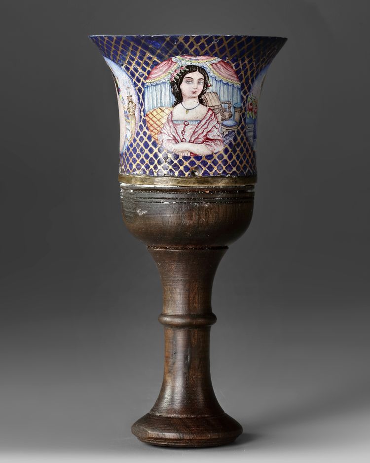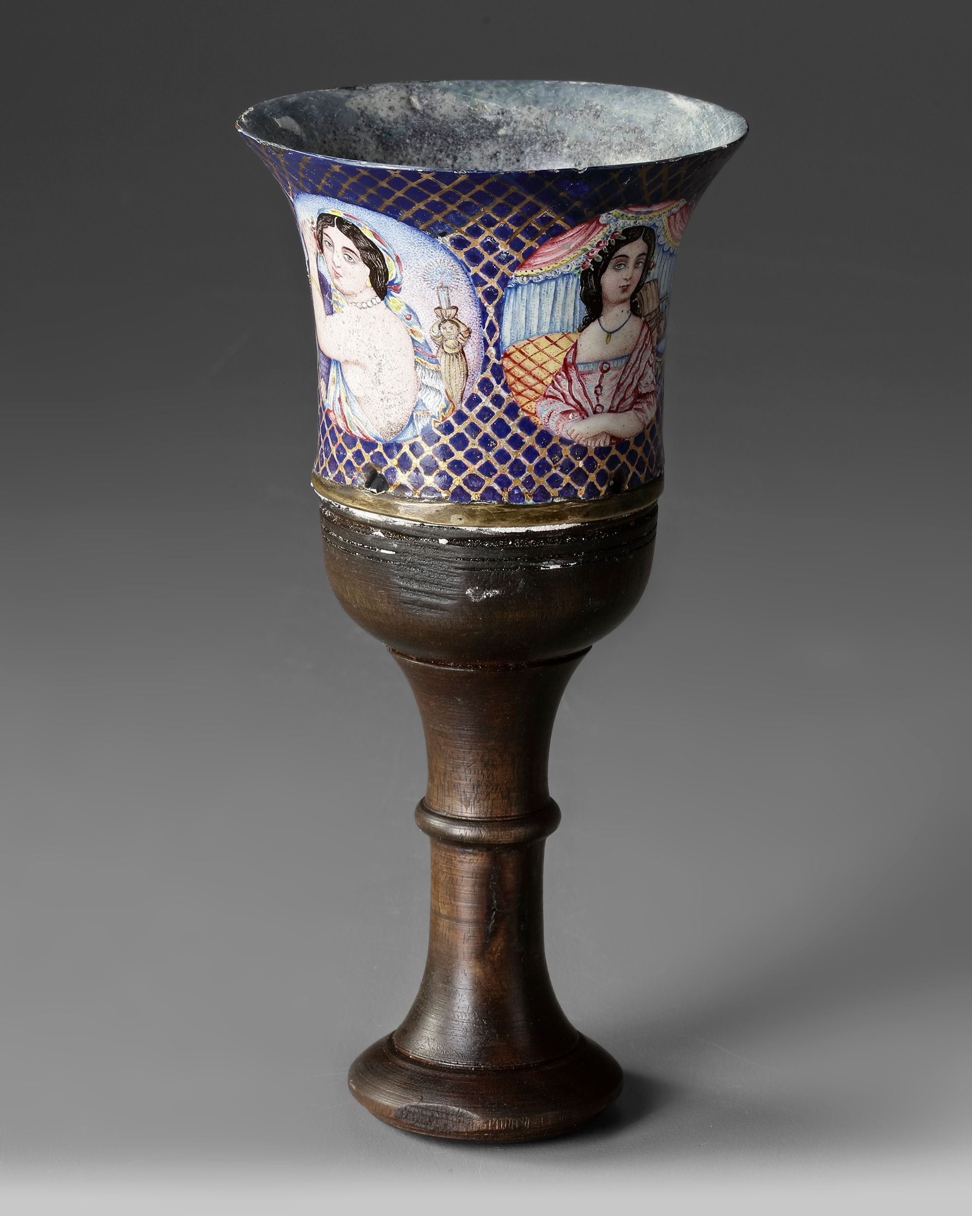 Ottoman polychrome enamelled ghalian cup with painted figural scenes set against a deep blue ground with gilt lattice decoration, mounted on a turned wooden stem.