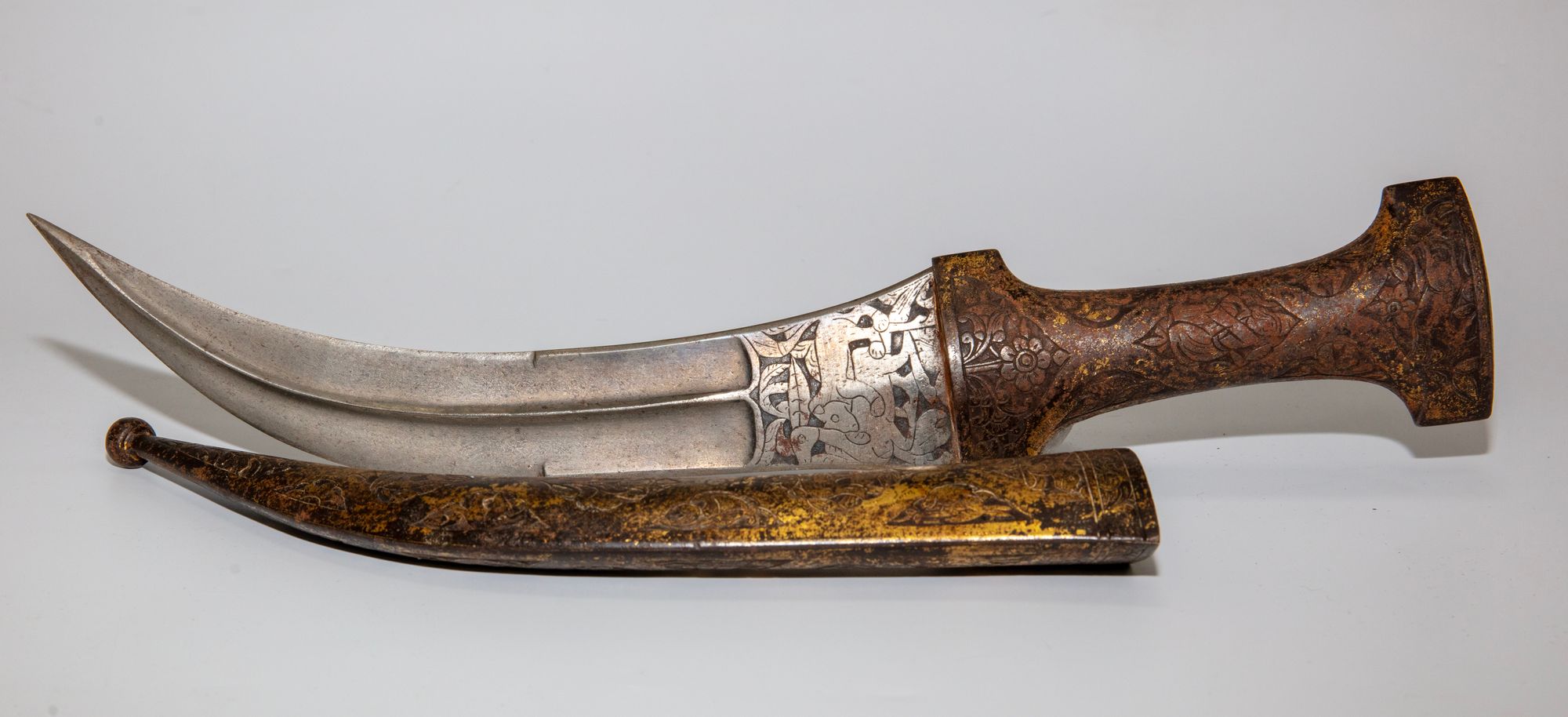 A beautifully crafted 18th-century Persian dagger featuring a curved blade and richly gilded hilt and scabbard with floral and animal motifs.