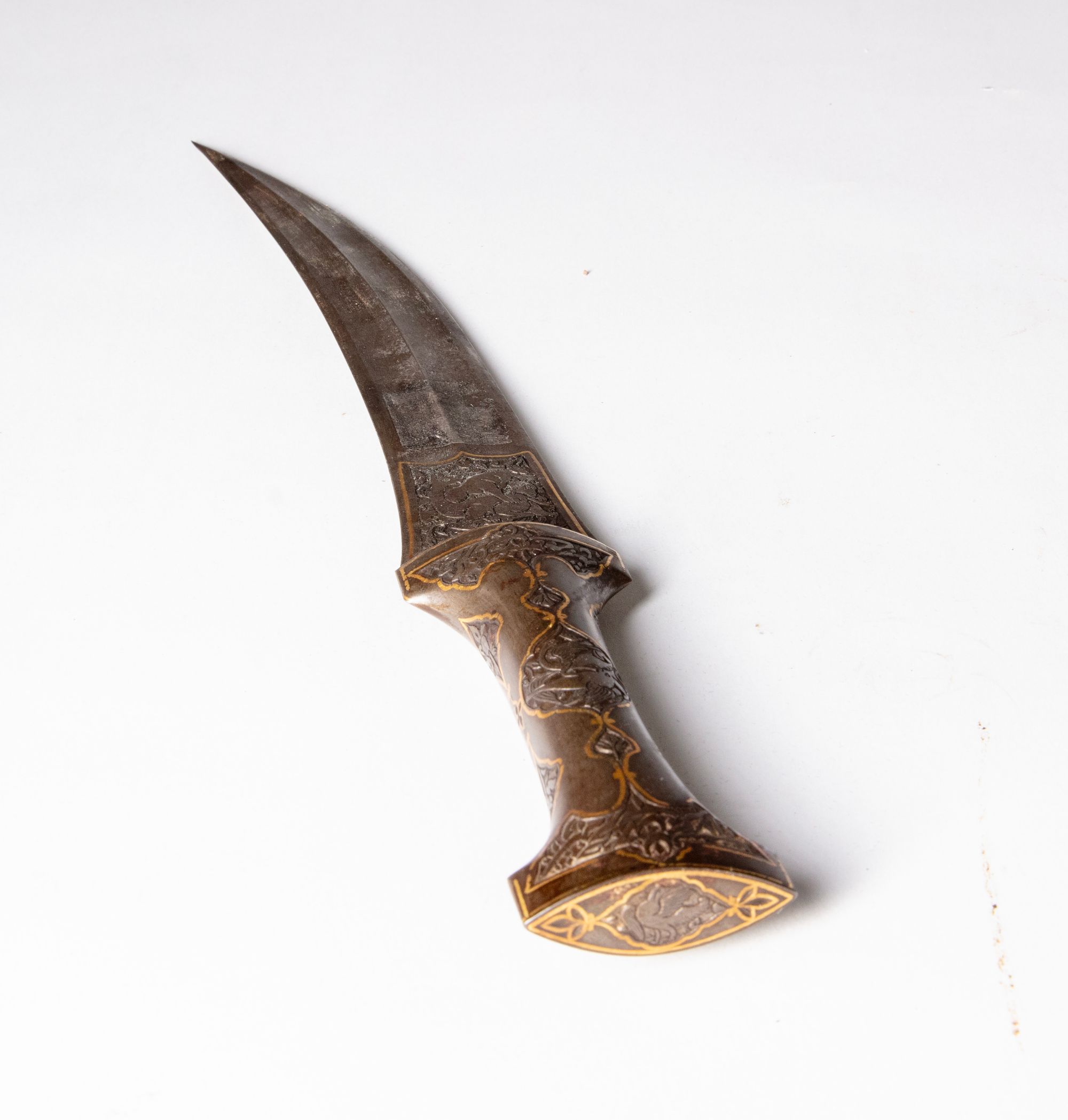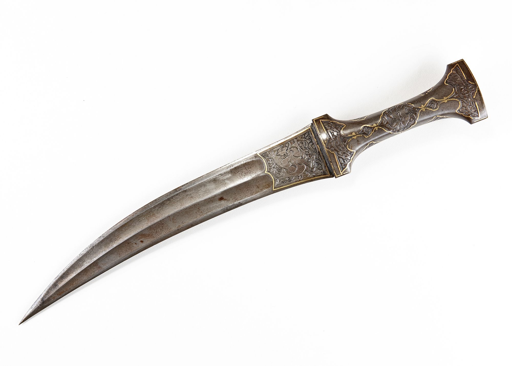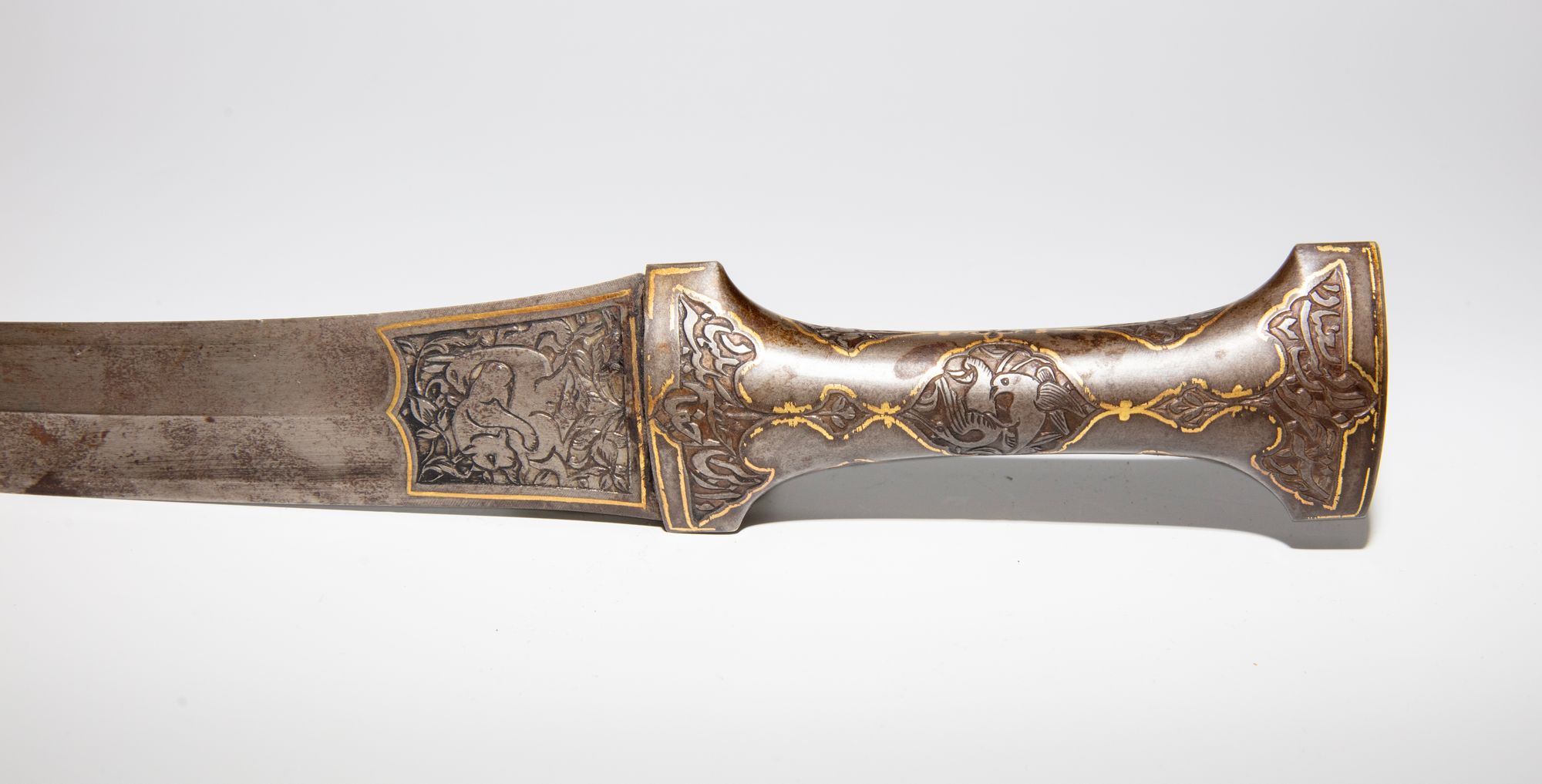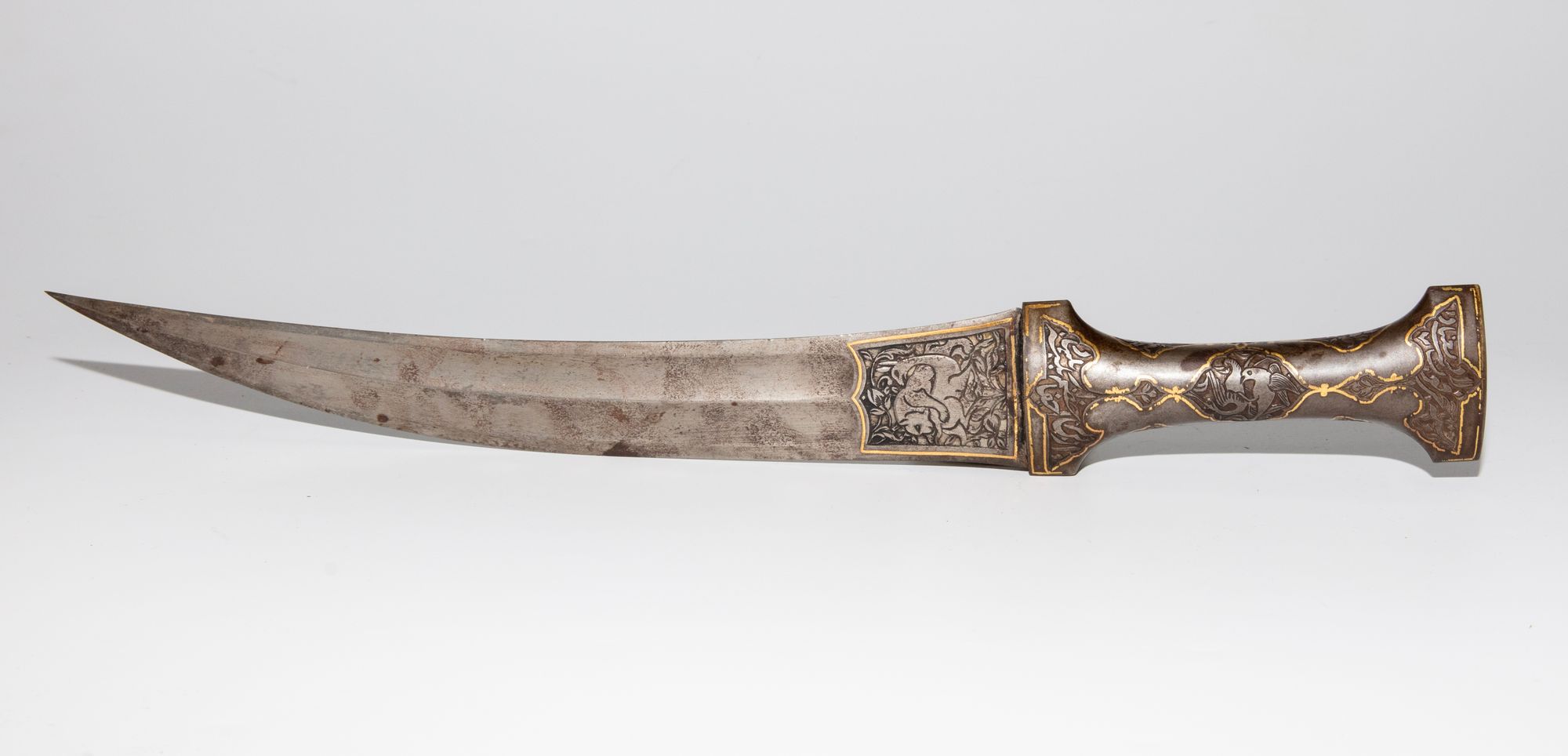 A finely forged Persian dagger with a slightly curved steel blade, the forte engraved with figural decoration framed by elegant calligraphy. The hilt is richly ornamented with scrolling vegetal and animal motifs, heightened with gold inlay.