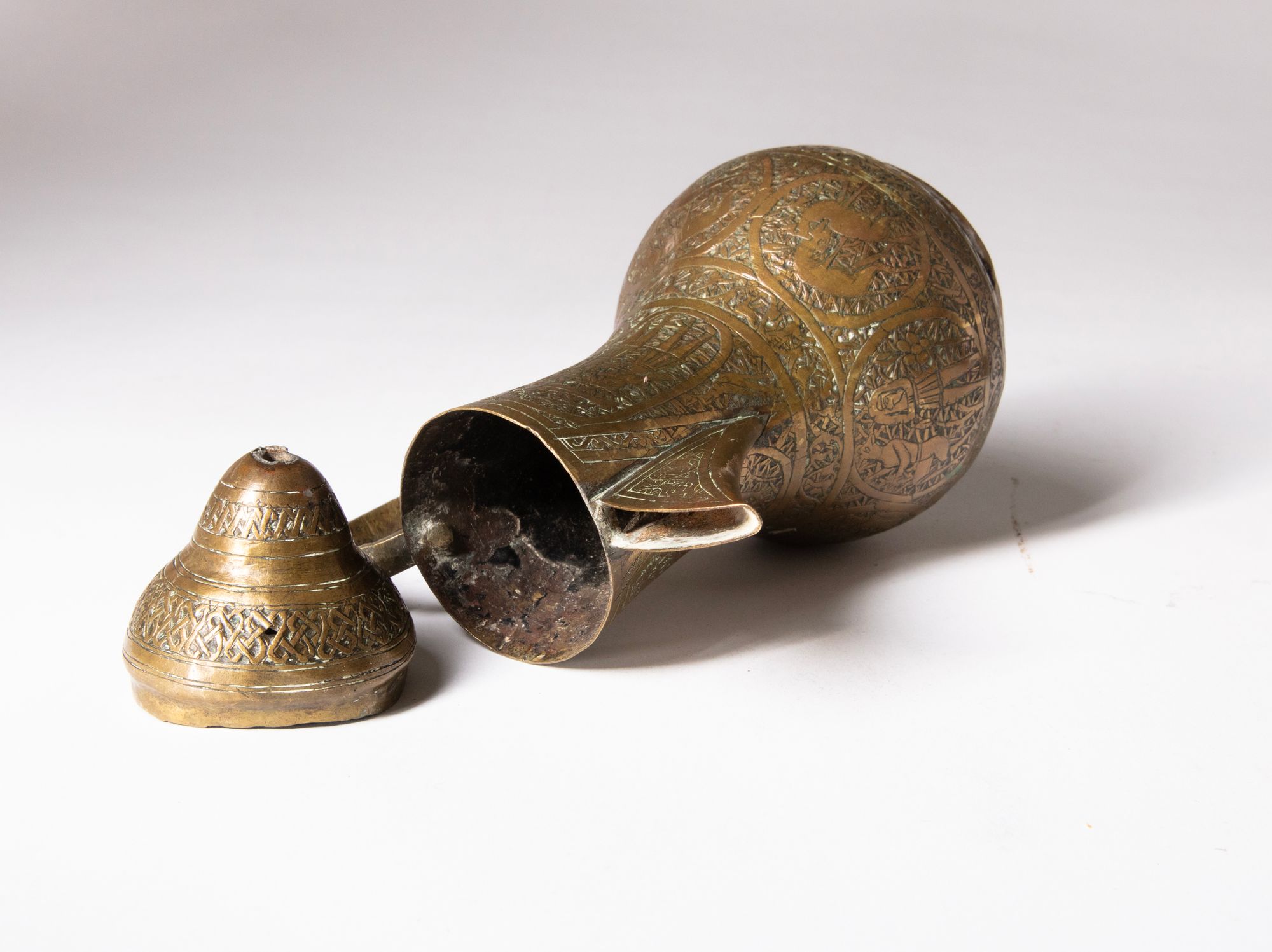 A finely crafted Persian dallah from the Zand dynasty, made of brass and richly engraved throughout with scrolling vegetal and geometric motifs.