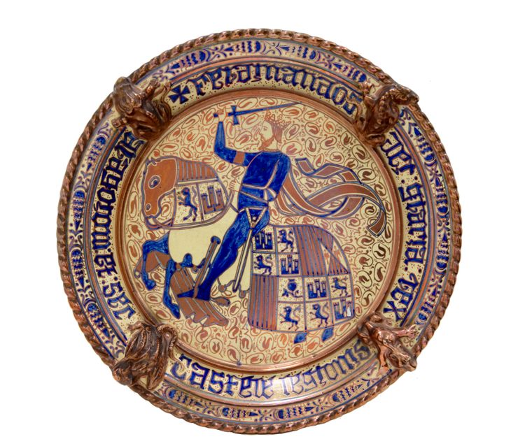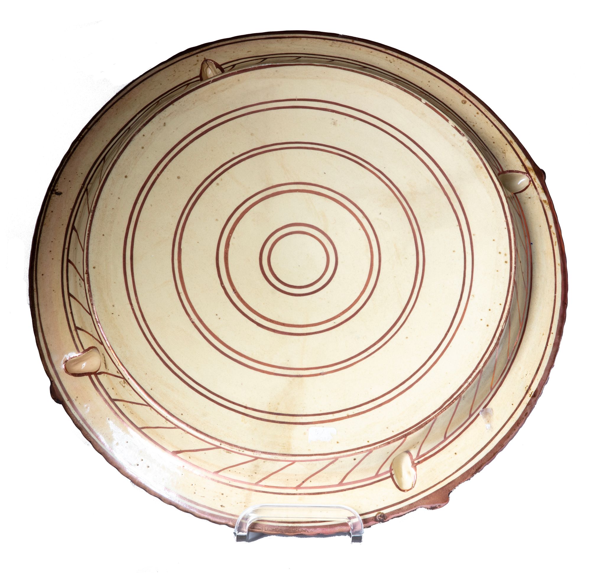A hispano-moresque ceramic charger with a pale glazed surface, decorated with concentric circular lines and simple applied motifs. D. 47 cm.